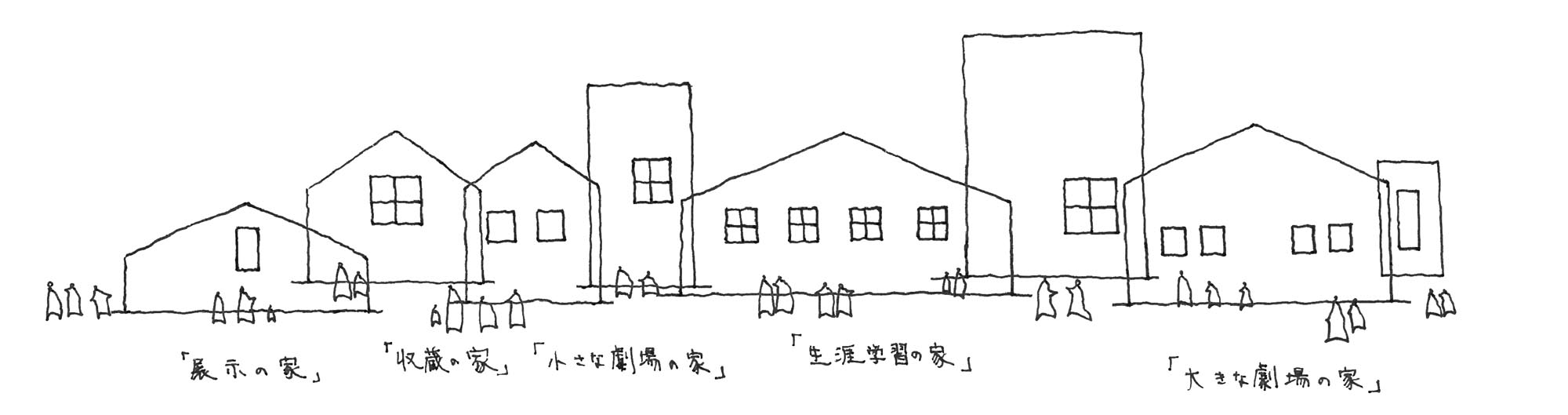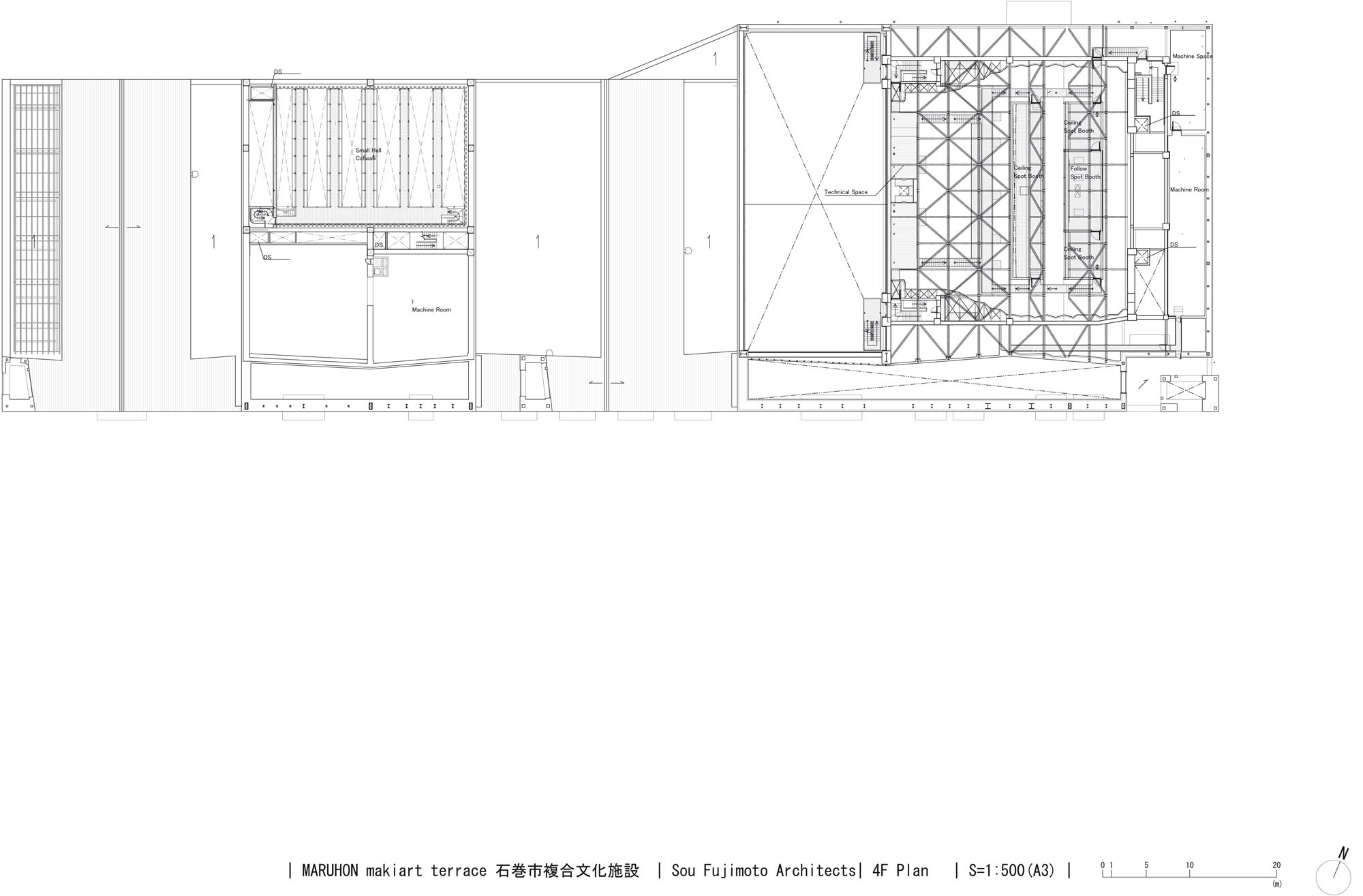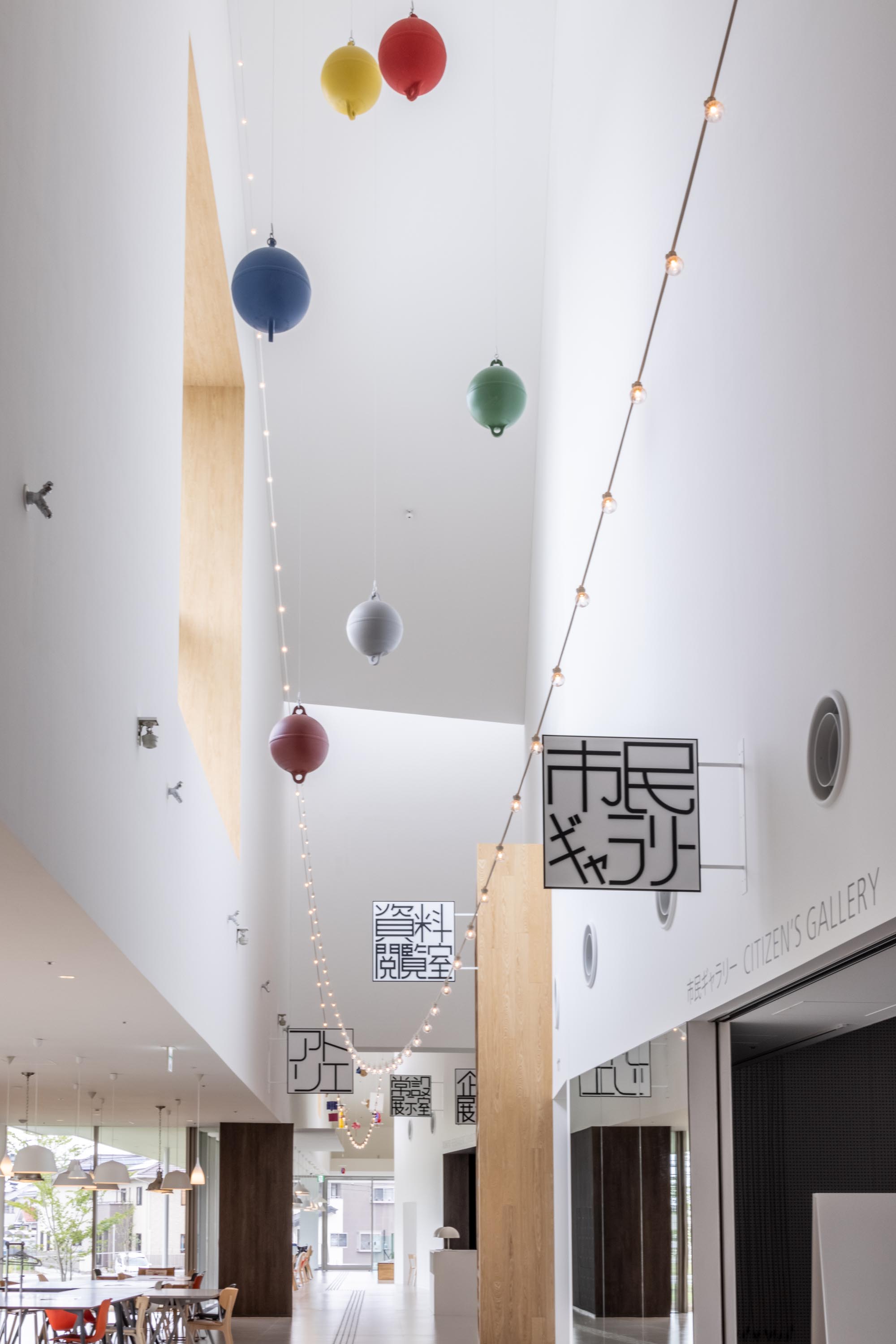 A simple plan configuration arranges programs linearly along a slender lobby of about 170 m in length. We placed the functions that are highly used by citizens, such as practice studios, and ateliers in such a way as to protrude into the lobby space. This creates interlocking effects of various scales as if to further segment the linear lobby. By carefully adjusting the entire space, including the selection and placement of furniture, as well as the density of signs and lighting fixtures, we intended to enable citizens to find a comfortable place in their daily lives; a place where local students study after school, people chit-chat, and read. As these rooms and functions began to appear like huts in the lobby space, we placed small house-shaped and chimney-shaped volumes on the lobby roof to bring in light and allow for smoke exhaust. By combining these house shapes and chimney-like shapes, the 13,000-square-meter building with a 30-meter fly tower is both a large facility and a human-scale structure. It has a strong identity but at the same time it is like a small town which evokes various impressions and meanings. The hope is that the building will not be a landmark that imposes a single effect, but something that is built on ambiguity and is flexible enough to allow various people to share their own impressions. All while having a strong presence. The landscape of rows of house-shaped volumes inherits the memory of the buildings that lined the former Kitakami River, which prospered through water trade.