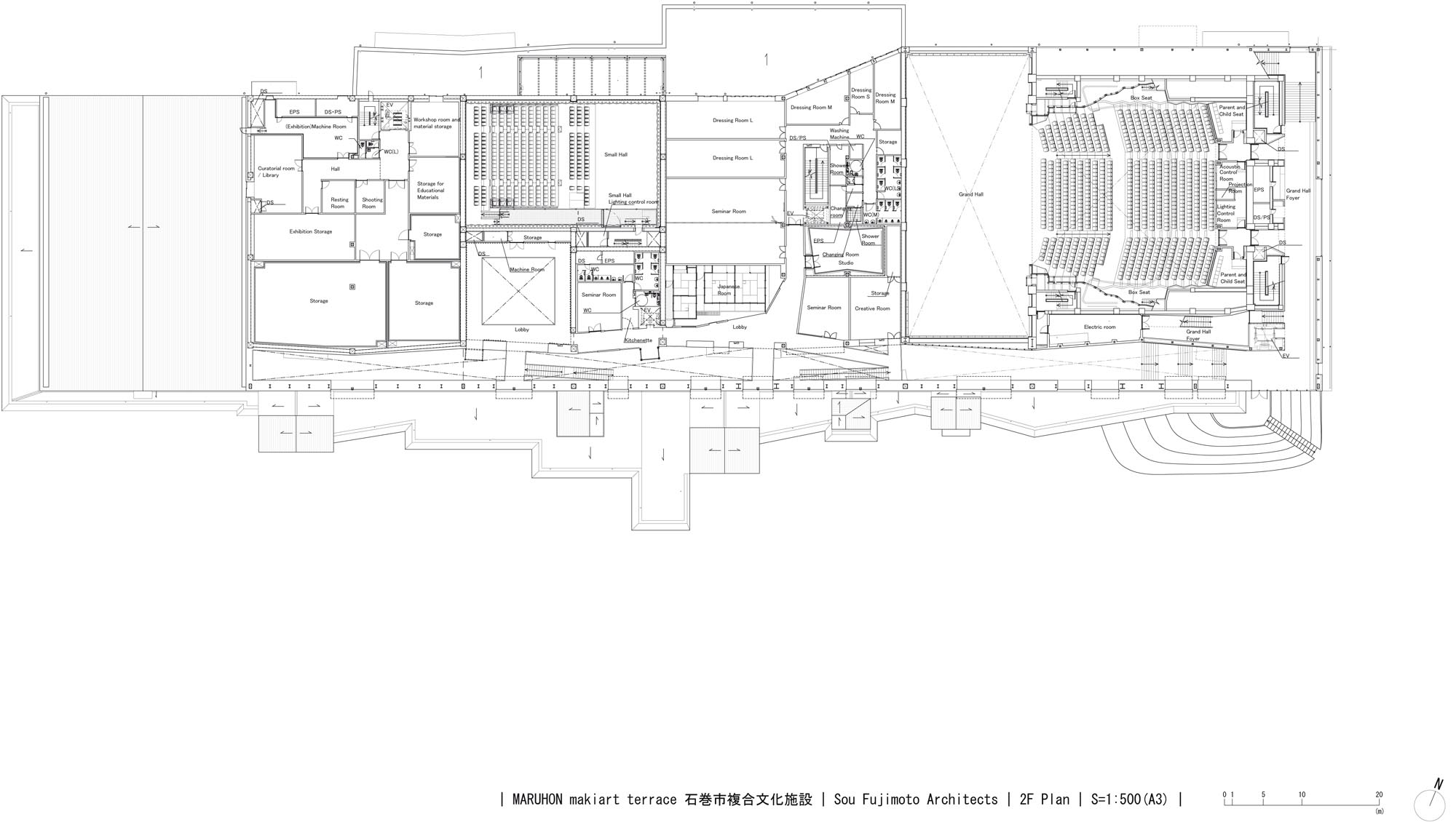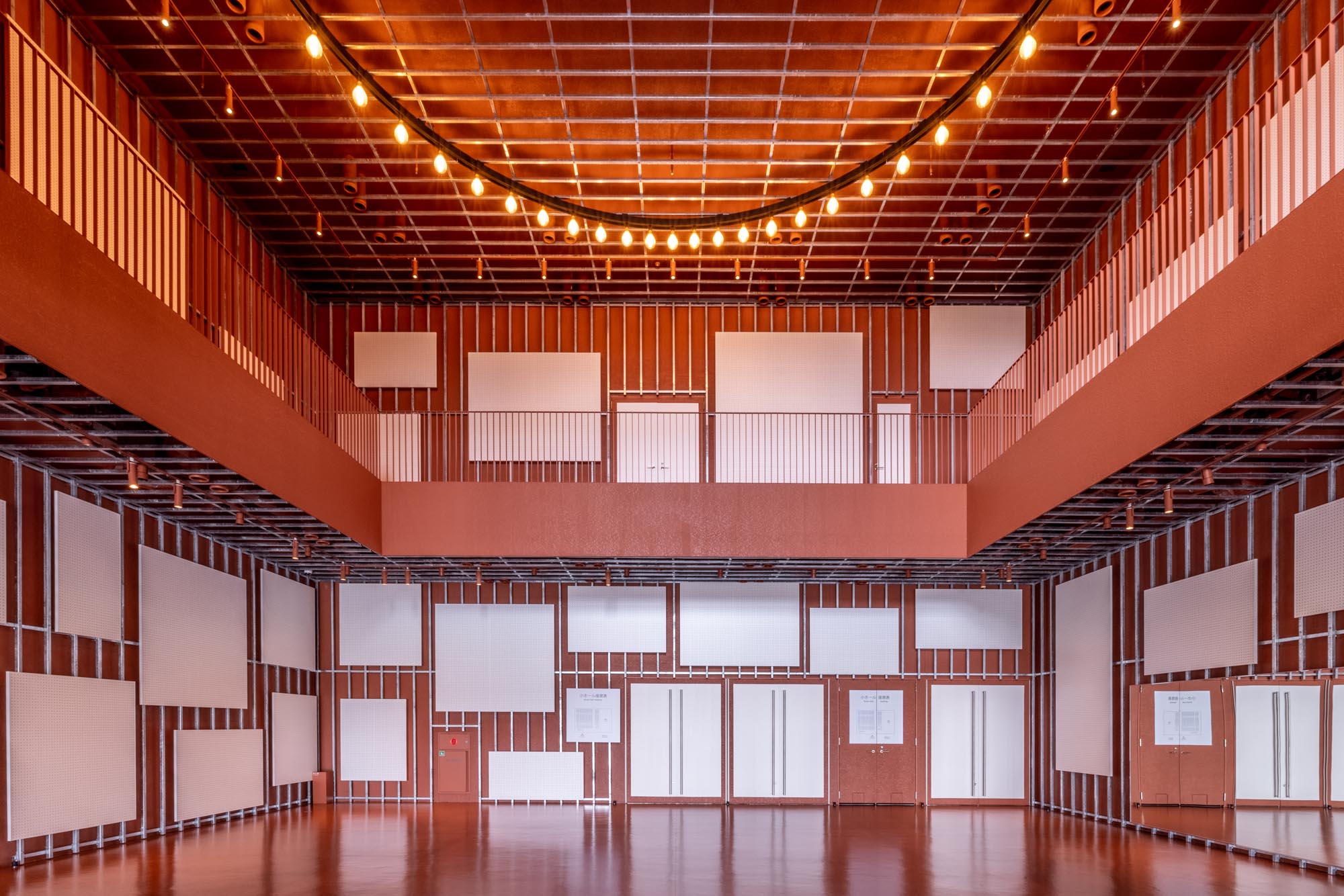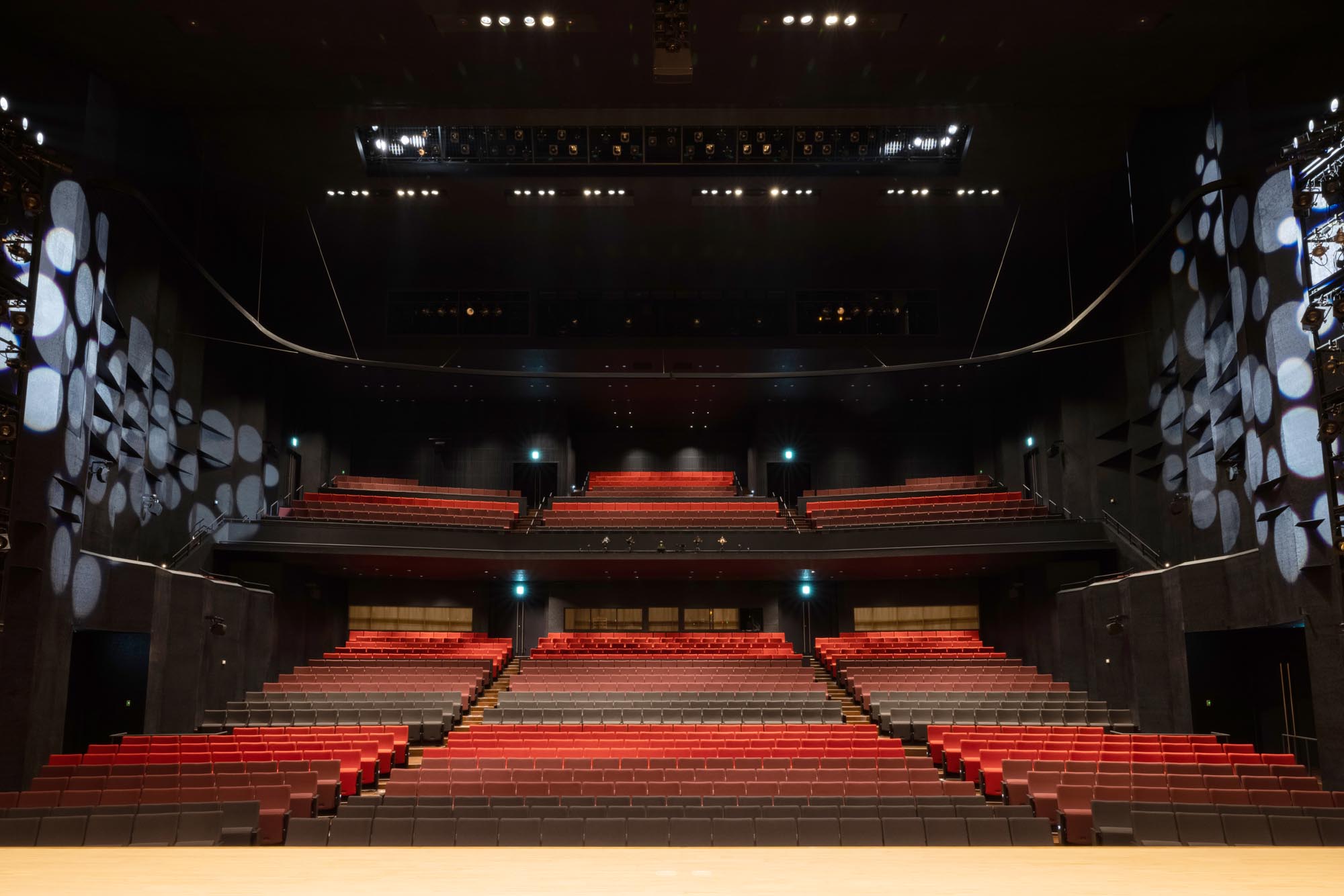Regarding the structure of the large hall, in order to respond with flexibly to the balance between the number of seats and the performance type, we divided the second floor seats with curtains, making it possible to use the middle hall scale within the first floor. The interior of the hall, which uses black to form a background, emphasizes the presence of the stage and the audience seats, intended to create a sense of unity between the performers and the audience.