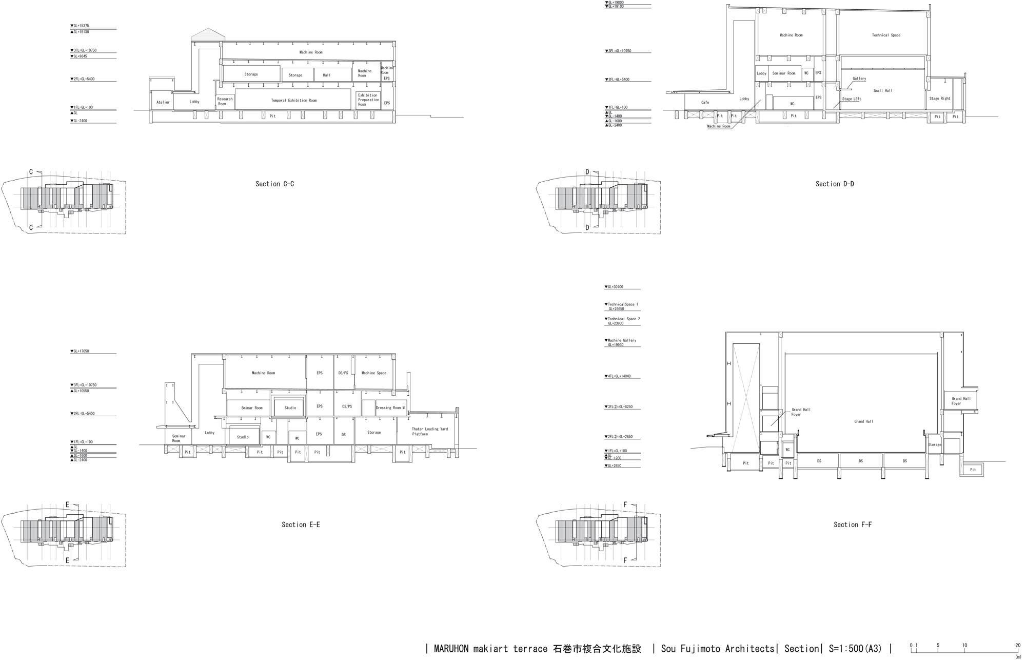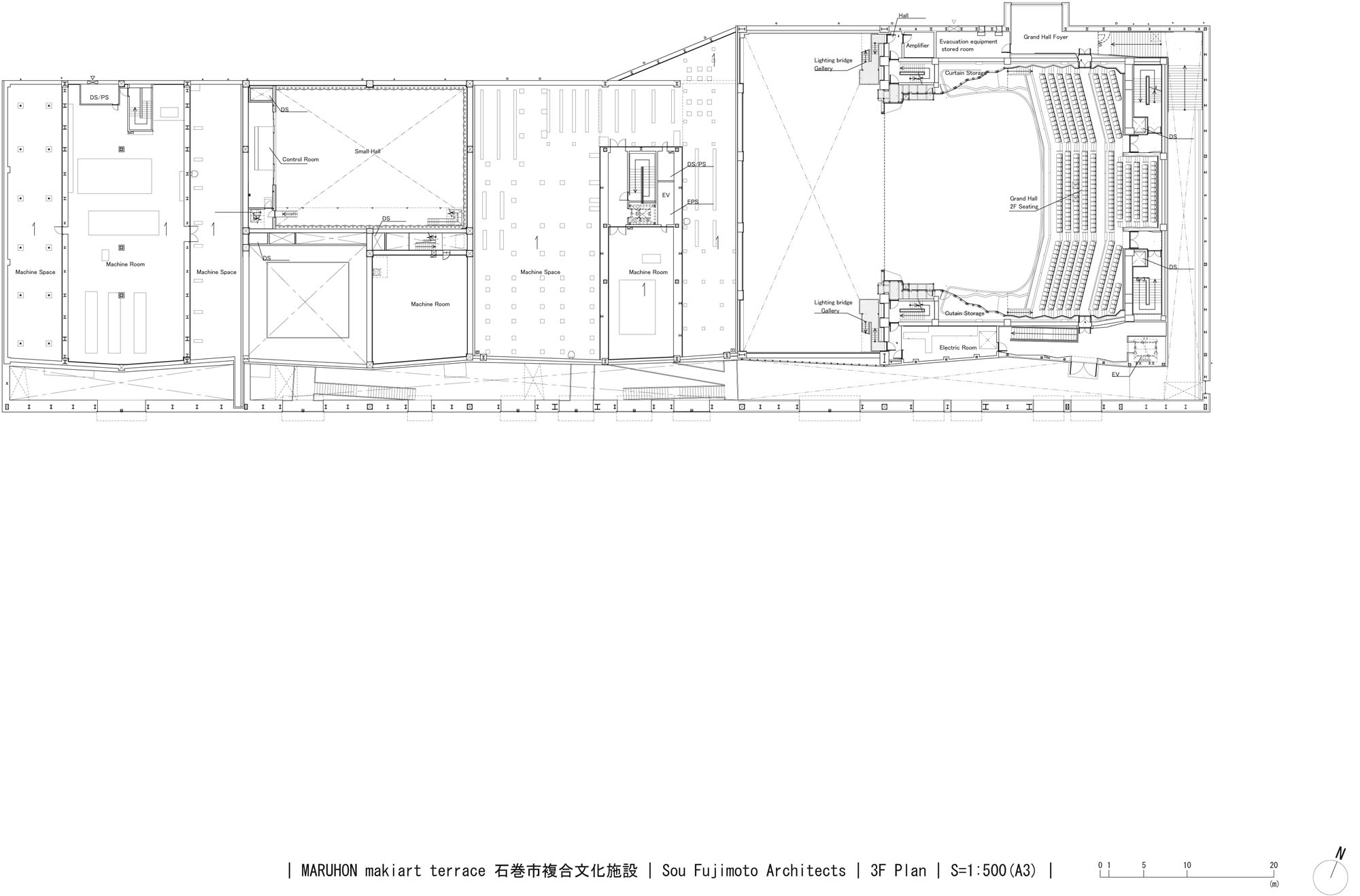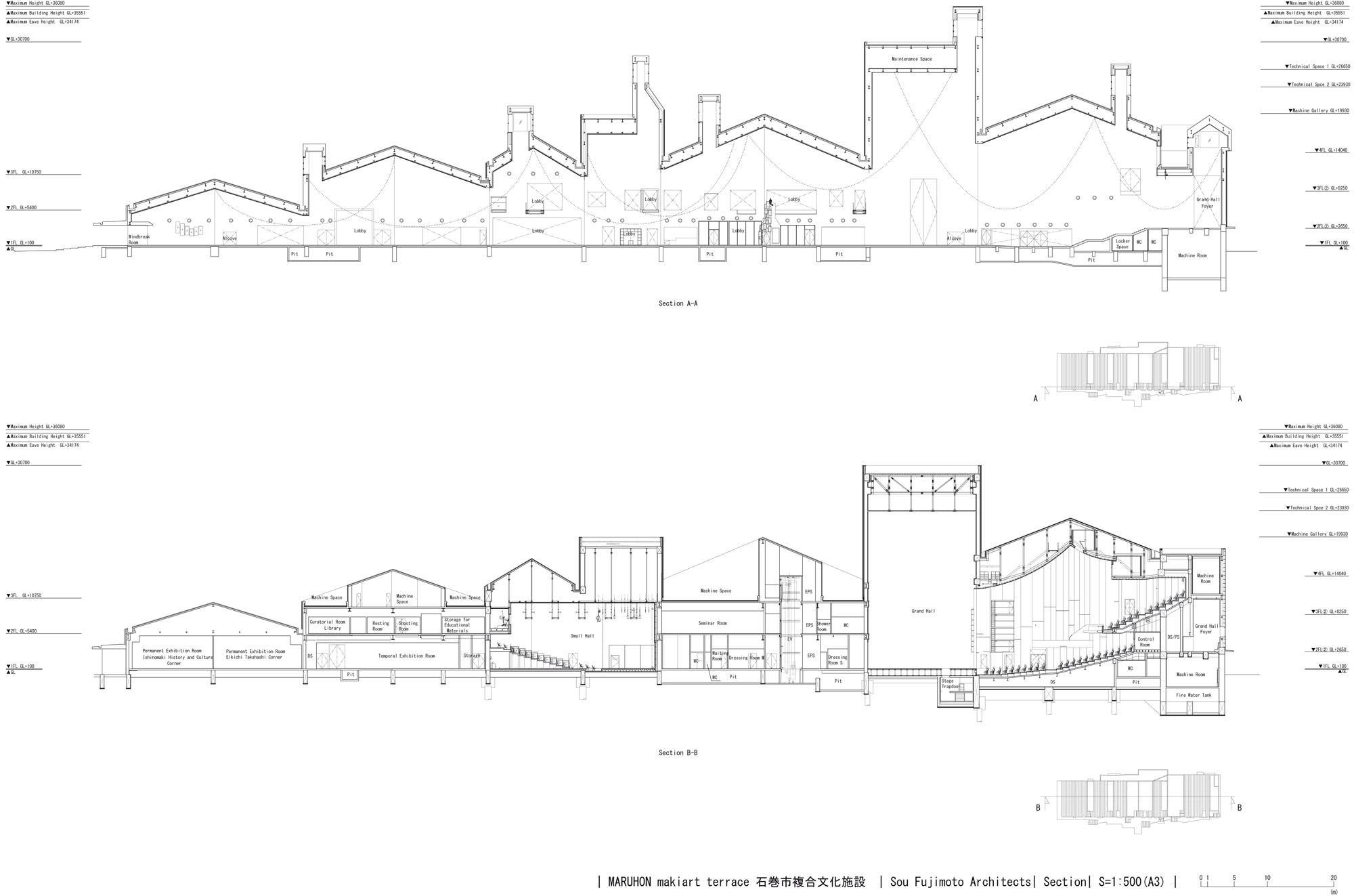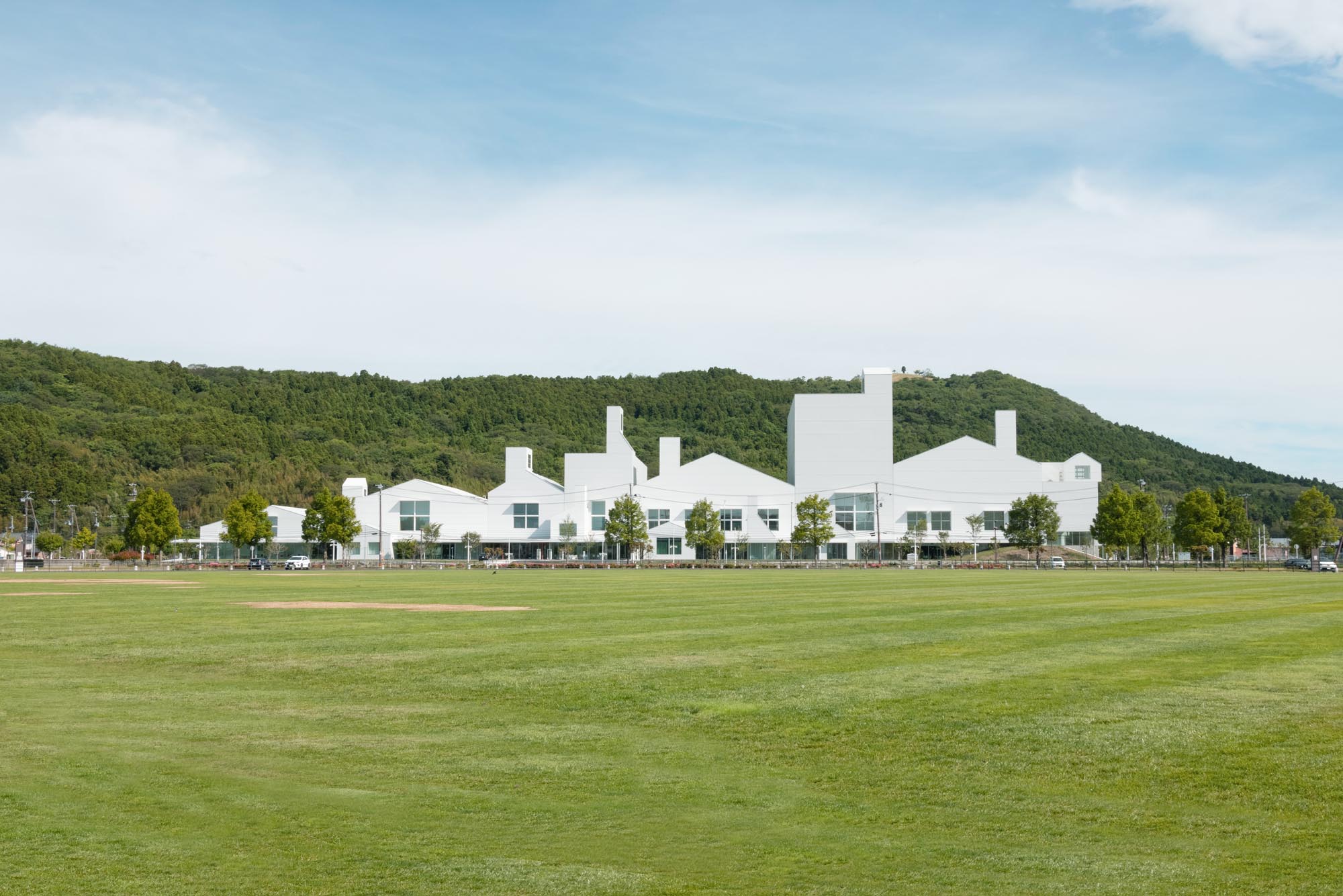 The Great East Japan Earthquake and tsunami that occurred on March 11, 2011 damaged the Ishinomaki Civic Center and the Ishinomaki Cultural Center, forcing them to be demolished. With the aim of reviving those functions and creating a complex cultural facility that will revitalize people and communities as a symbol of Ishinomaki city’s recovery, a design proposal was announced in 2016. The program called for a building complex which includes a large hall with 1254 seats, a small hall with 300 seats, an exhibition area, a public gallery and a learning space, which can be visited by a variety of people.