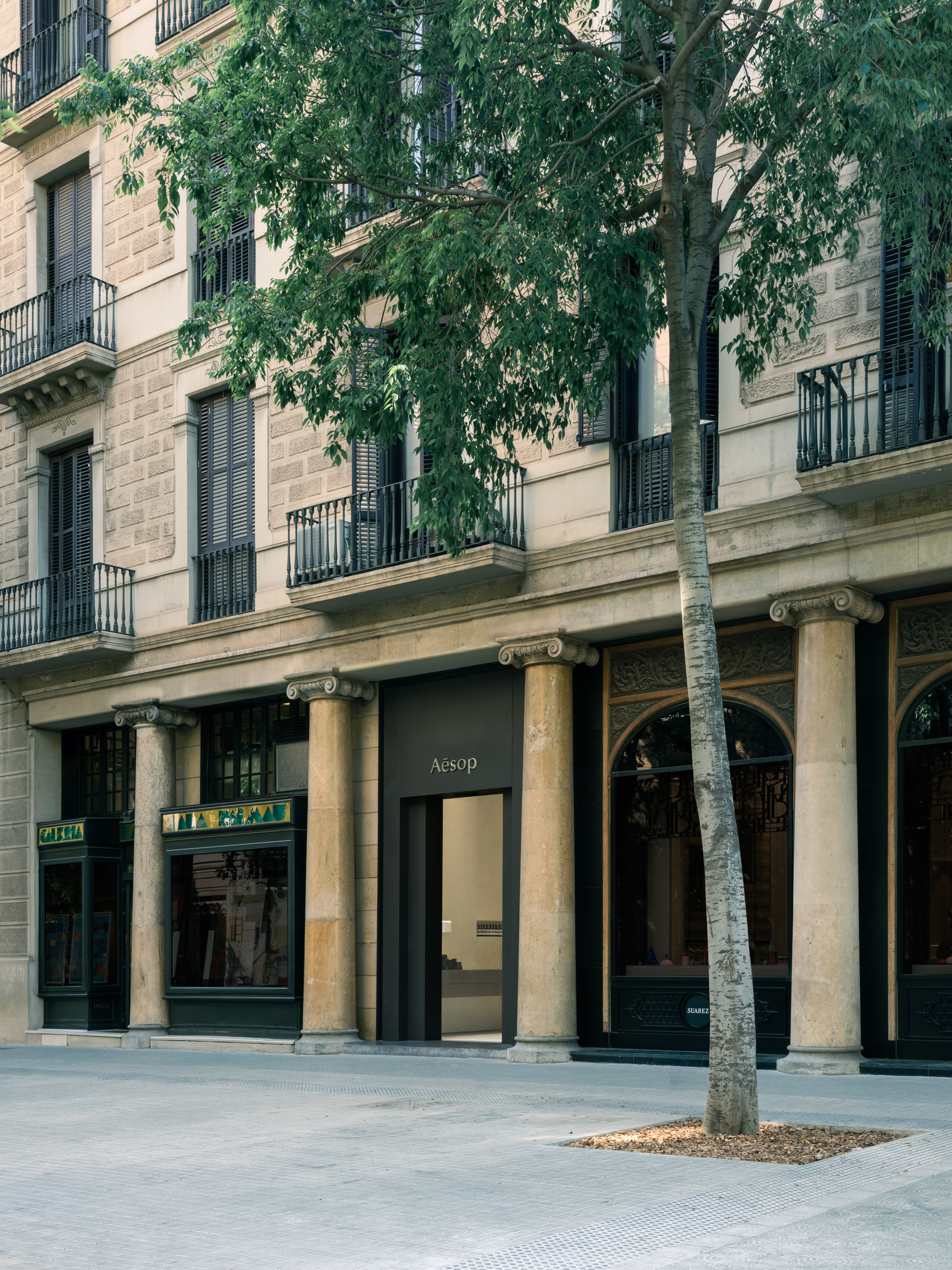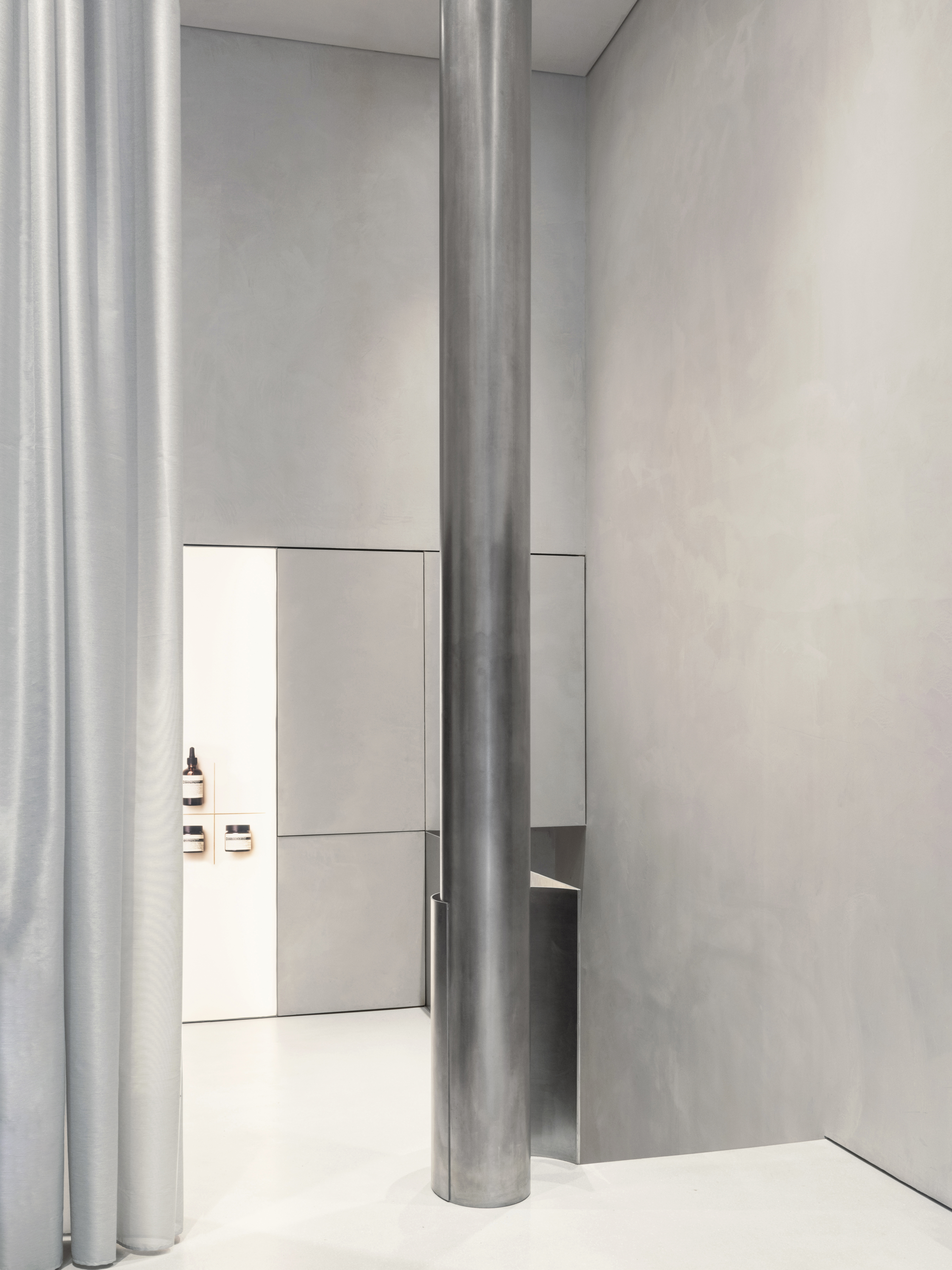The project for the Aesop store on Consell de Cent Street has been a project of discovering and stripping the existing space to reveal its essence. To work with what we understood as fundamental to, from there, compose an atmosphere that reflected the character of Aesop. The store is made up of a few elements, expressive and precise in their position, and with three materials: stucco on the walls and ceilings, terrazzo on the floor, and burnished steel on the columns, the counter, and the display case. It is a simple and complex space at the same time, which aspires to be sophisticated and close, and in a certain way intimate and monumental.