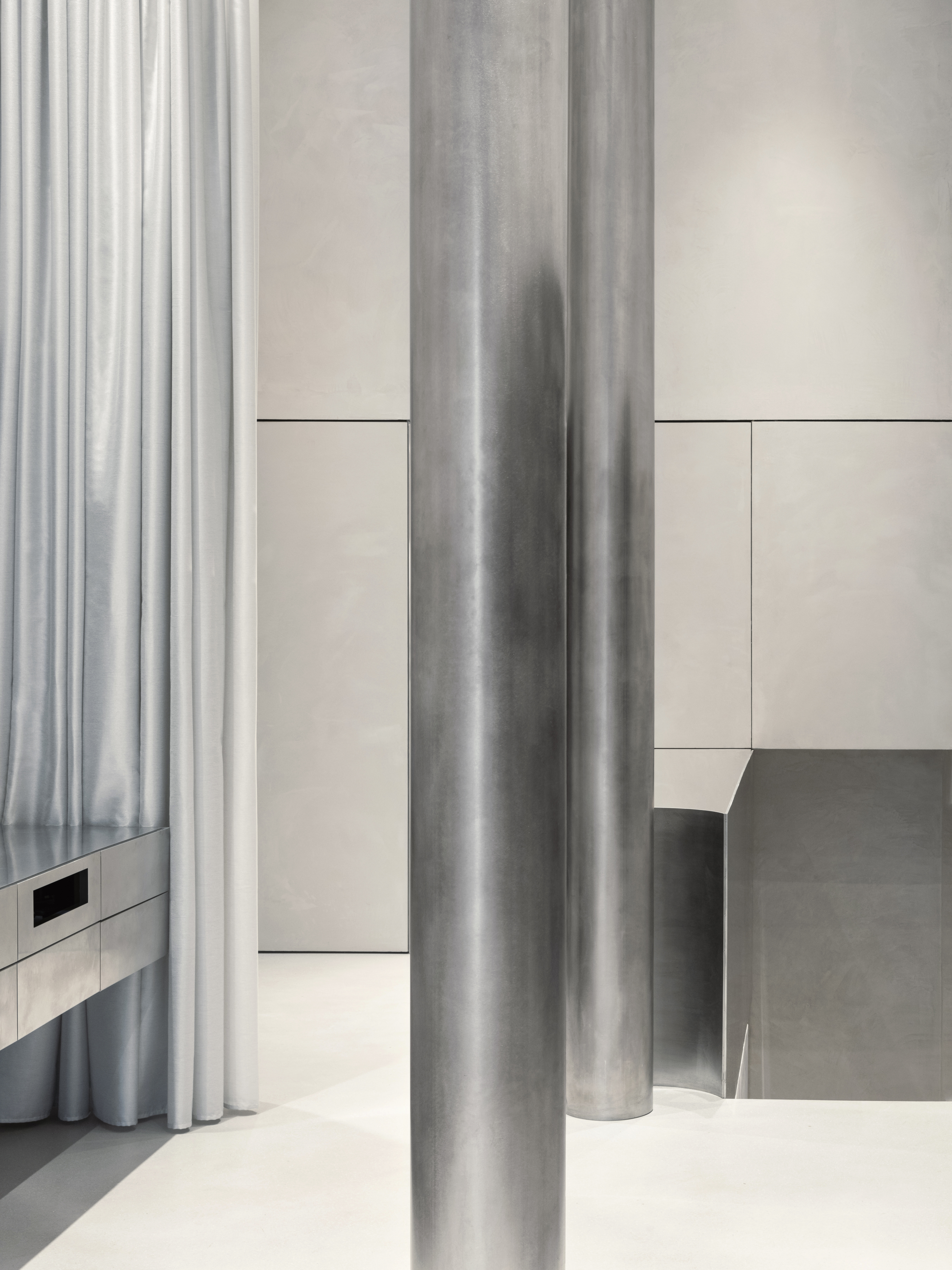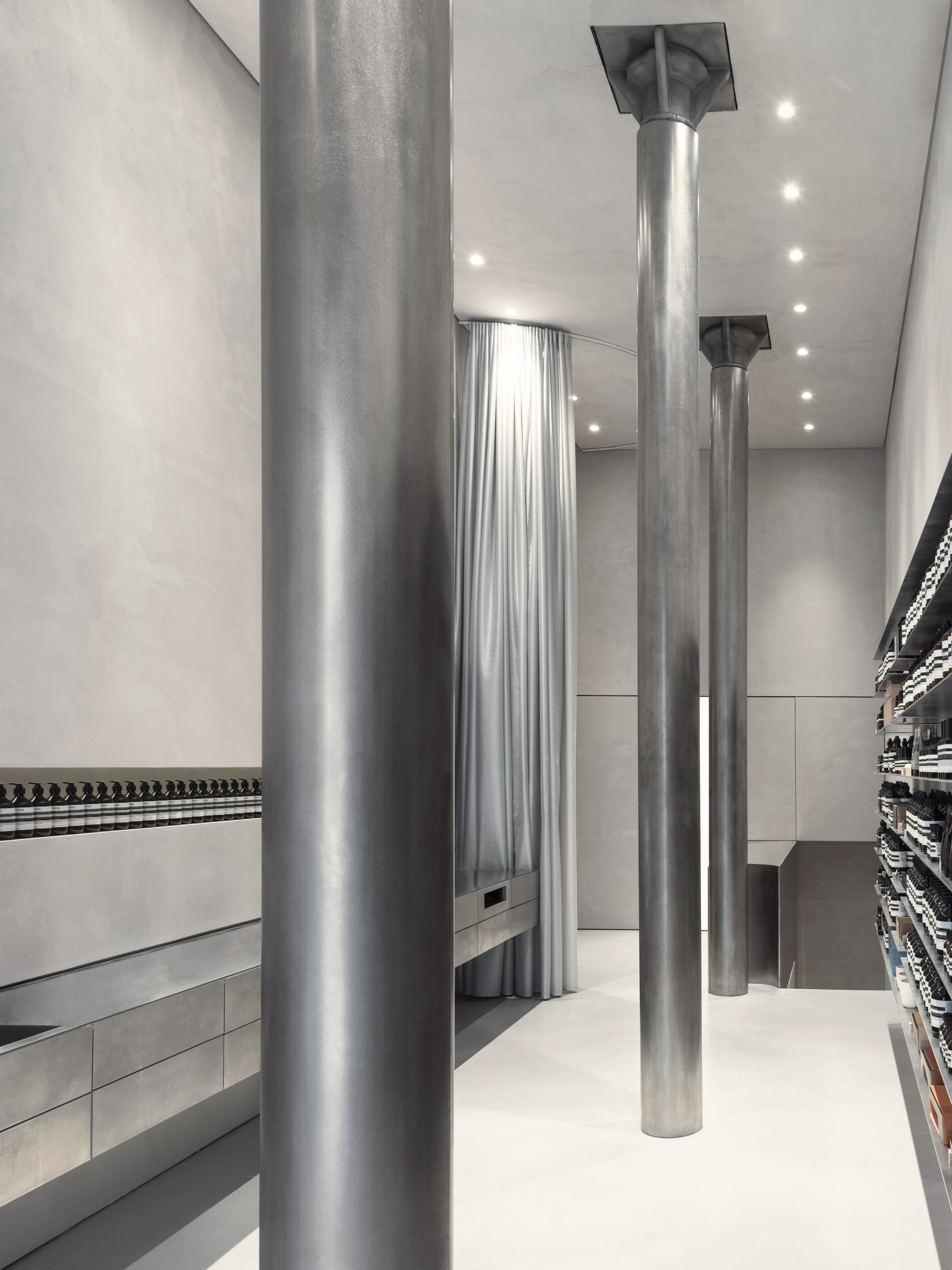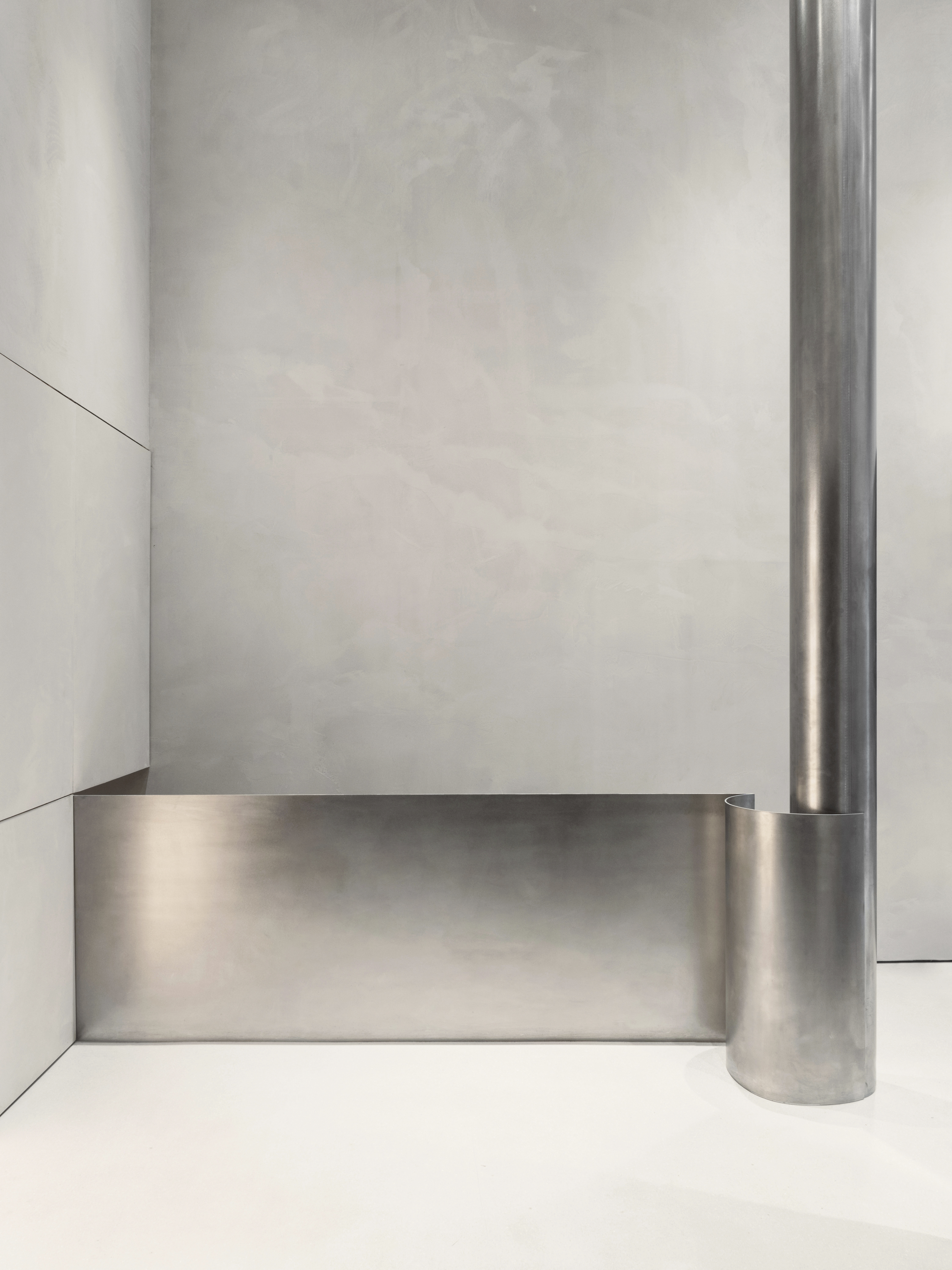 They are arranged asymmetrically within the space, and this allows finding an order in it; In the widest part of the store, facing the columns, there is a counter. Suspended from the wall, it extends throughout the space, disappearing into its depths. Like the columns, it is also made of burnished steel, slightly shiny, and worked by hand. The material allows the counter to be perceived as an abstract, light, apparently simple element.