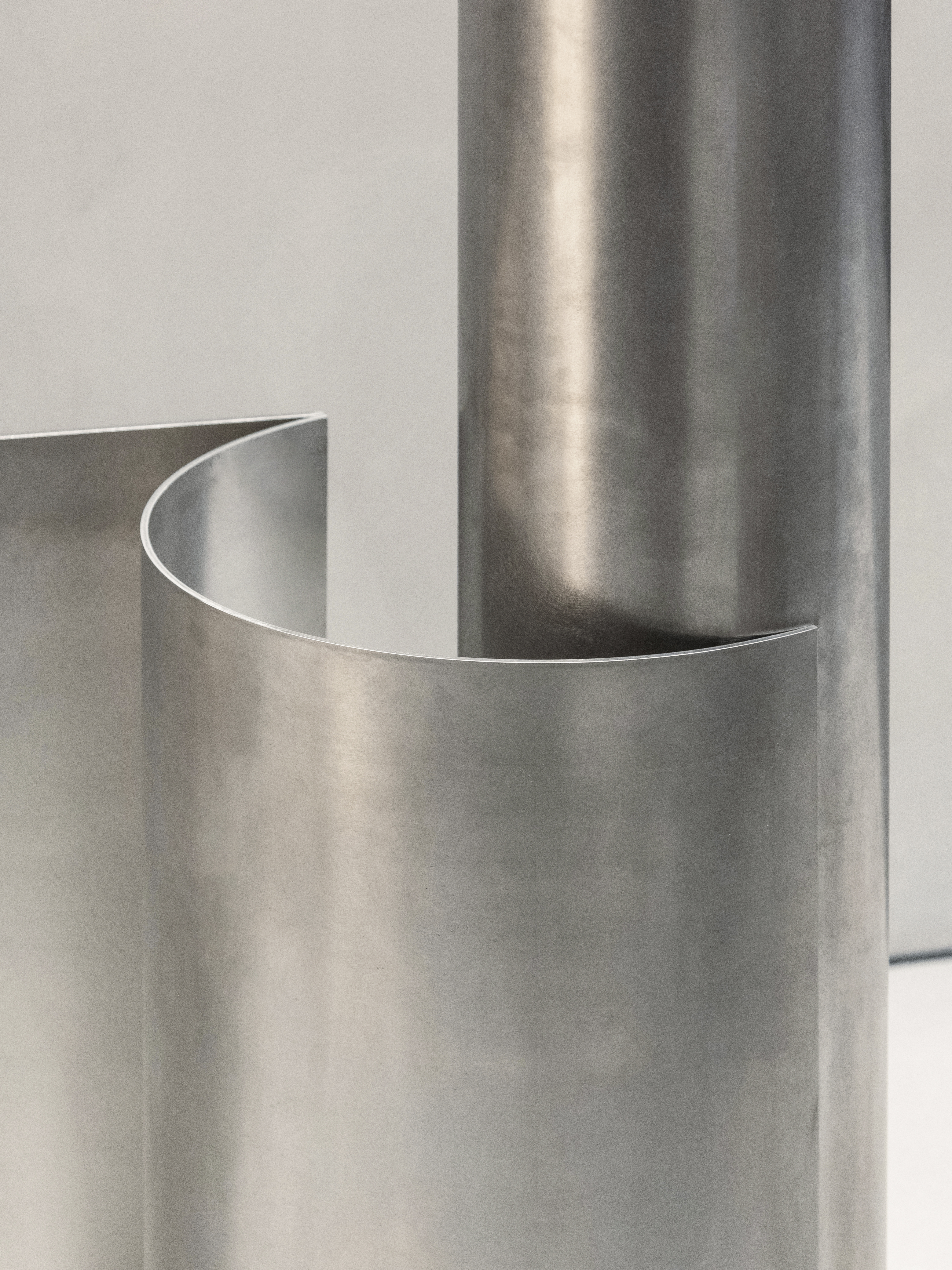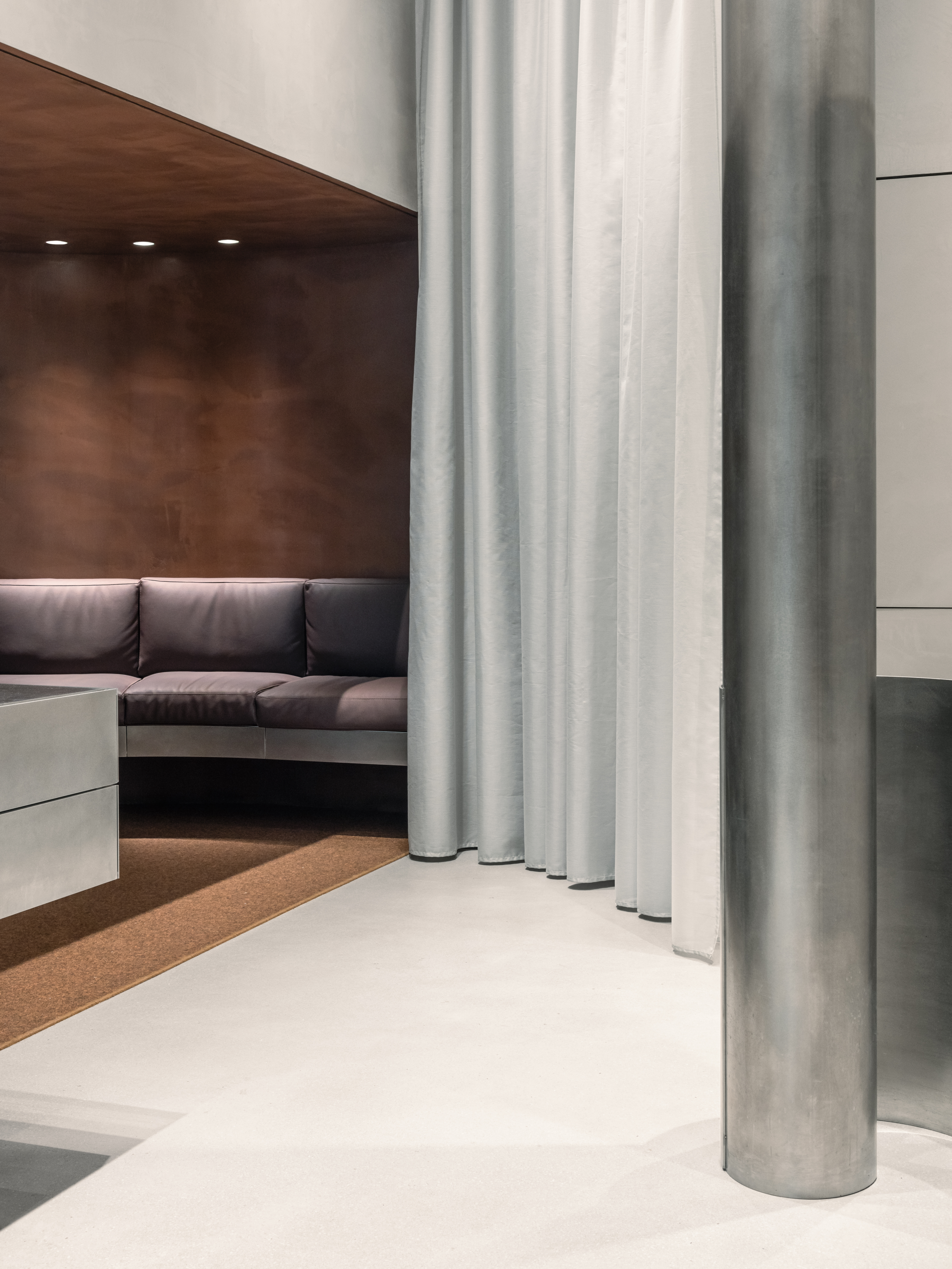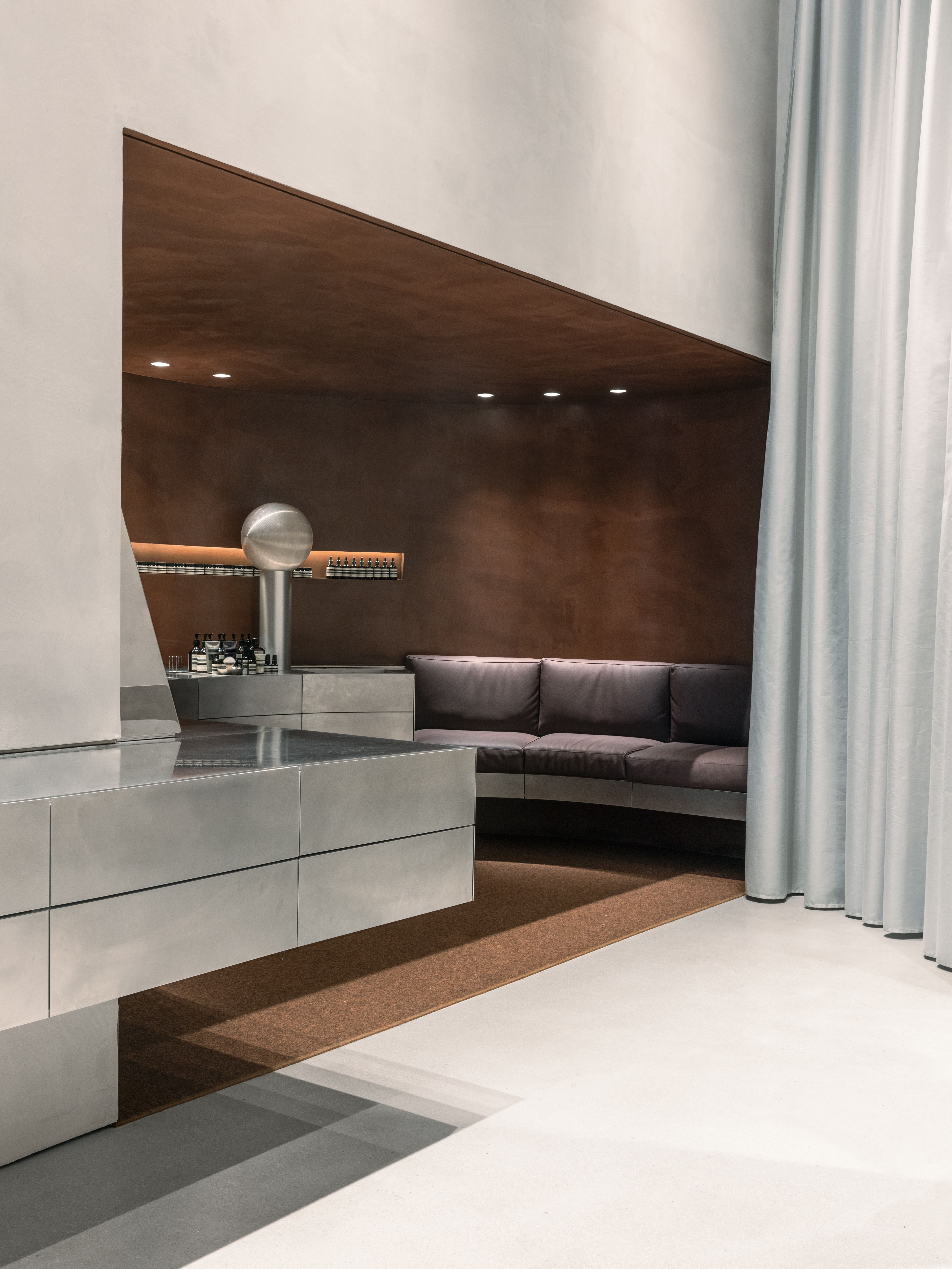 They are arranged asymmetrically within the space, and this allows finding an order in it; In the widest part of the store, facing the columns, there is a counter. Suspended from the wall, it extends throughout the space, disappearing into its depths. Like the columns, it is also made of burnished steel, slightly shiny, and worked by hand. The material allows the counter to be perceived as an abstract, light, apparently simple element.
