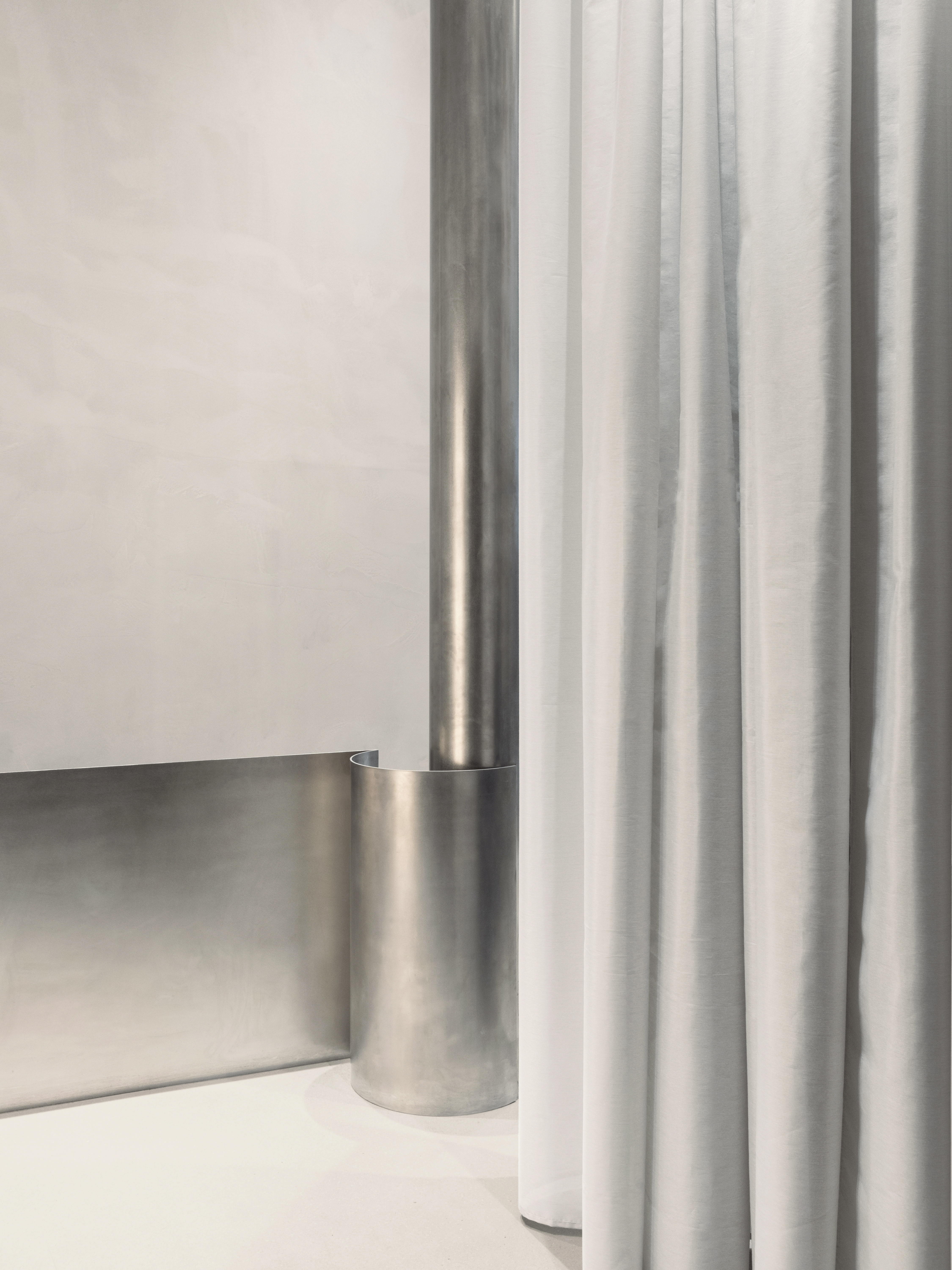 From the back of the store, the sequence repeats. Like a choreography, the play of the three elements that make up the store guides us toward the exit. The viewer discovers something different in the background. A curtain, like a large piece of cloth, unnoticed until this point, unfolds to its full height, wrapping and completing the small semicircular room. Suddenly, everything changes. Somehow, the rigor with which the store is organized is what also makes surprise, movement, and sensuality possible.