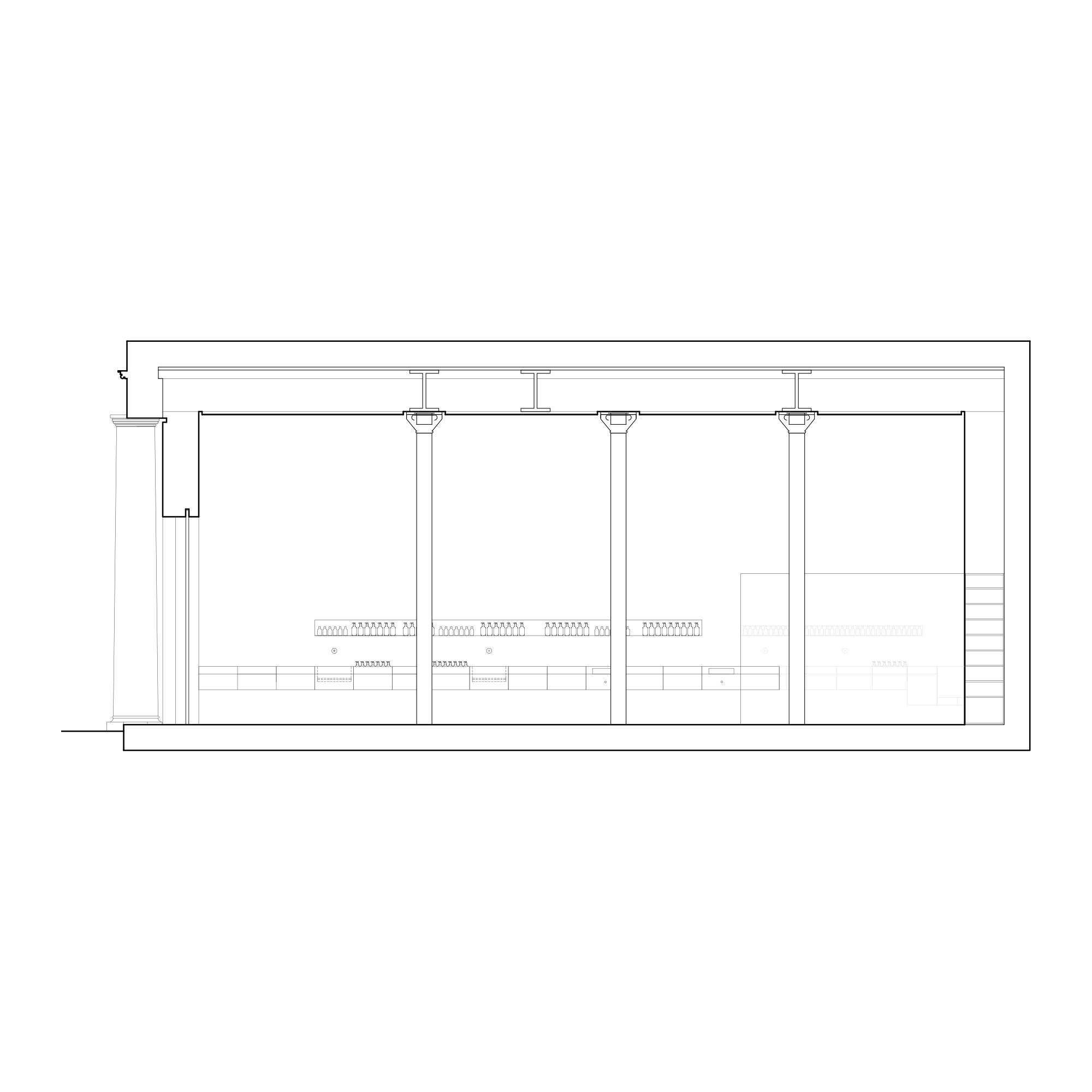Upon crossing its threshold, the visitor discovers a space barely three and a half meters wide, twelve meters long, and five meters high. A rectangular space, simple, somewhat unexpected. Inside, three slender columns clad in burnished steel appear majestic. Their position is not perfect, and neither is the rhythm that orders them, but even so, they can define everything that happens around them, they have the strength of being the essence of the place.
