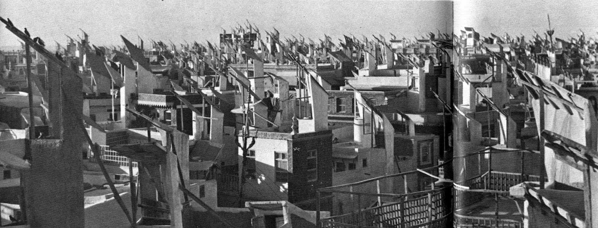 These unusual roofscapes are a prominent feature of the lower Sind district in west Pakistan. From April to June, temperatures range above 120°F., lowered by an afternoon breeze to a pleasant 95°. To channel the wind into every building, “bad-gir,” windscoops, are installed on the roofs, one to each room. Since the wind always blows from the same direction, the position of the windscoops is permanently fixed. In multistoried houses they reach all the way down, doubling as intramural telephones. Although the origin of this contraption is unknown, it has been in use for at least five hundred years.