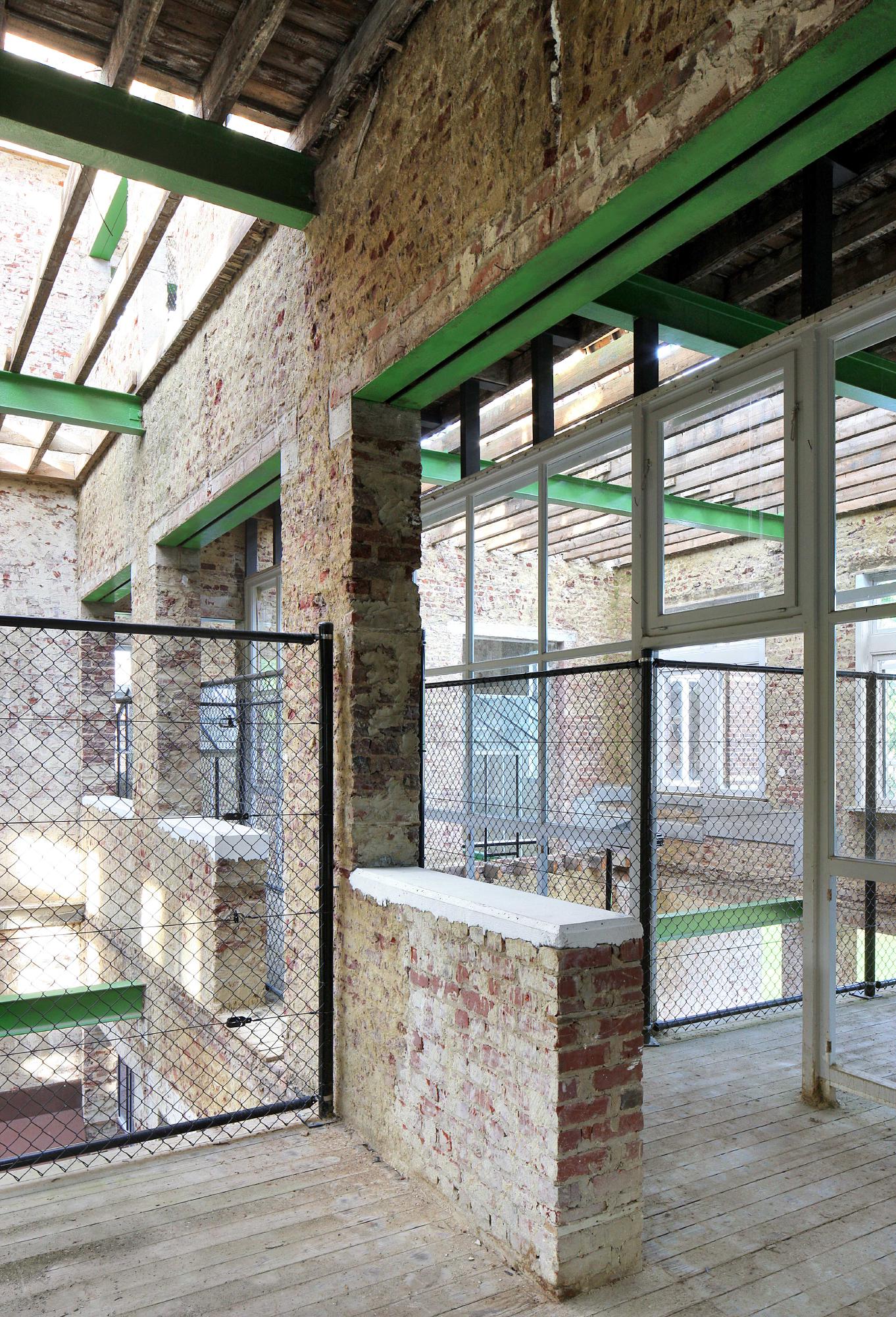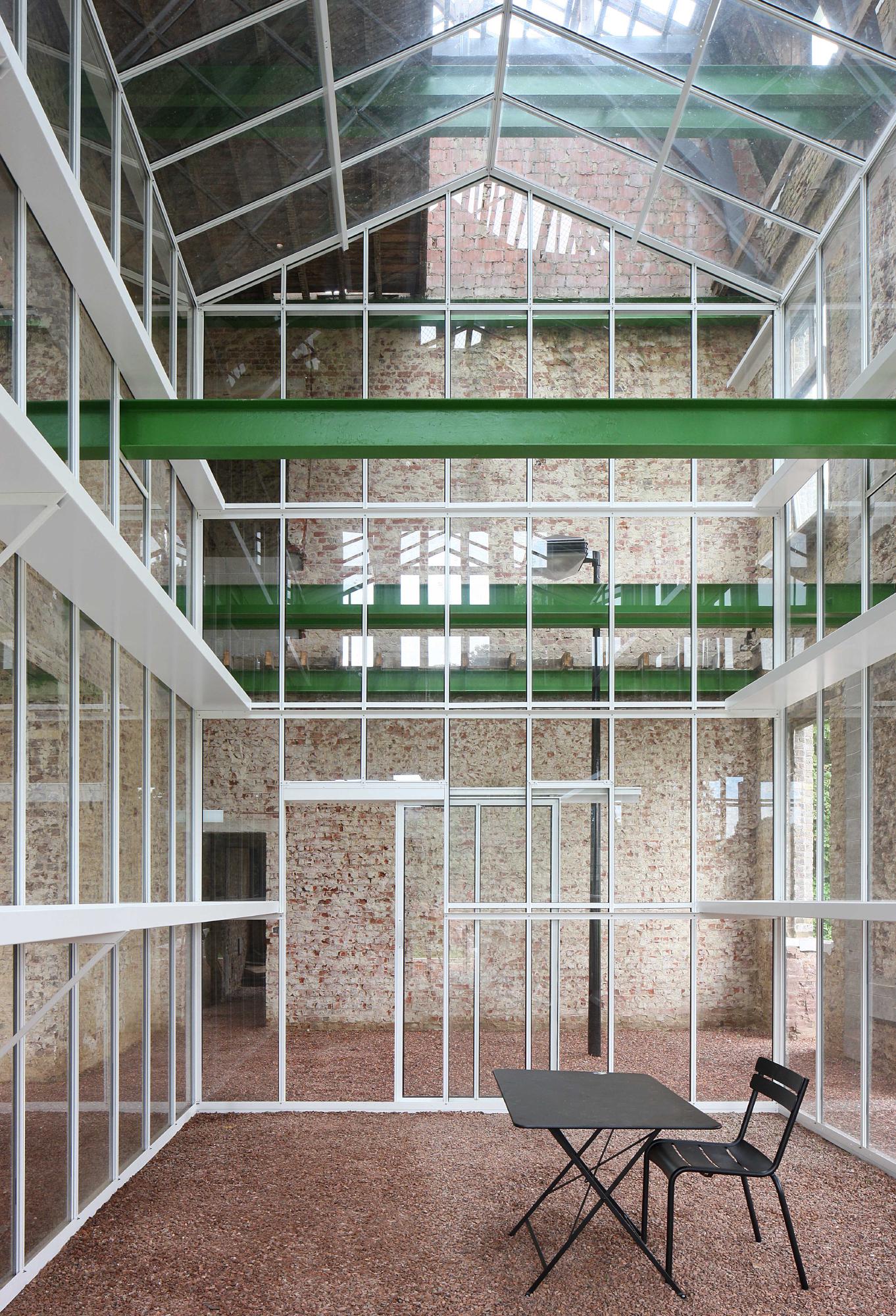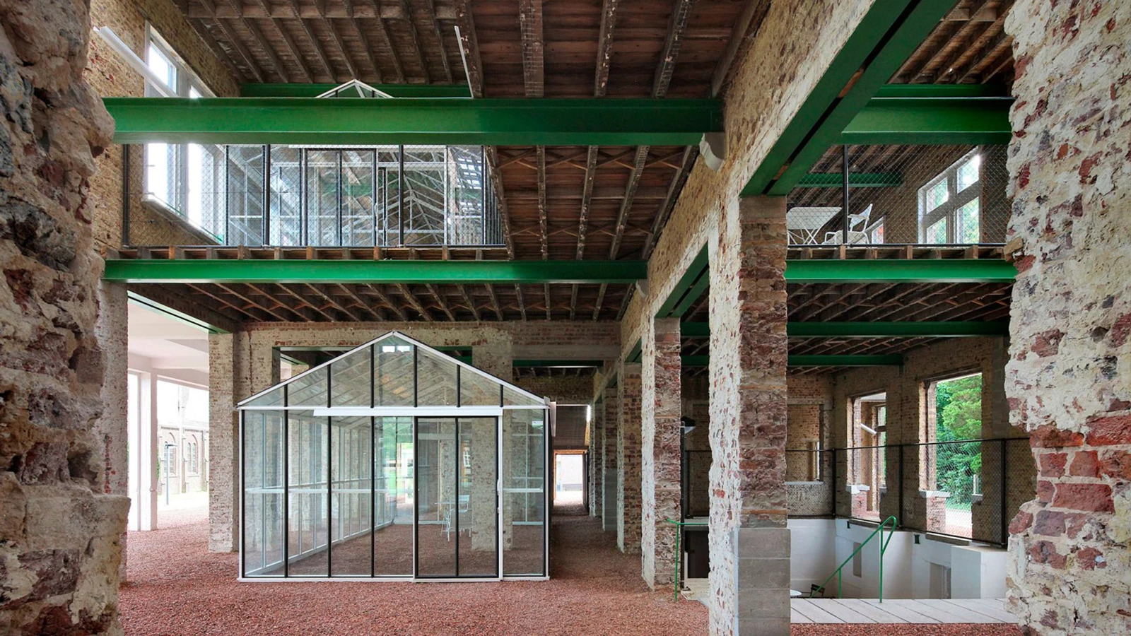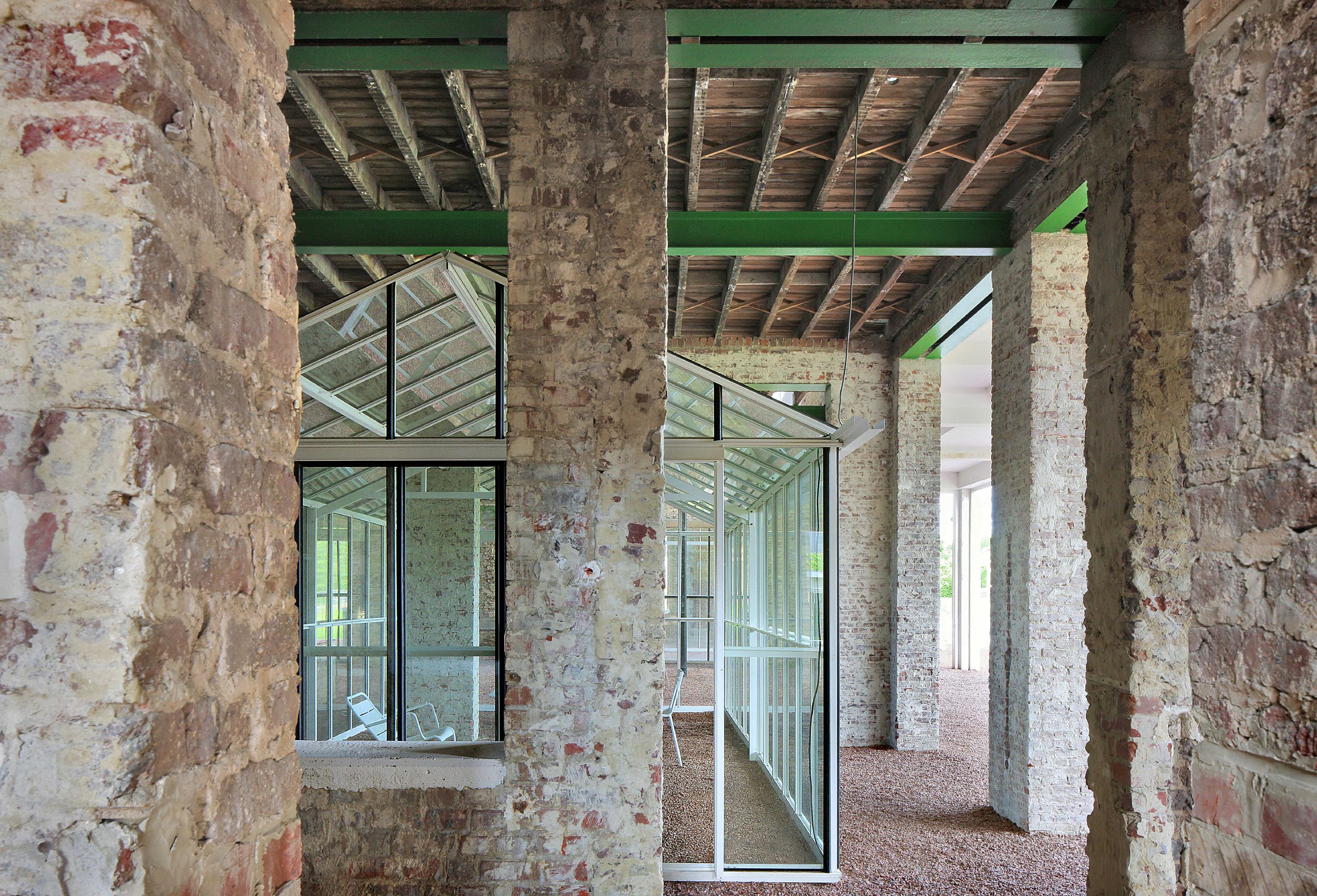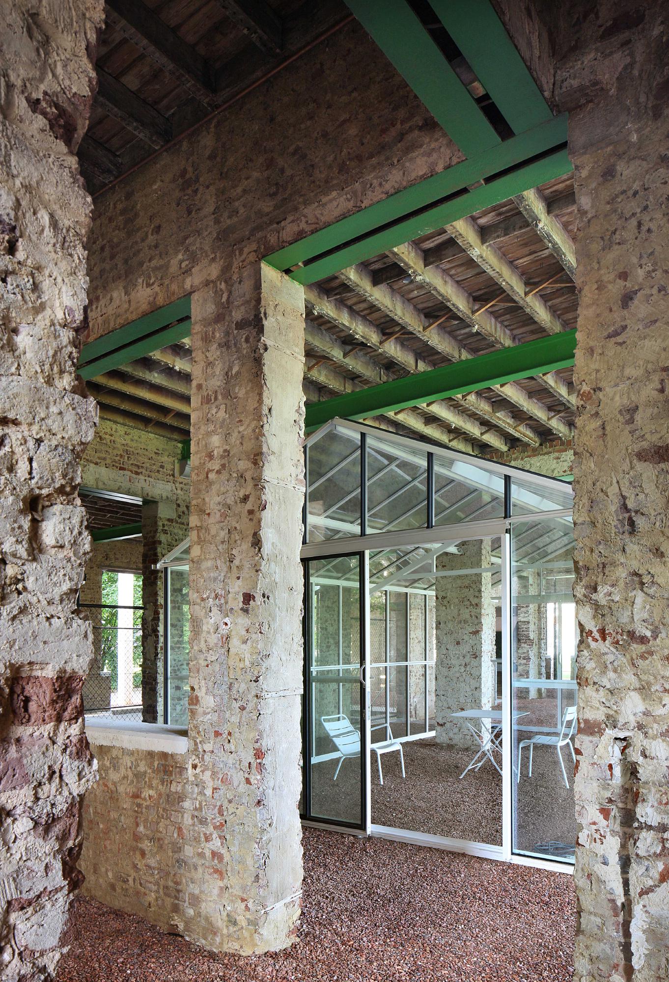 The roof is now glazed and the window openings have been closed with concrete. The renovation includes a series of scattered glass boxes, juxtaposed with a three-floor volume that leaves the traces of time exposed.