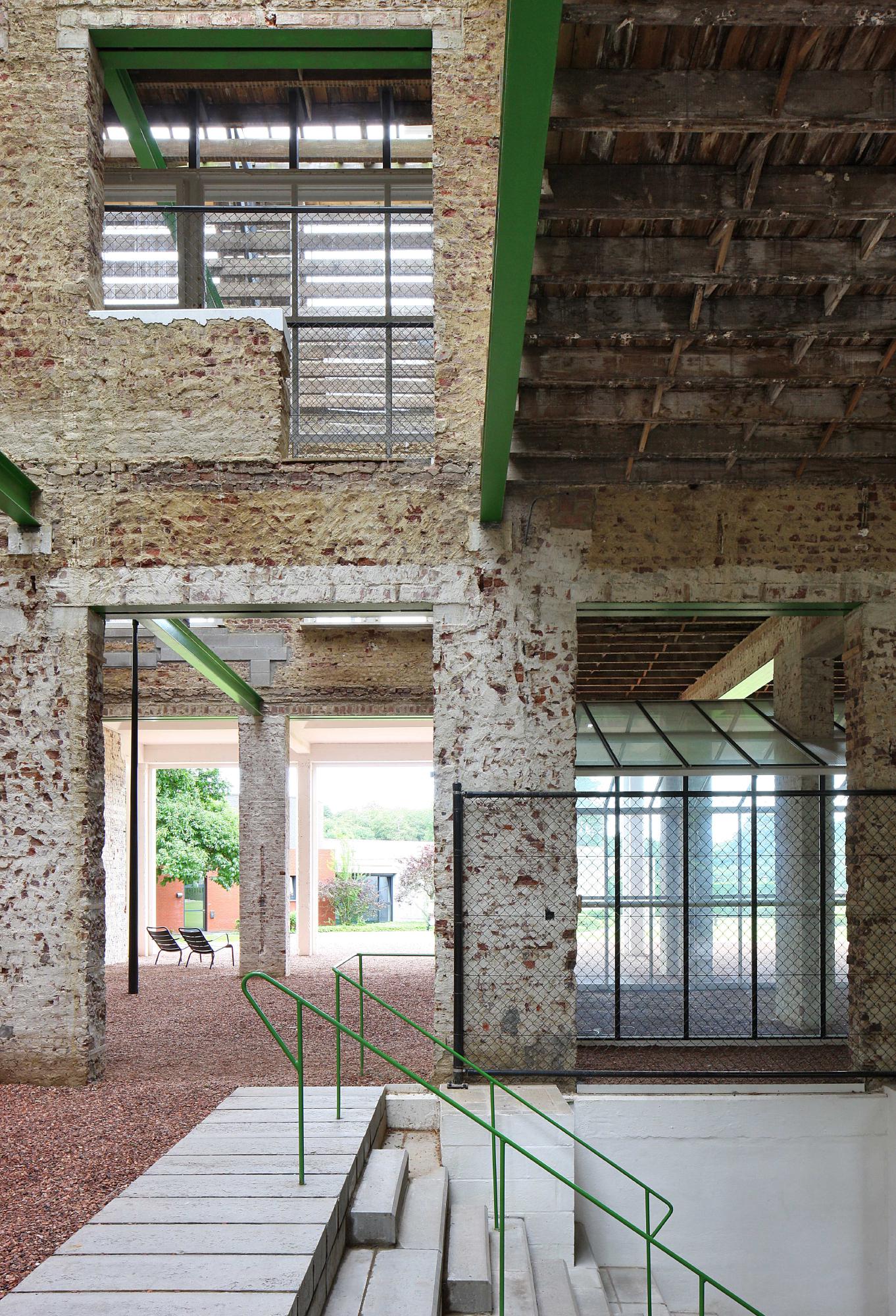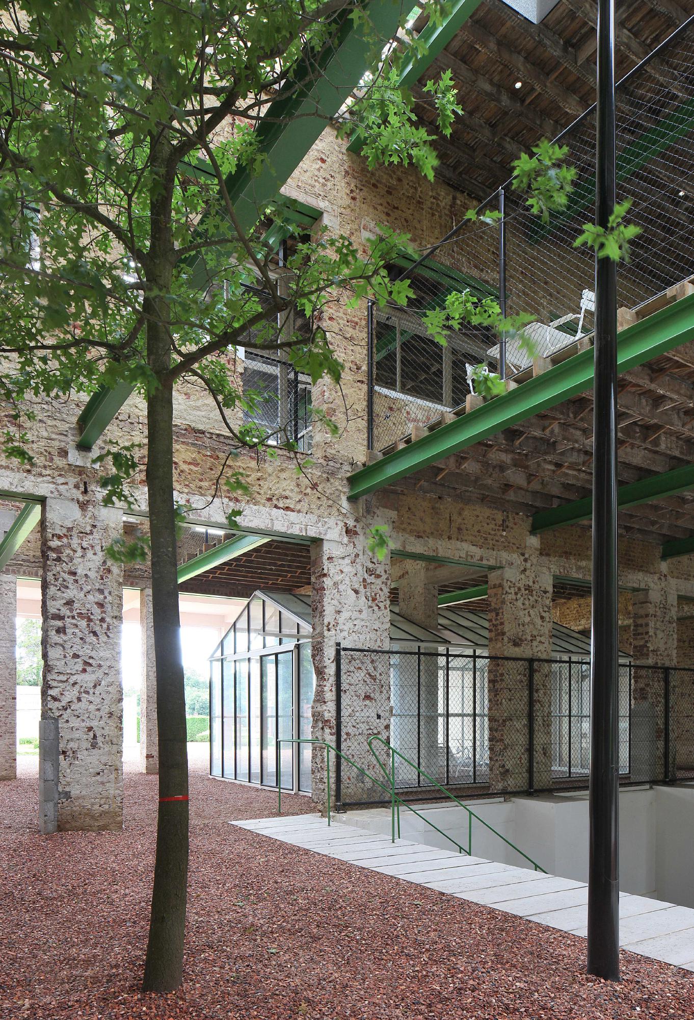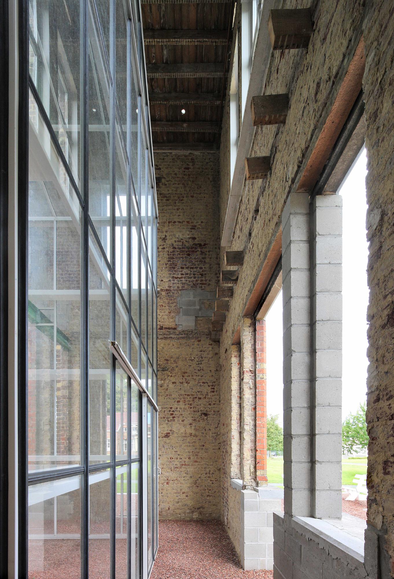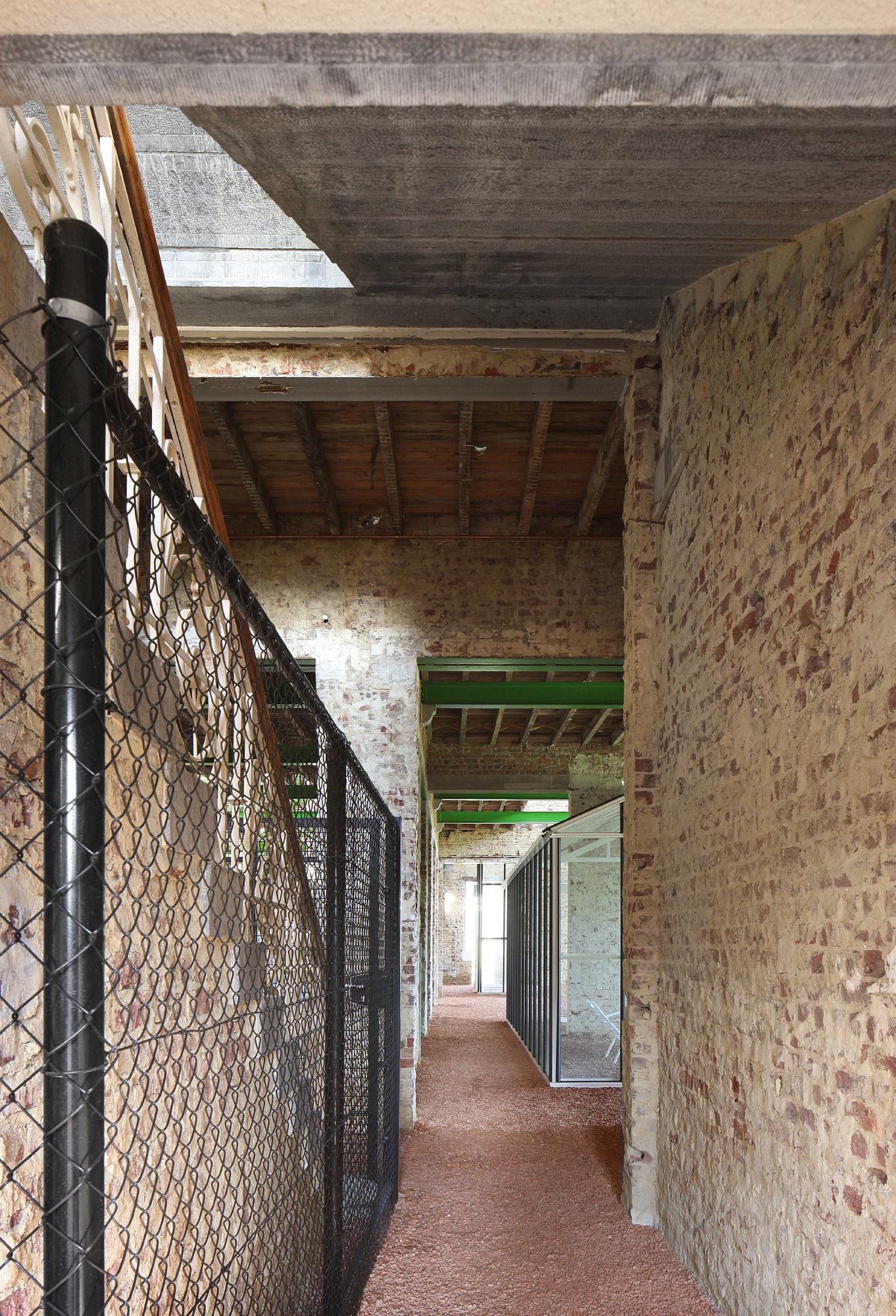The roof is now glazed and the window openings have been closed with concrete. The renovation includes a series of scattered glass boxes, juxtaposed with a three-floor volume that leaves the traces of time exposed.
