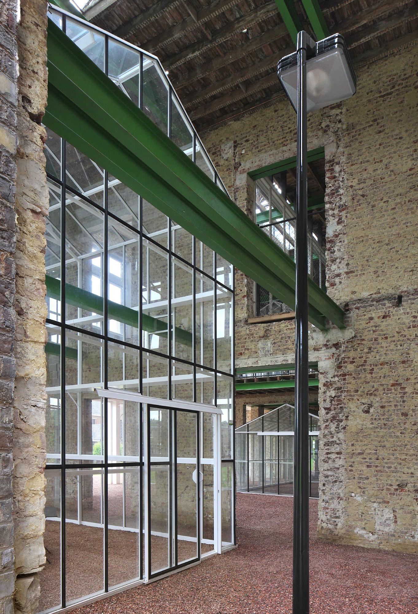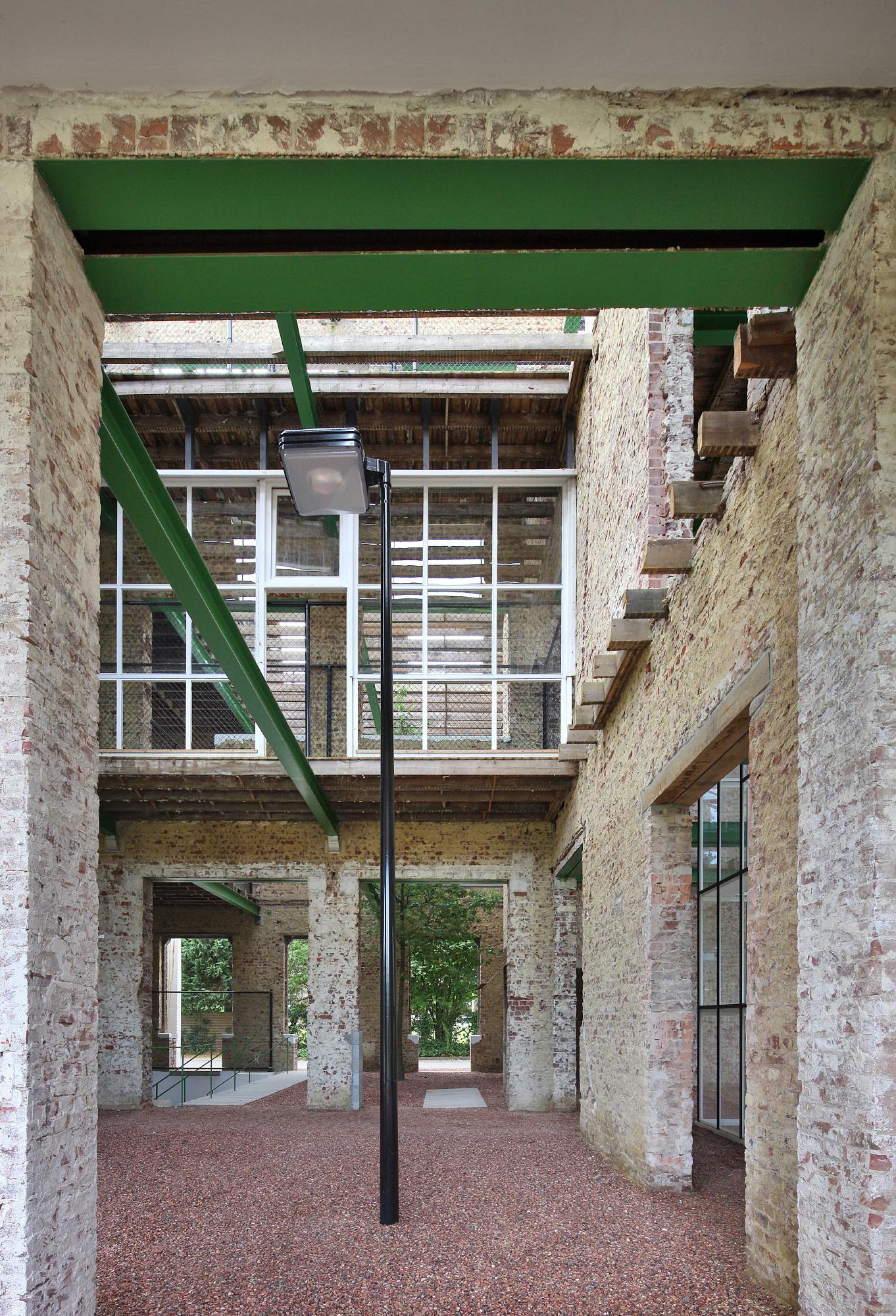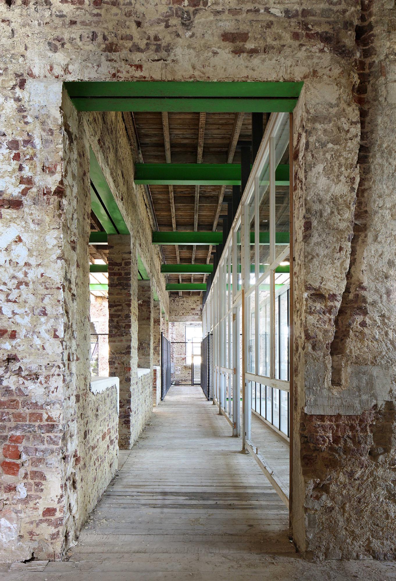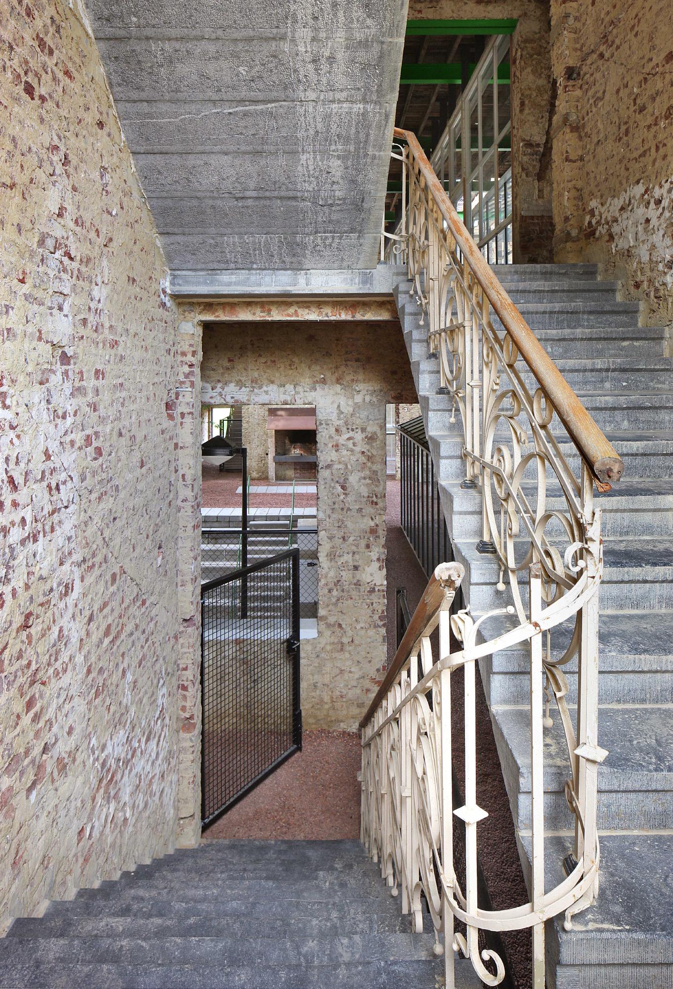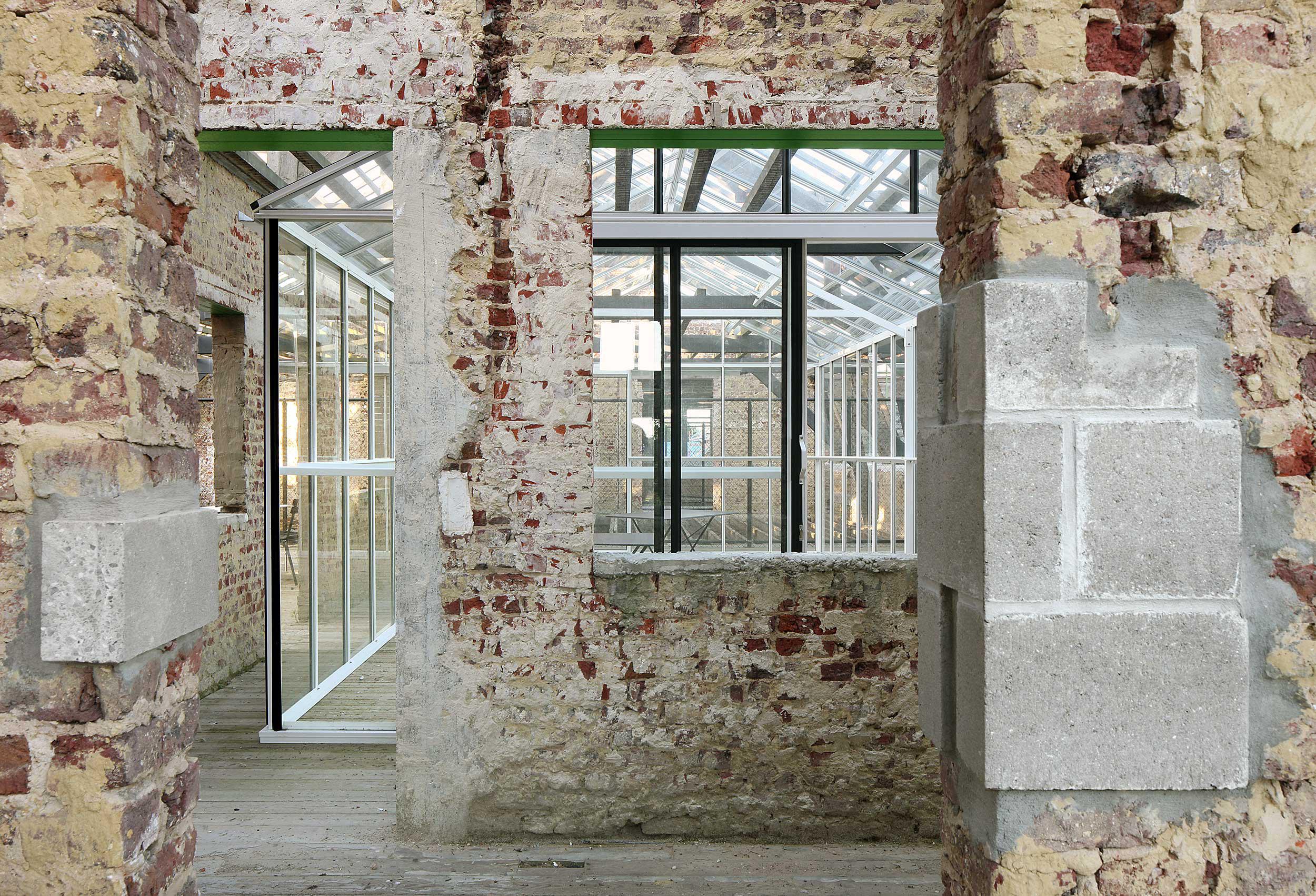 The roof is now glazed and the window openings have been closed with concrete. The renovation includes a series of scattered glass boxes, juxtaposed with a three-floor volume that leaves the traces of time exposed.