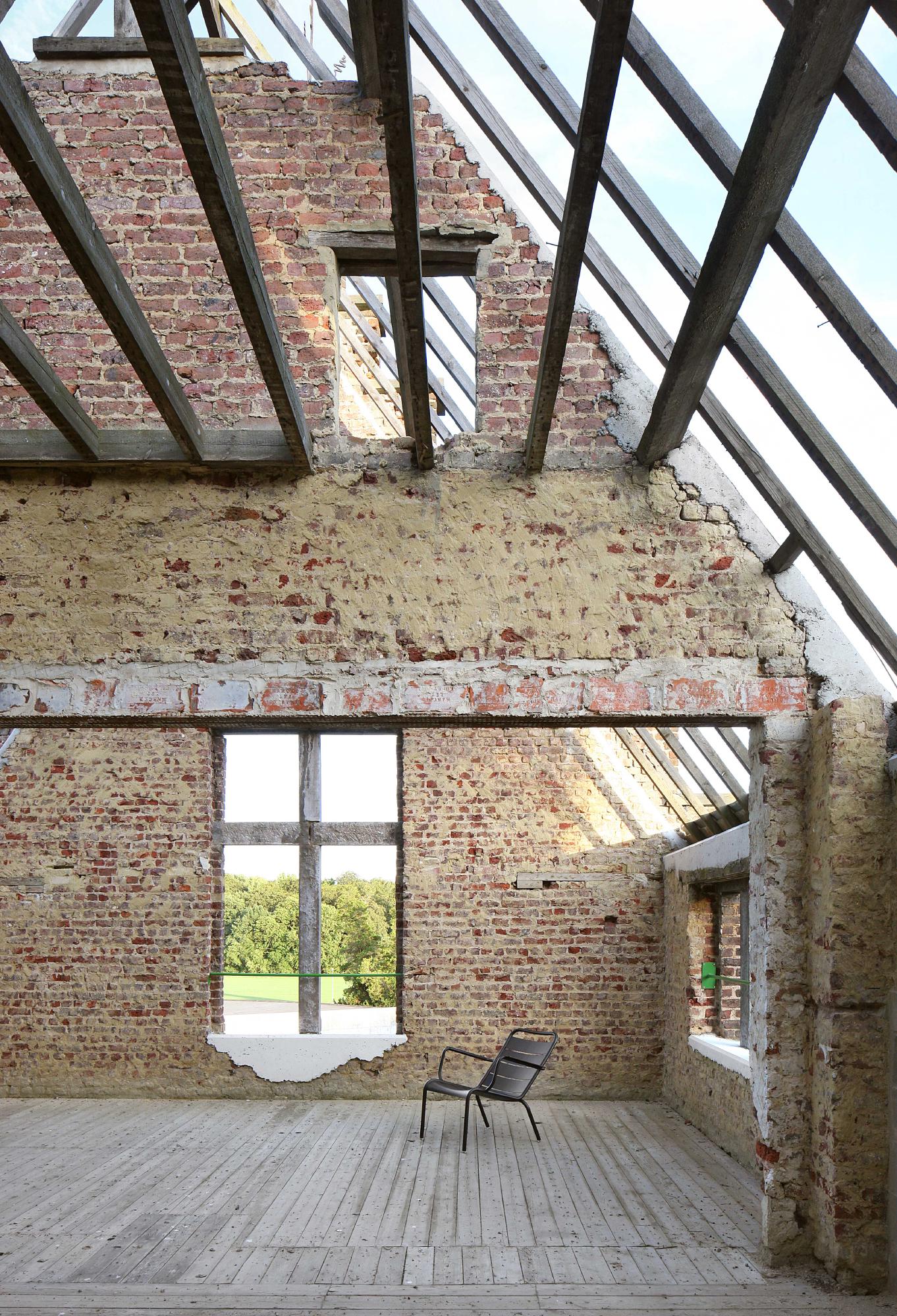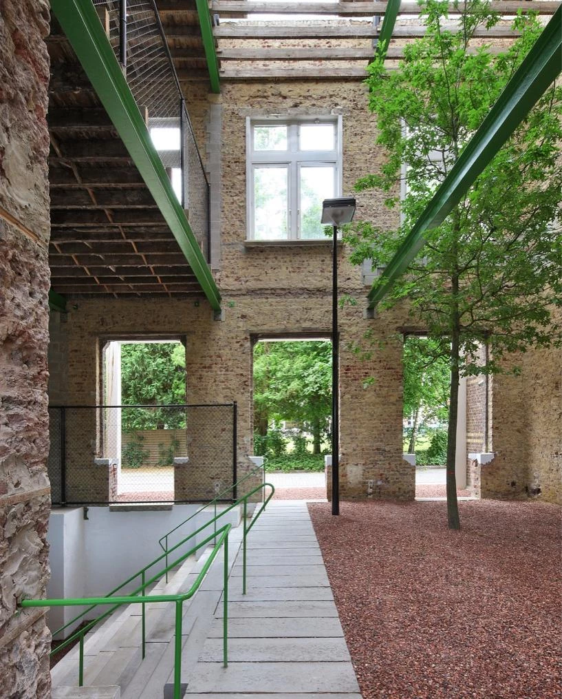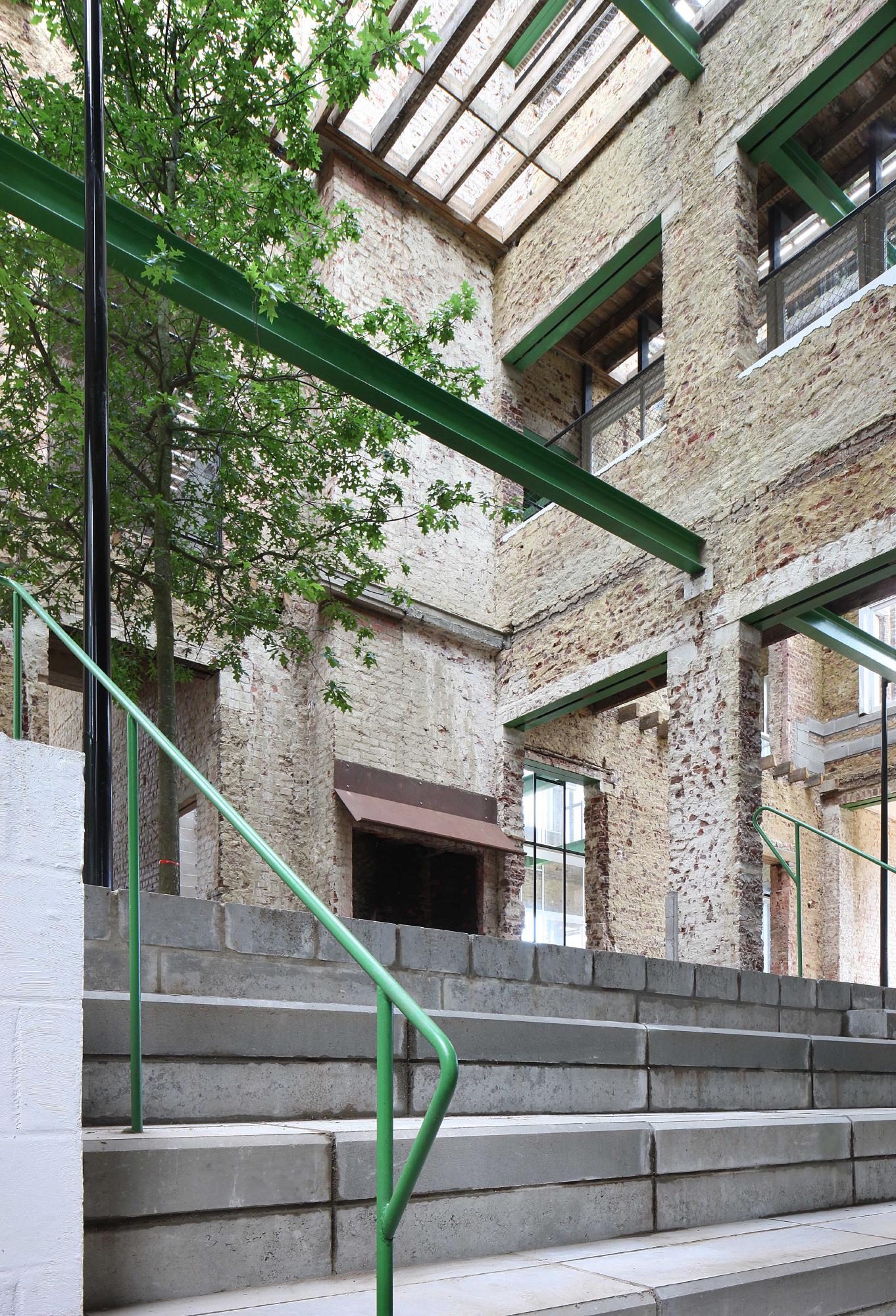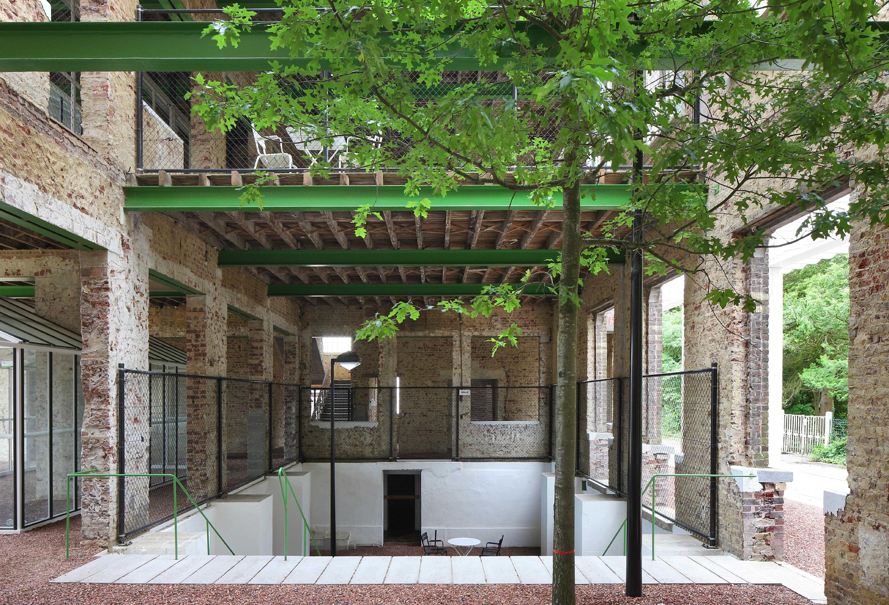 The roof is now glazed and the window openings have been closed with concrete. The renovation includes a series of scattered glass boxes, juxtaposed with a three-floor volume that leaves the traces of time exposed.