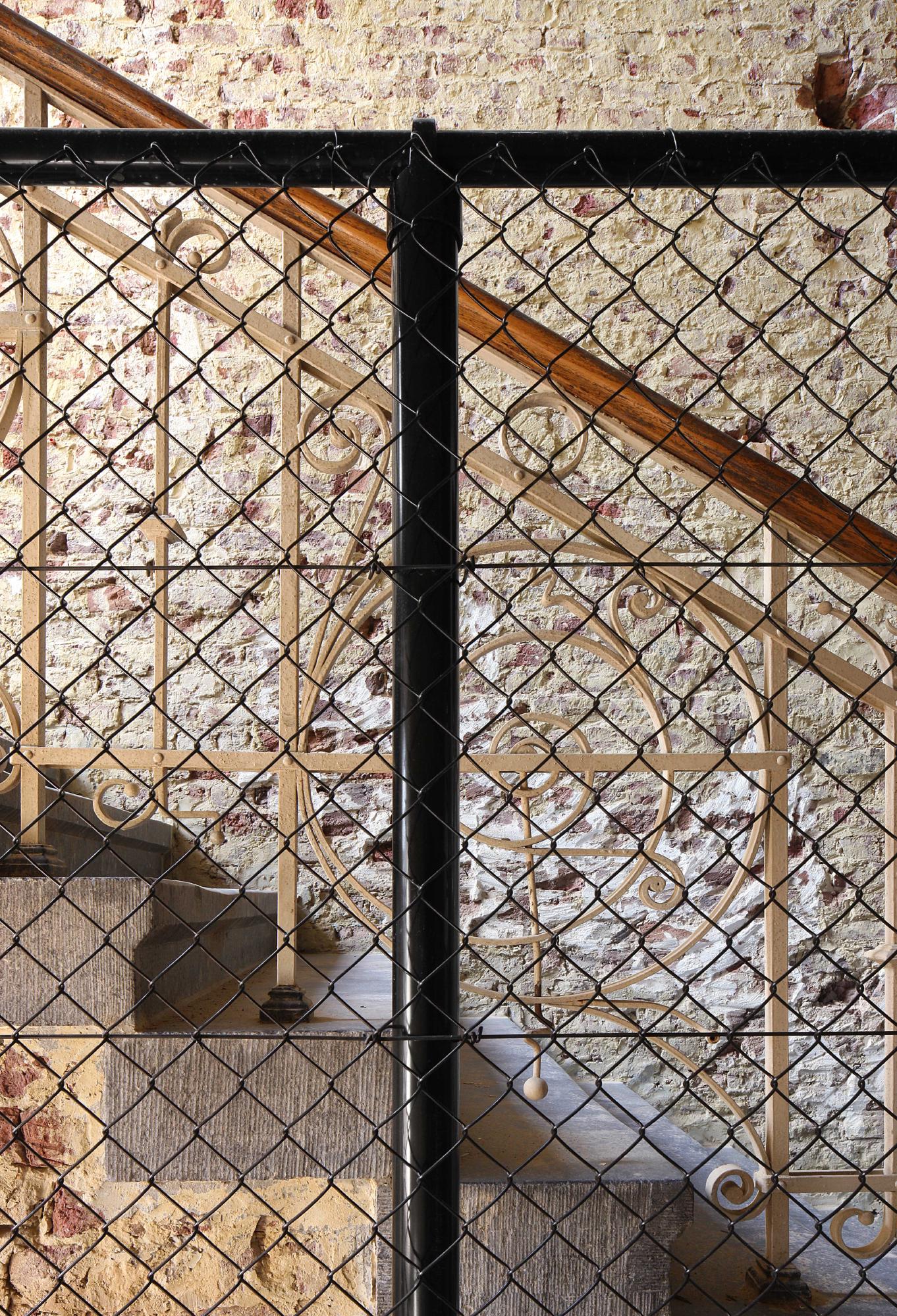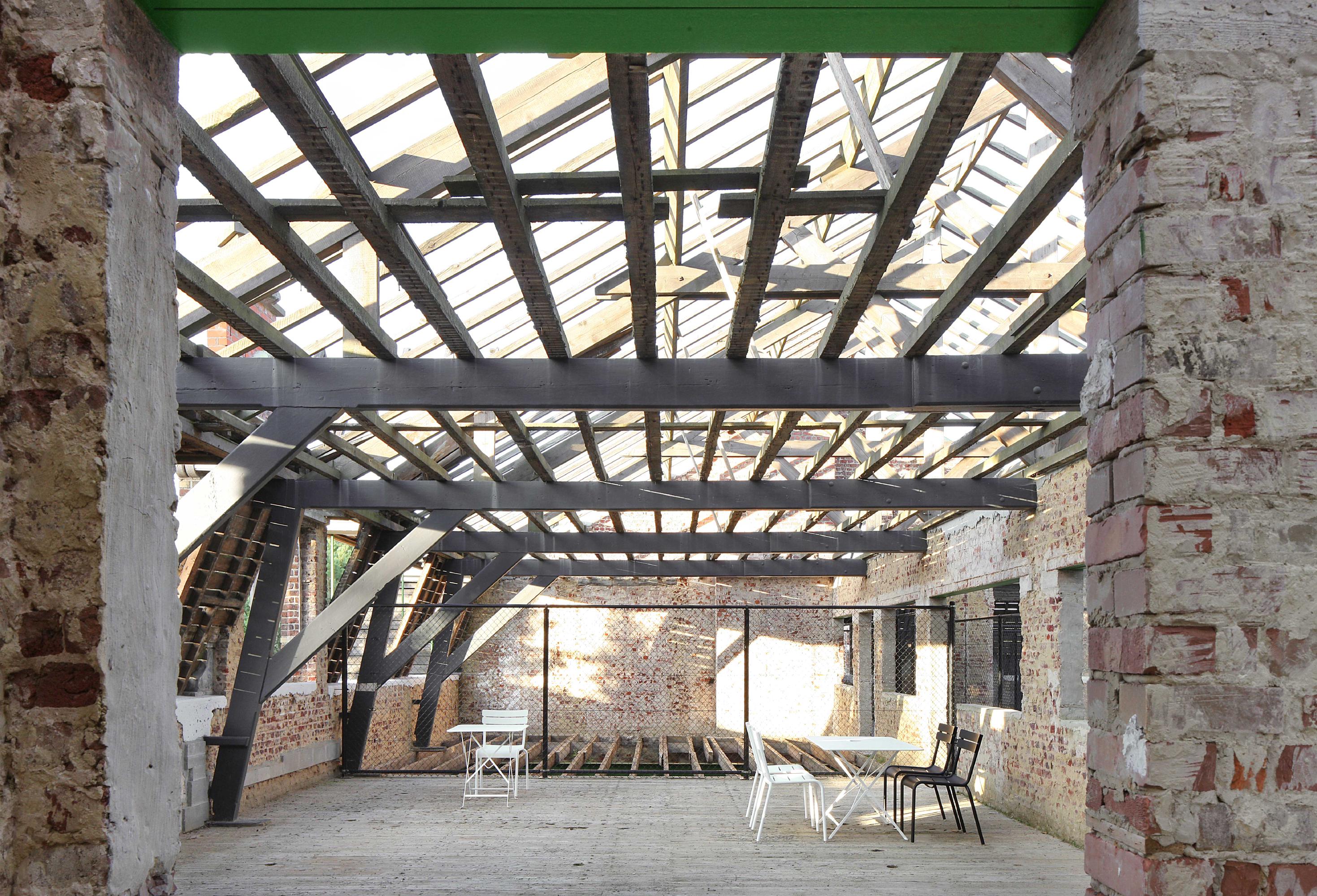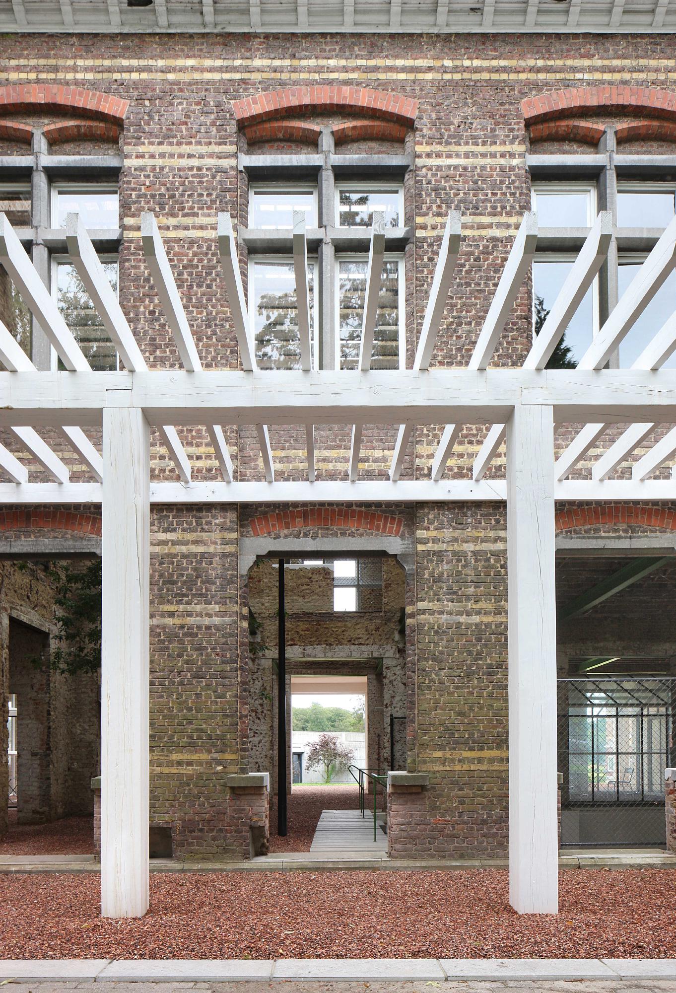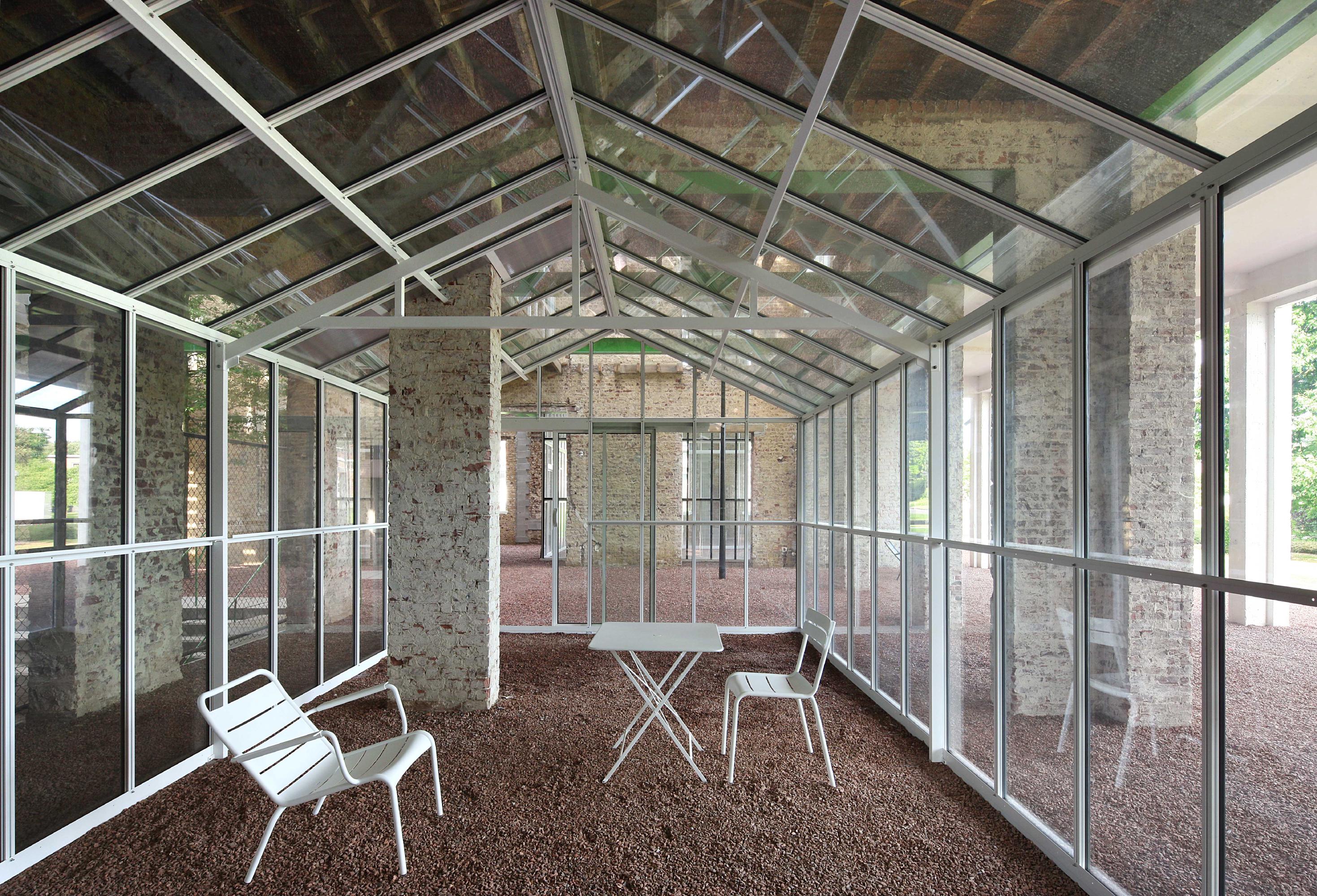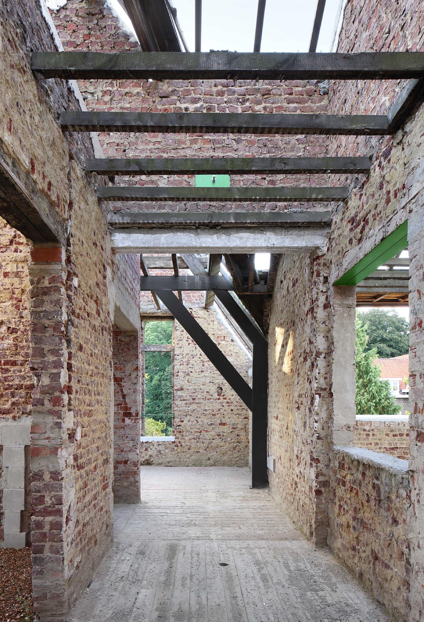 The roof is now glazed and the window openings have been closed with concrete. The renovation includes a series of scattered glass boxes, juxtaposed with a three-floor volume that leaves the traces of time exposed.