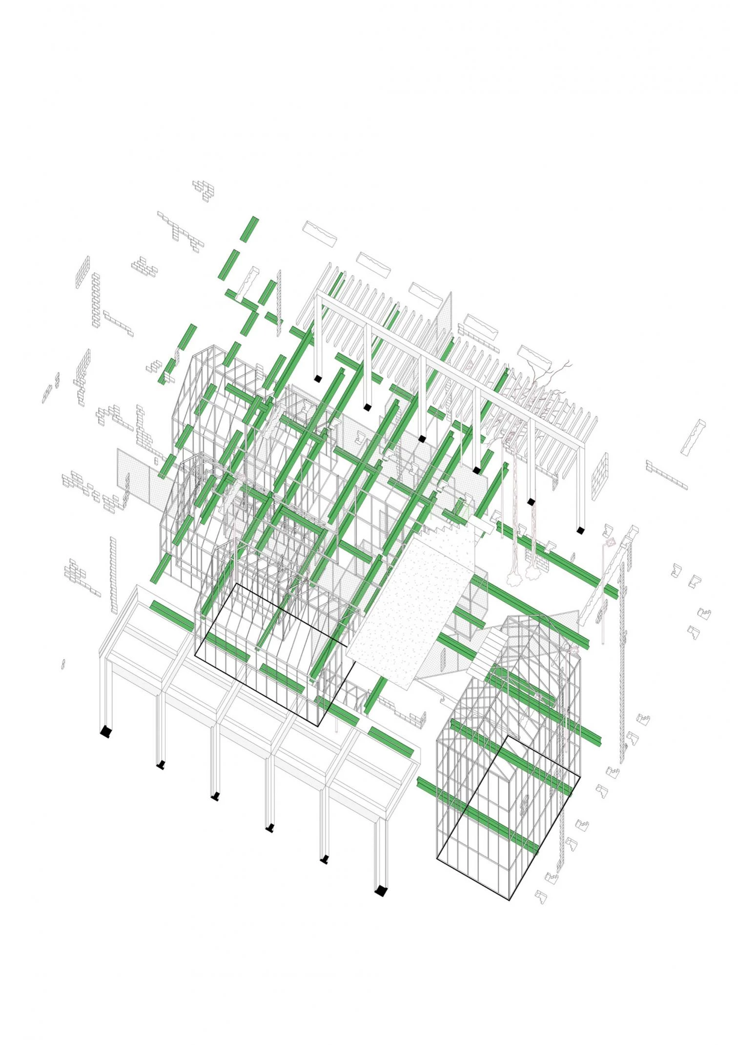 A group of physicians, therapeutists, and patients was formed to conceive a design addressing the needs of the clinic’s users in a building that, though lacking a specific function, would also cater to the desires of the community at large. An experimental public space is created where the lines between interior and exterior are diluted, within an existing construction whose demolition was halted when the tiles of the roof and some windows had already been removed.