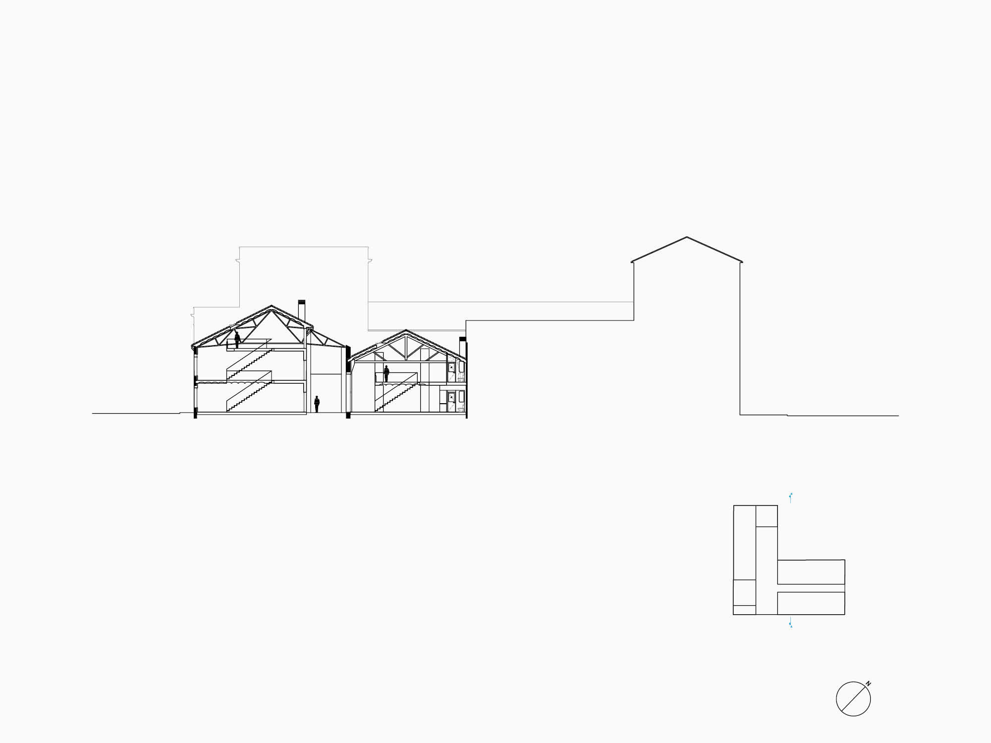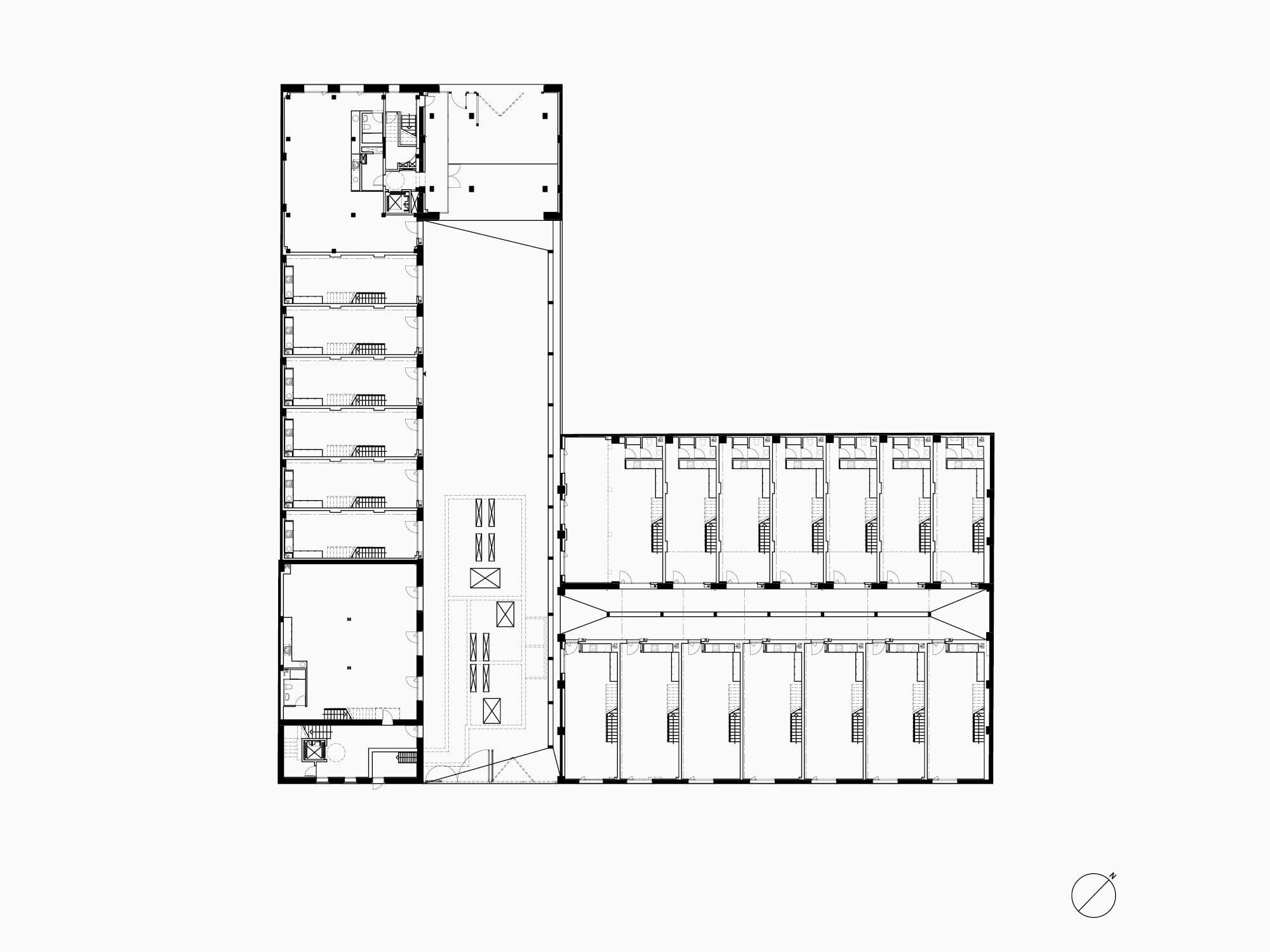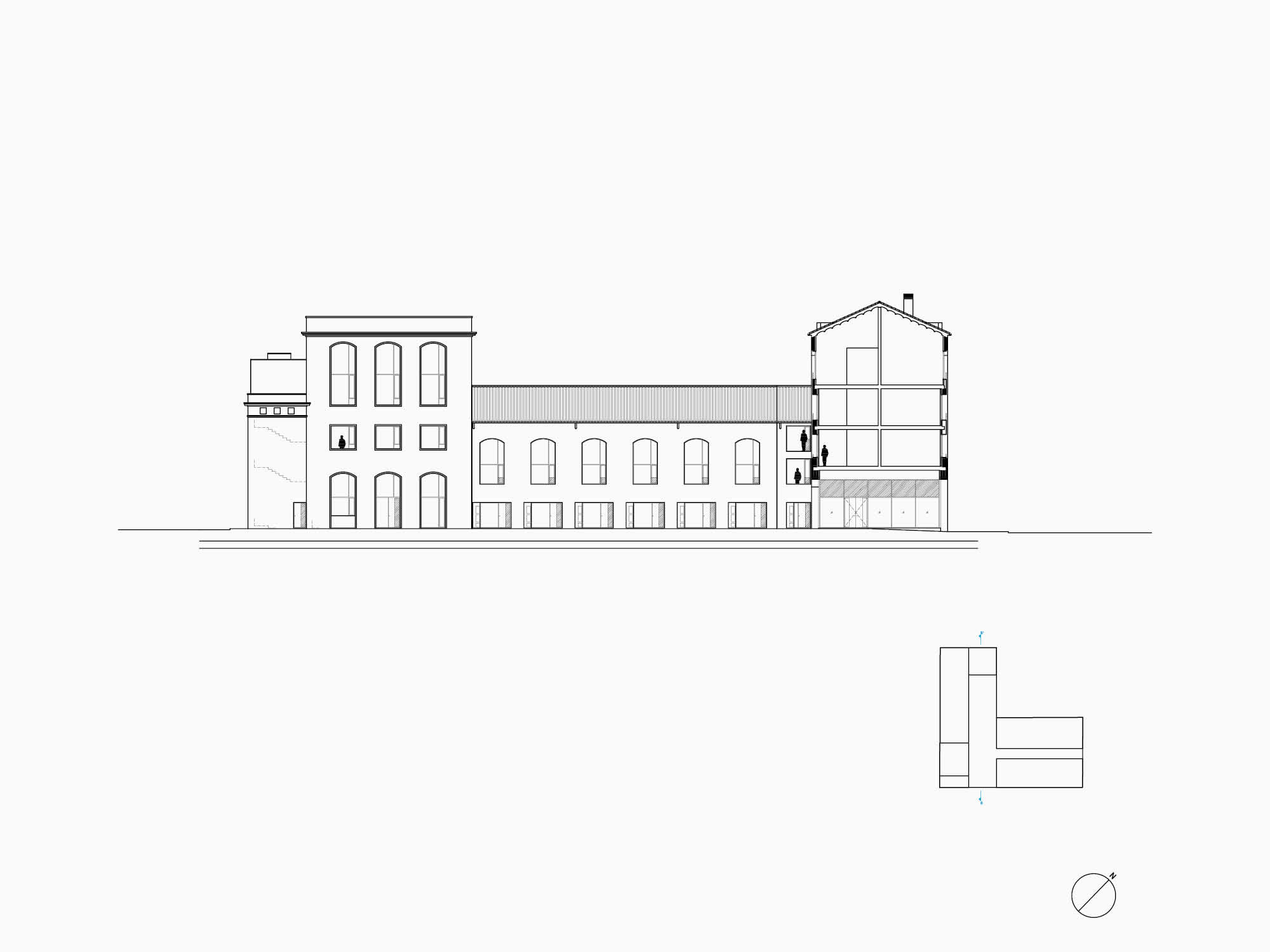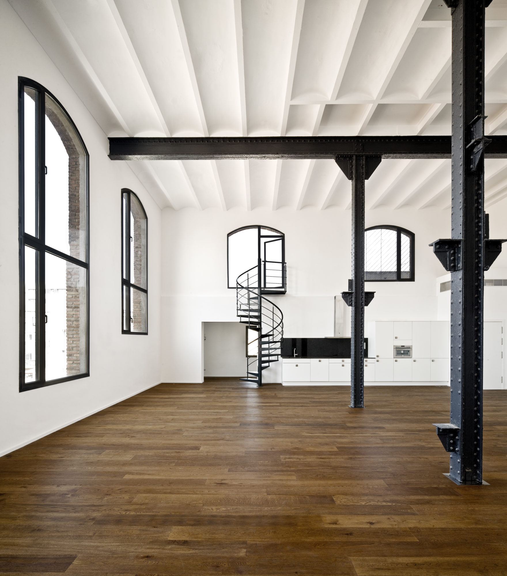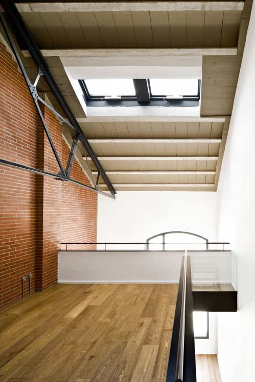 The project took hold in the building elements of the original industrial space. The warehouses were “sliced” vertically following the rhythm of the roof trusses, converting each segment in two- and three-storey lofts. The existing buildings of various levels were reassigned large, open-space single-level units.