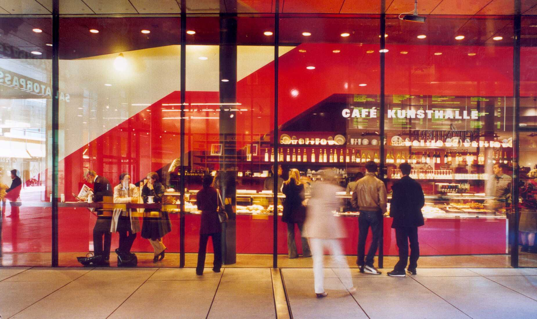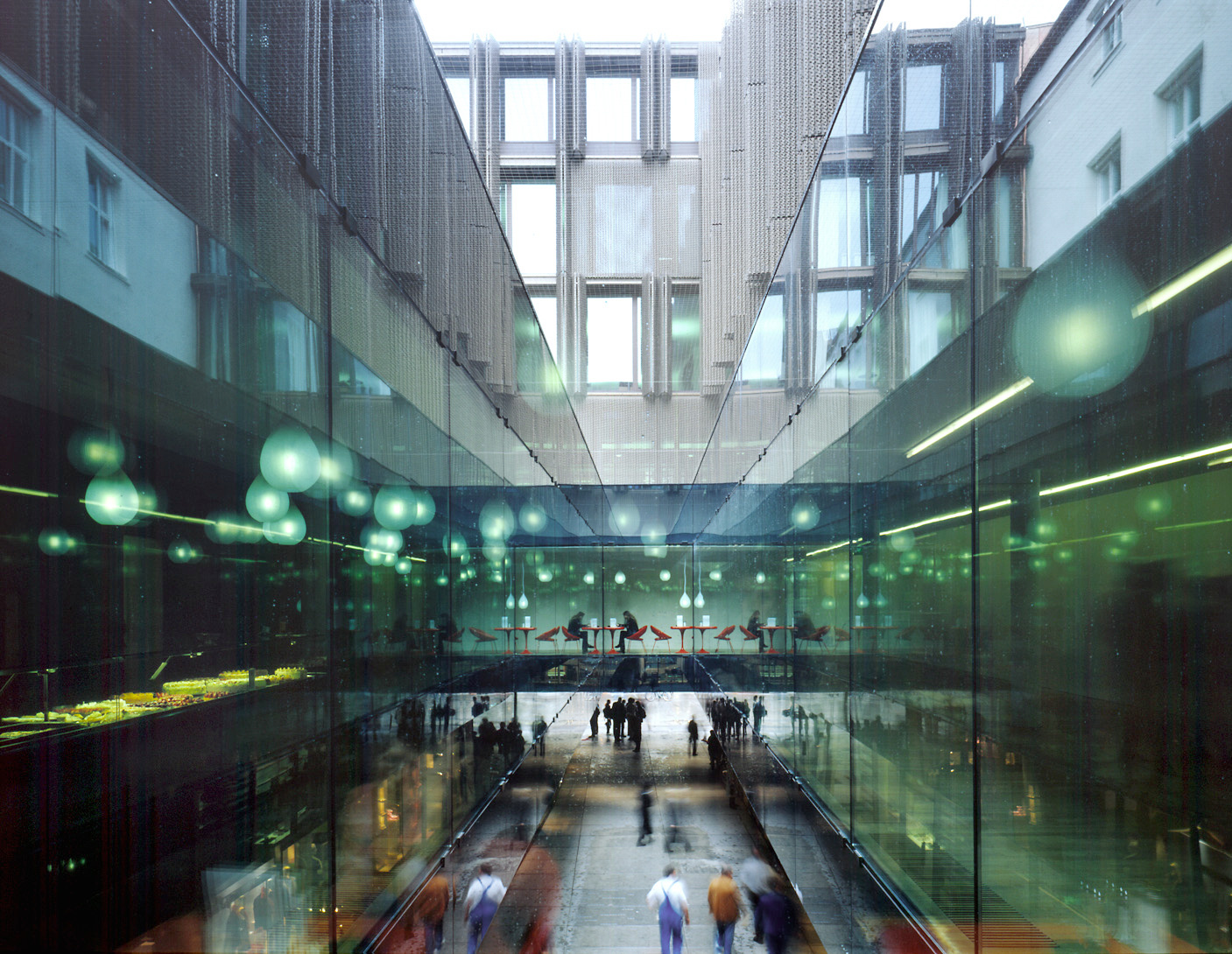 When you walk into the block from Theatinerstrasse, you first enter the Perusahof, a reflecting glass vessel made of large-format windows, a glass ceiling and above it a narrow glass court that visually connects visitors to the Kunsthalle with people walking through the arcade.