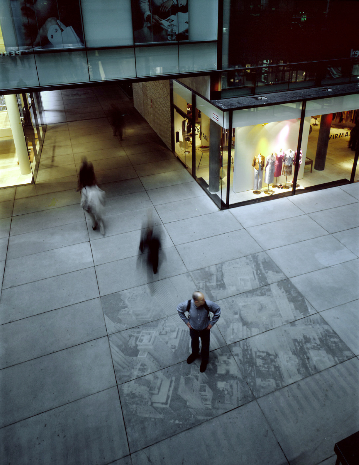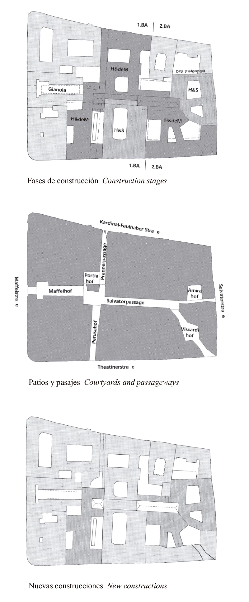 When you leave the block going south, you move from the Salvatorpassage into the Maffeihof, a large rectangular court with a slightly projecting façade above the mezzanine. The Maffeihof, a product of Studio Ivano Gianola, architectural offices in Ticino, and originally designed as an independent project of the Vereinsbank, easily dovetailed from the start with the urban concept developed by Herzog & de Meuron.