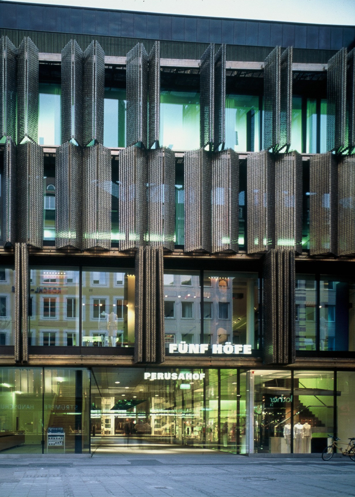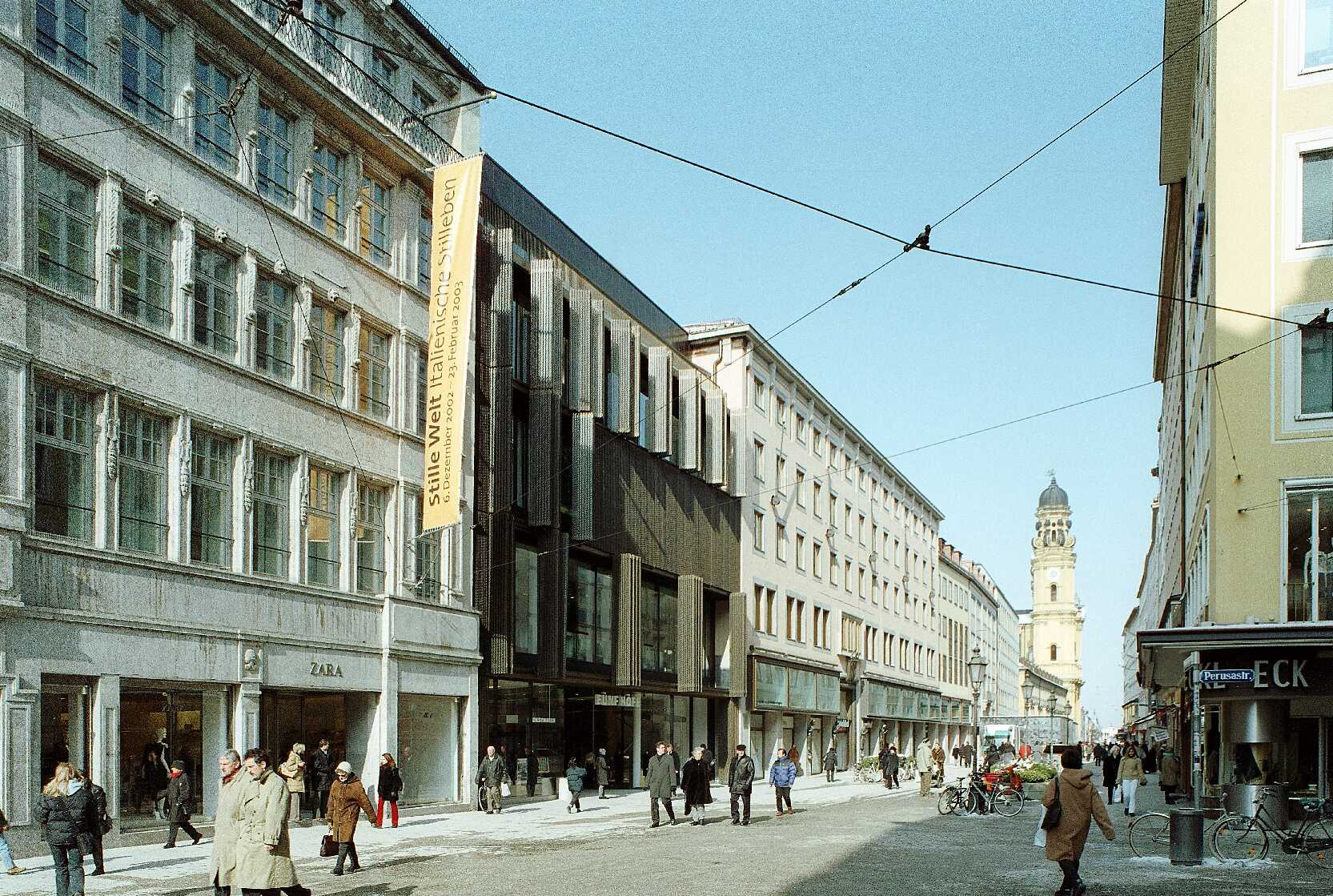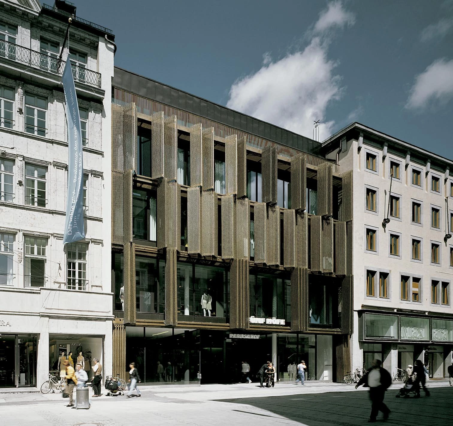 Haus Theatinerstrasse 8, the only new building, extends from the interior of the block to the street front, with its multi-layered façade producing varying effects both inside and outside. The external skin of bronze elements guides the perception of the environs and the buildings, and operates with seemingly incompatible opposites, such that depending on the time of day and the lighting, the building oscillates between open and closed, light and heavy, bright and dark, metallic and textile.