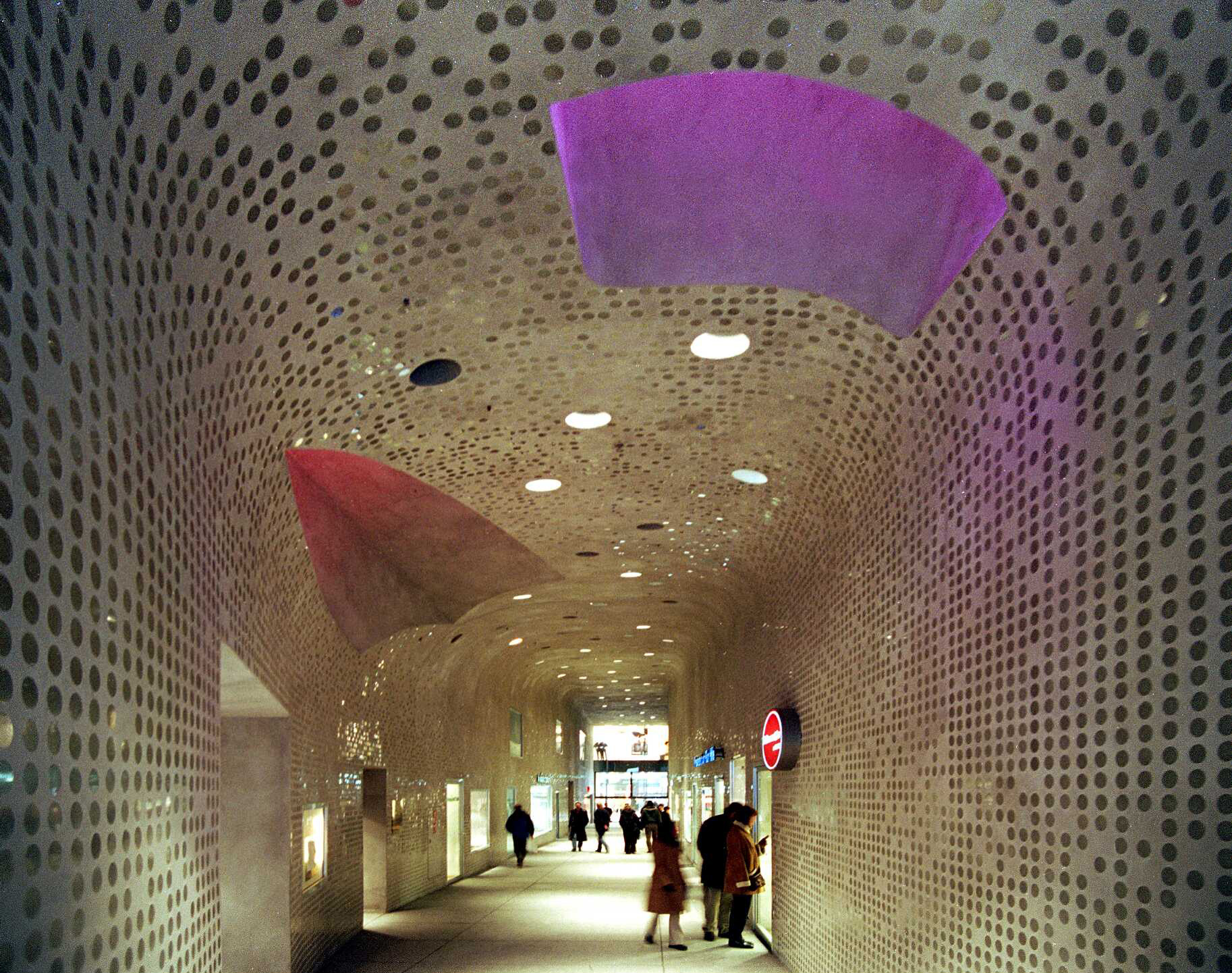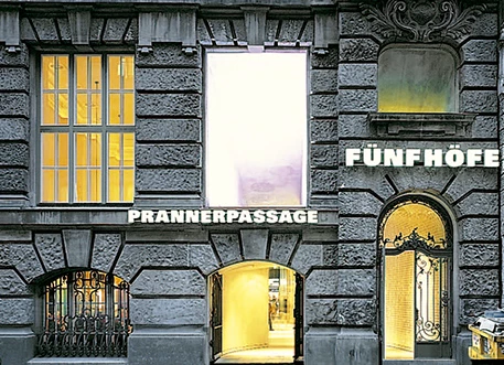 From Kardinal-Faulhaber-Strasse, the Prannerpassage leads into the interior of the Five Courts, upon passing through one of the two small openings in the Neo-Baroque Stadtpalais, you enter a vaulted space with glass sequins set into the plastered walls and the vaulted ceiling, which glisten in the oblique light. Four fingers move, as if into a glove, towards the existing openings of the façade, allowing pedestrians and light to enter the passage.