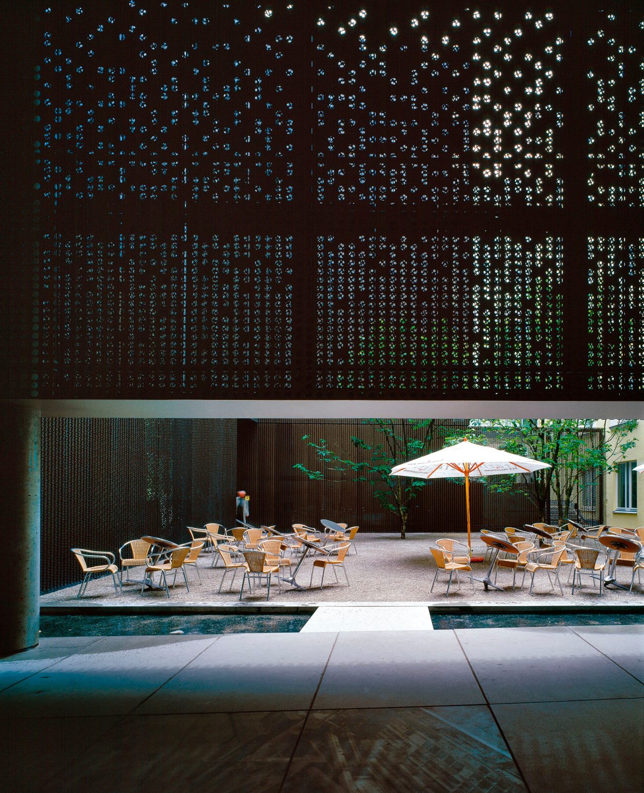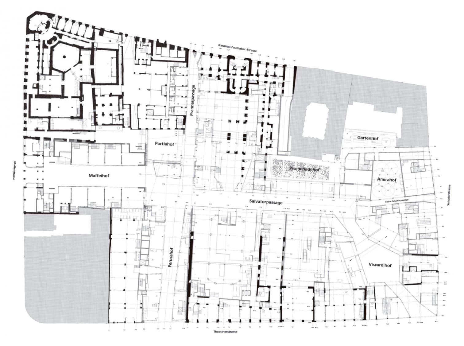 The project is a puzzle assembled out of a number of different building blocks or pieces. But these blocks are not buildings; they are courts and arcades or passages which establish a new order. The shapes of the buildings act like fillers in the spaces cut out of the interior of the block. Circulation through the Five Courts is defined from east to west by the Perusahof and the Prannerpassage, from north to south by the Viscardihof, the Salvatorpassage and the Maffeihof. Upon completion of the first phase of building in February 2001, three of the five courts were inaugurated: the Maffeihof, the Perusahof and the Prannerpassage. In June, the Kunsthalle reopened with twice as much gallery space as before.