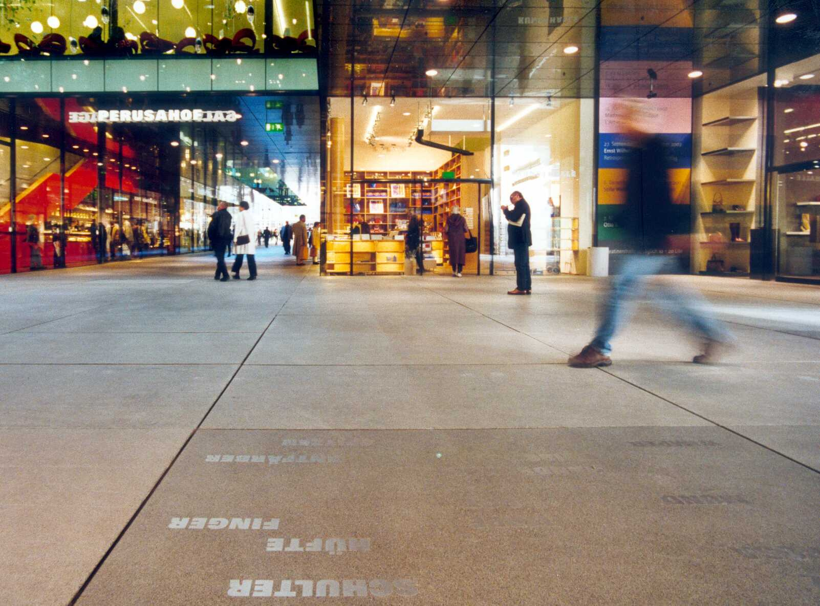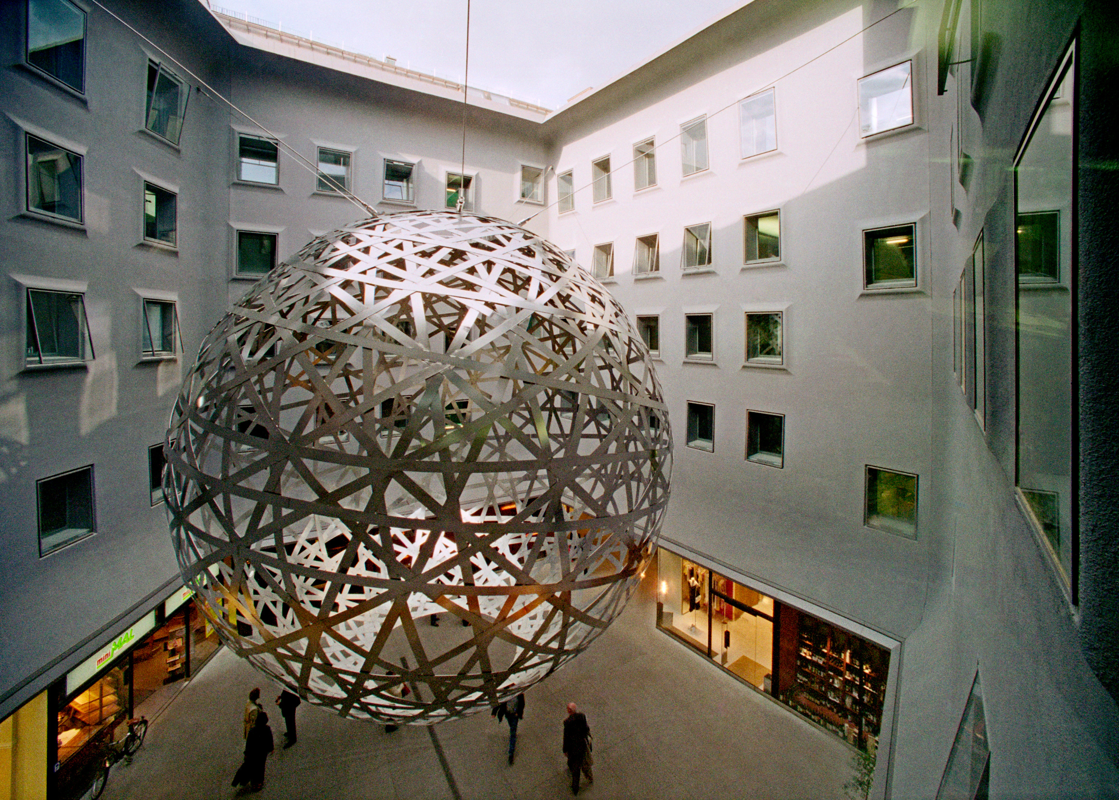 In collaboration with the artists Rémy Zaugg, Thomas Ruff and Olafur Eliasson, the courts have been given a distinctive appearance so that strolling through the complex becomes a lively and diversified urban experience. Artist Olafur Eliasson, from Iceland, complements the character of the architecture with his suspended spiral sphere. Rémy Zaugg’s text pictures and color designs are placed on the walls and the floor throughout the arcades and lead to a variety of associations and encounters. Photographs by Thomas Ruff have been printed on 12 panels set into the ground and reflect the history of various places.