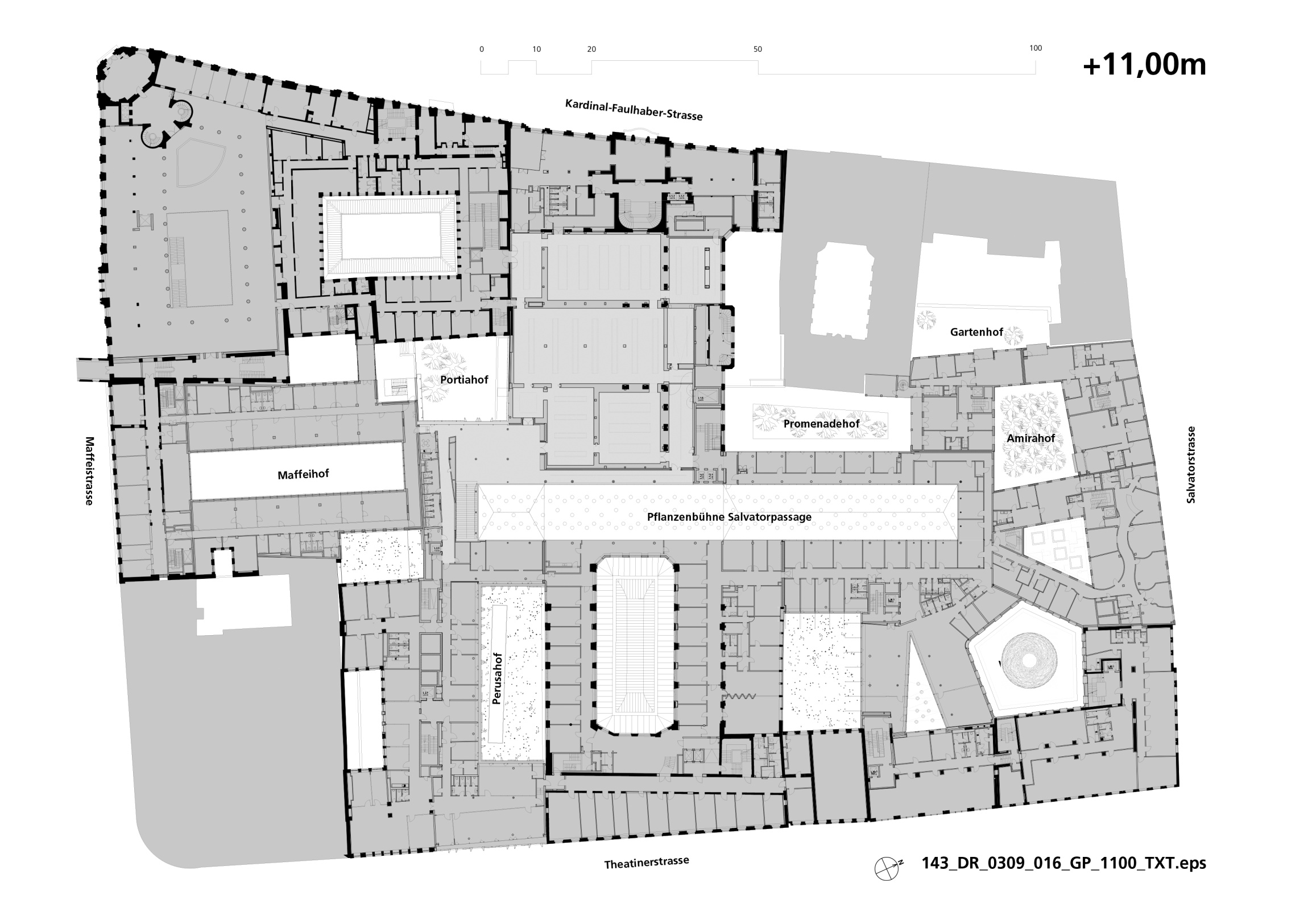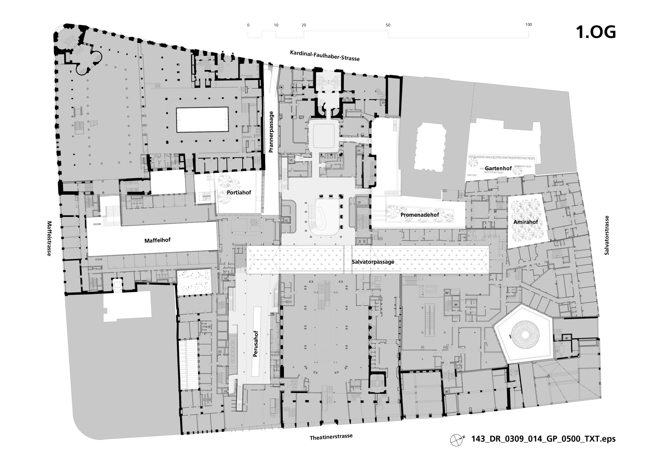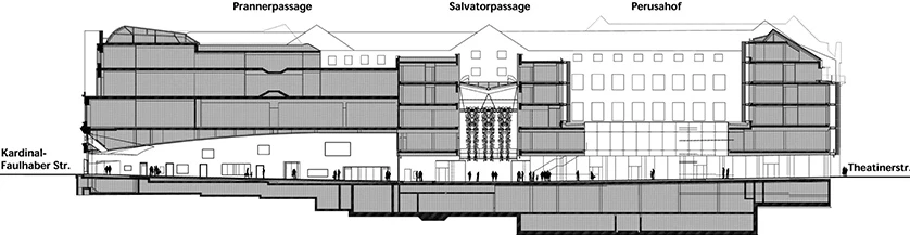 From the Salvatorpassage, the path leads in the direction of Odeonsplatz via the Viscardihof, a pentagonal courtyard with a grey finish, rounded corners and spaciously vaulted upper and lower edges, rests like a large vessel above the shopping level. The windows, some flush with the façade, others protruding, add to the plasticity of the whole. The ground floor and part of the first floor accommodate mostly small and medium-sized retail shops, cafés and restaurants; the remaining floors above accomodate office space of various sizes and 27 flats facing Salvatorstrasse. Inside the block there is an underground garage for tenants.