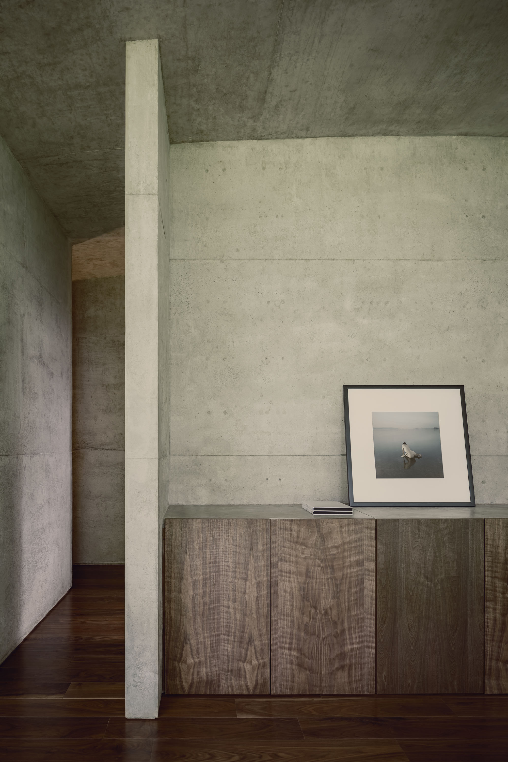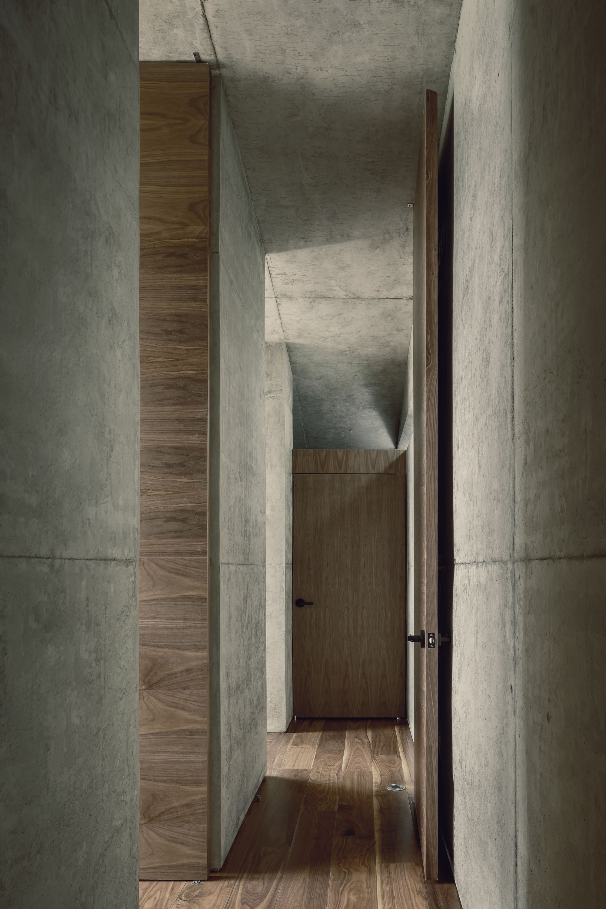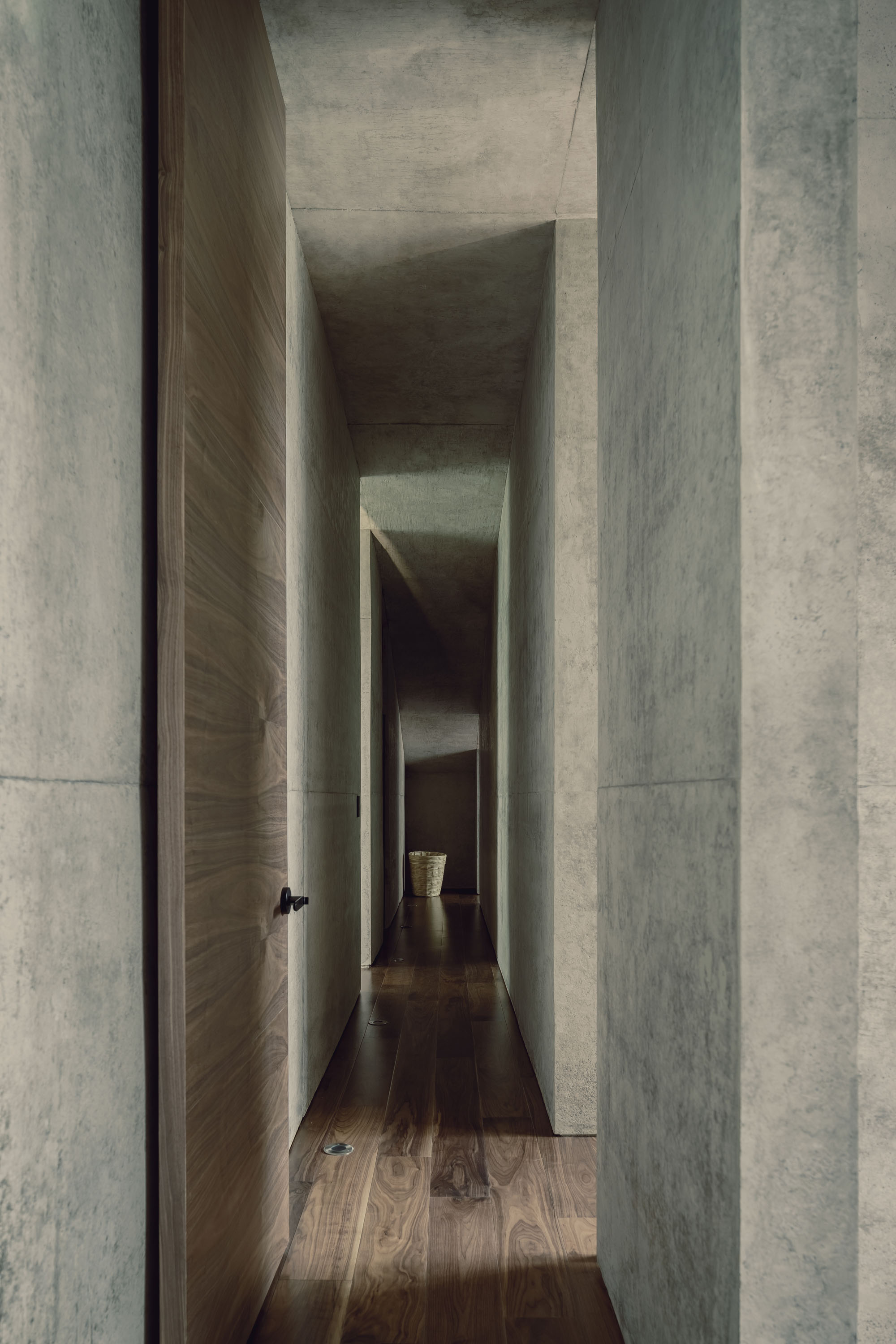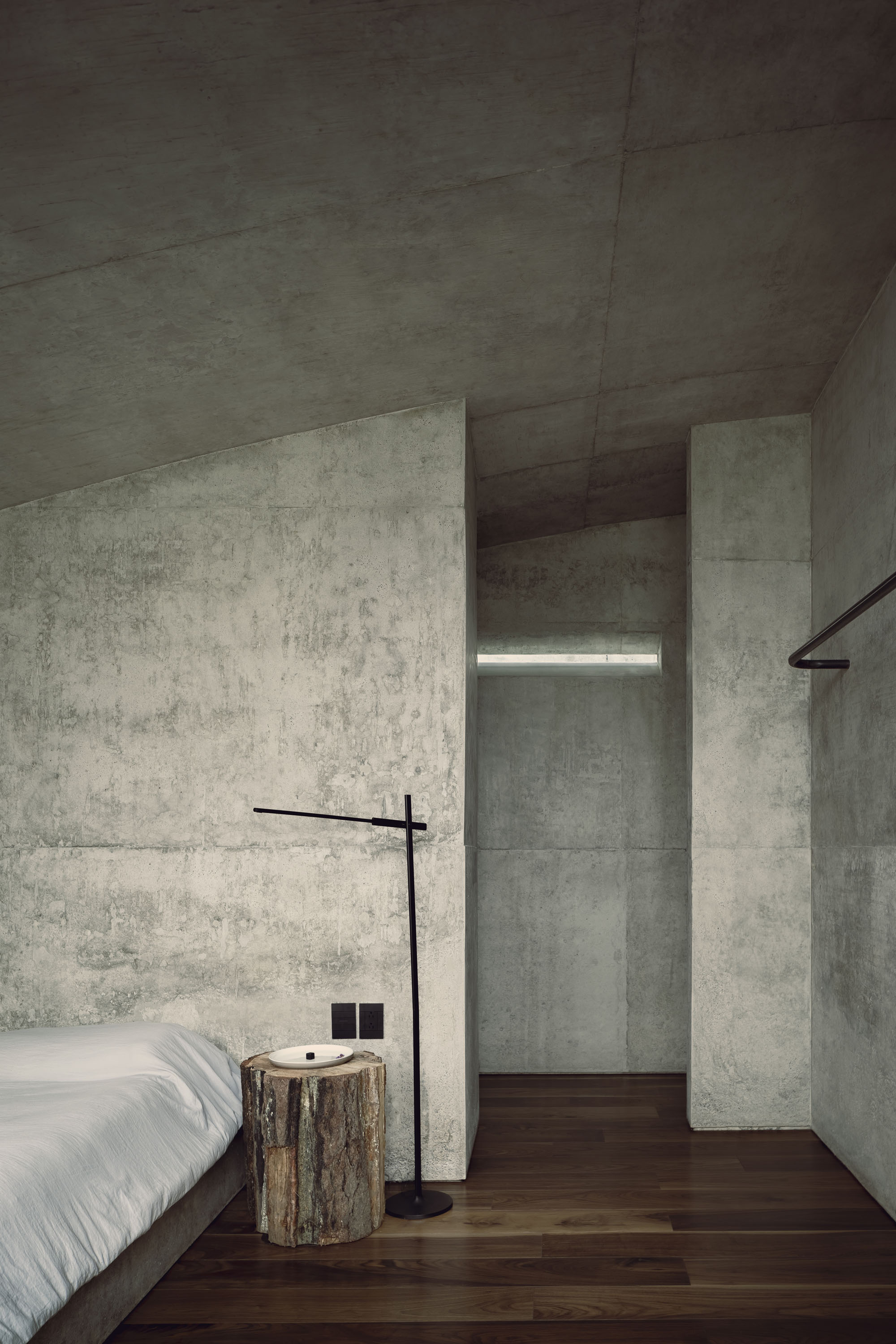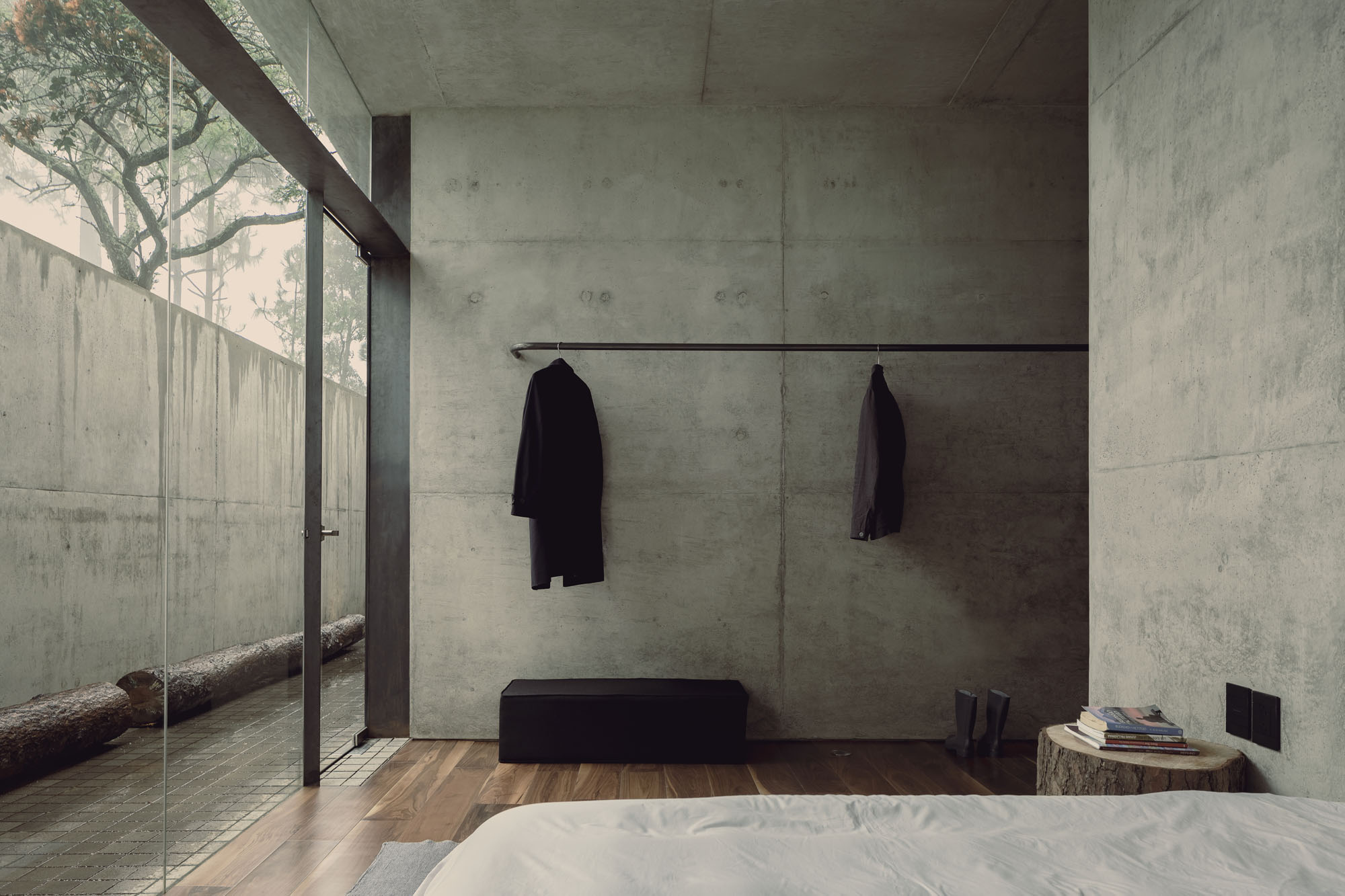 Concrete was chosen as the main material because of a dream of this new rock melting while inevitably interacting with the forest, changing colors… grays that turned to greens, blacks and yellows that were gradually incorporated into the environment. The flooring would emphasize the aroma of wood perceived when you are surrounded by pine trees, giving balance to the cold temperature of the concrete. Finally, steel took place because, with time and rainfall , it acquires the look of tree bark. As for the spatial organization, the public areas are completely exposed to the wooded ravine on the left side of the house; the private areas on the right side open more timidly to a courtyard that allows to see the sky and the top of some trees but shuts down a bit from the outside. It was important to have the least possible references to elements that would connect to a specific moment in time, so the refrigerator and appliances were hidden, the lighting was arranged very discreetly, and only the four main materials were included: stone, wood, concrete, and steel. It was very important for the client to preserve the rough and primitive atmosphere of the mountains.