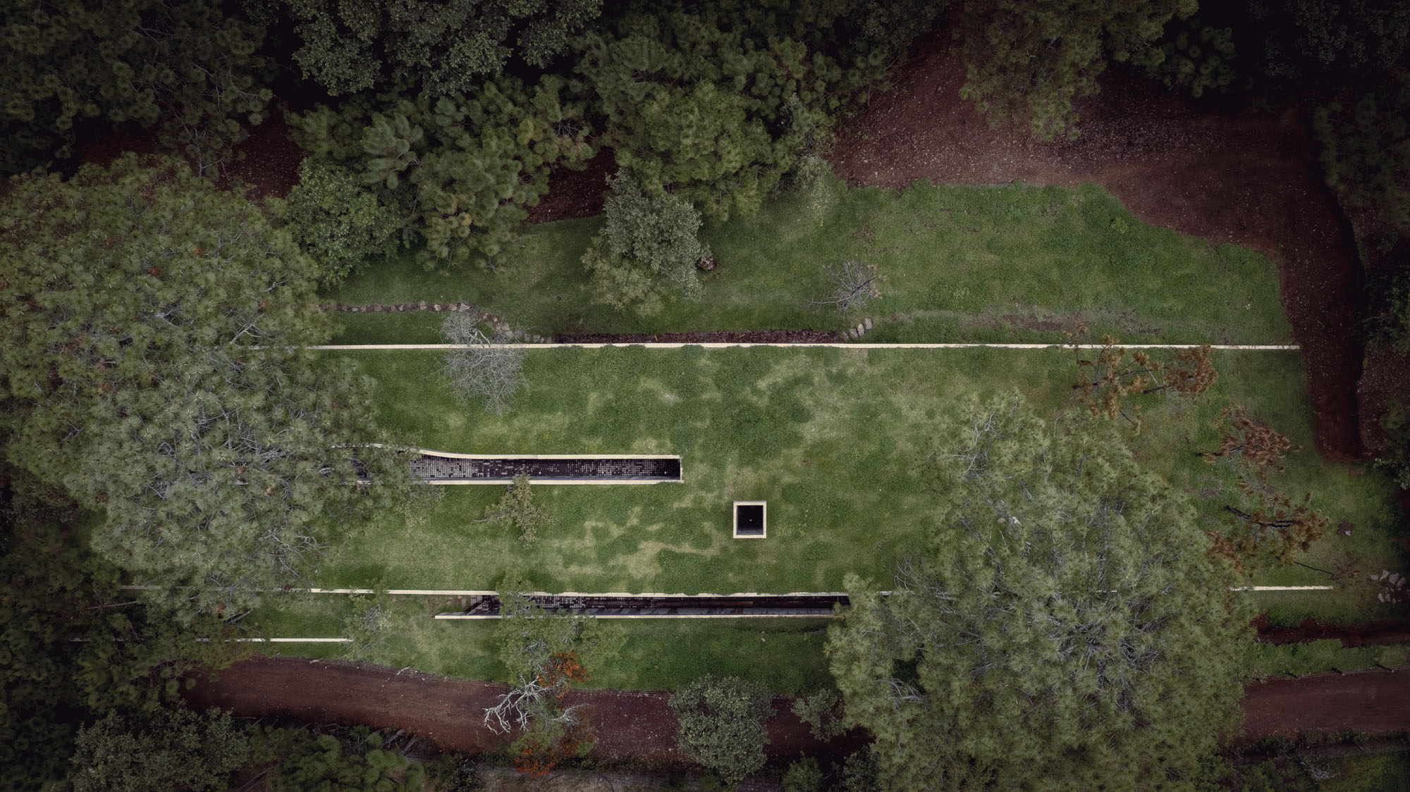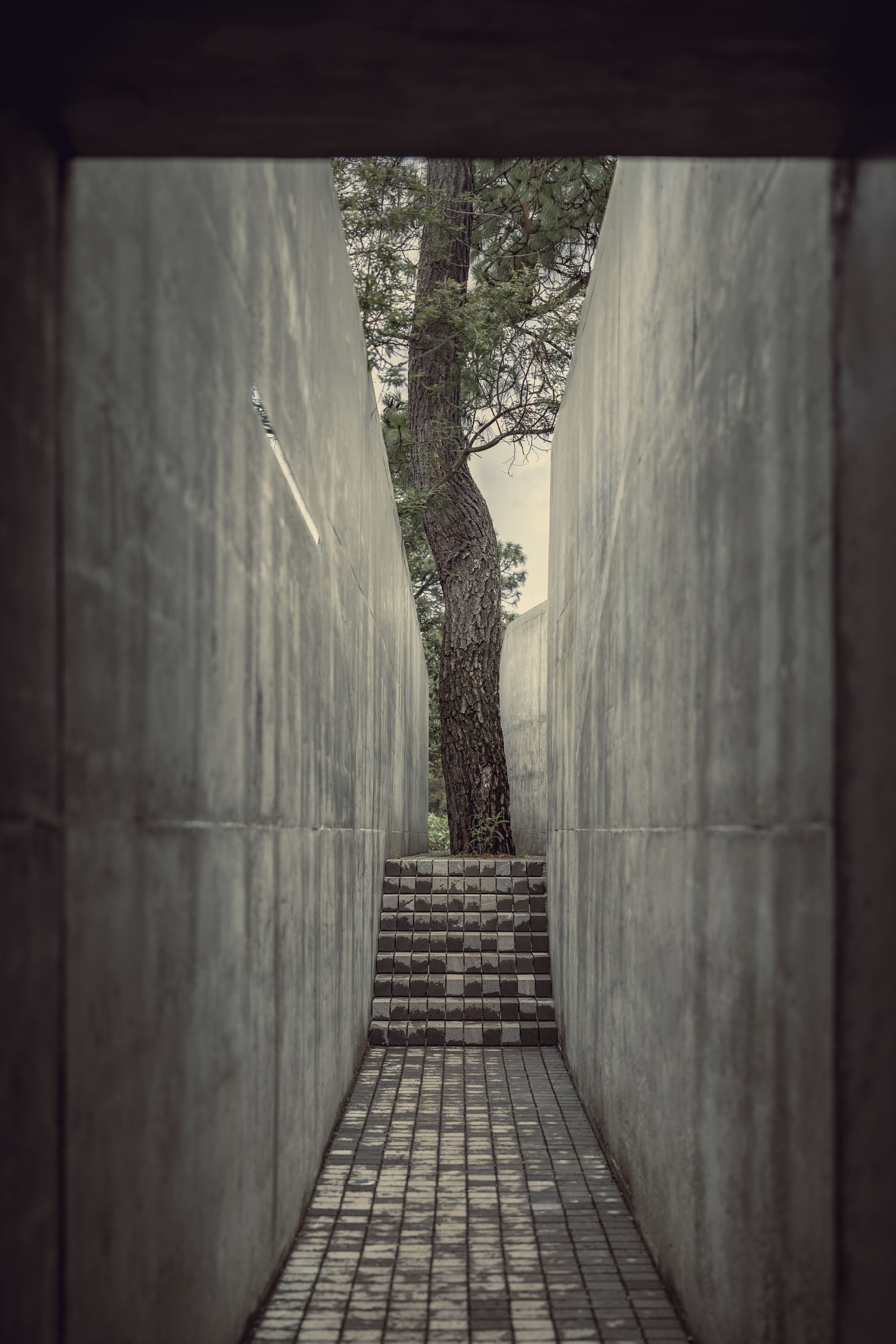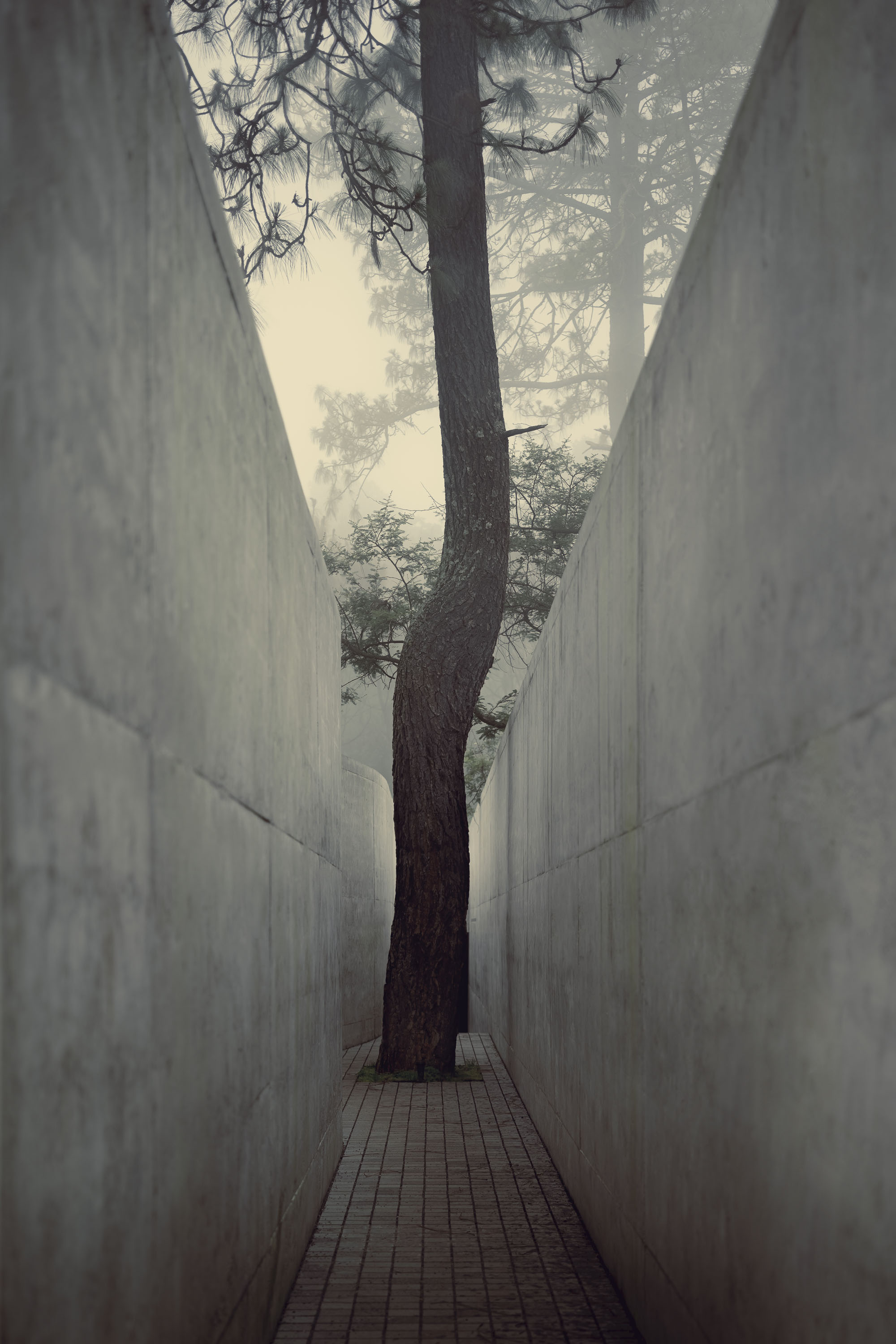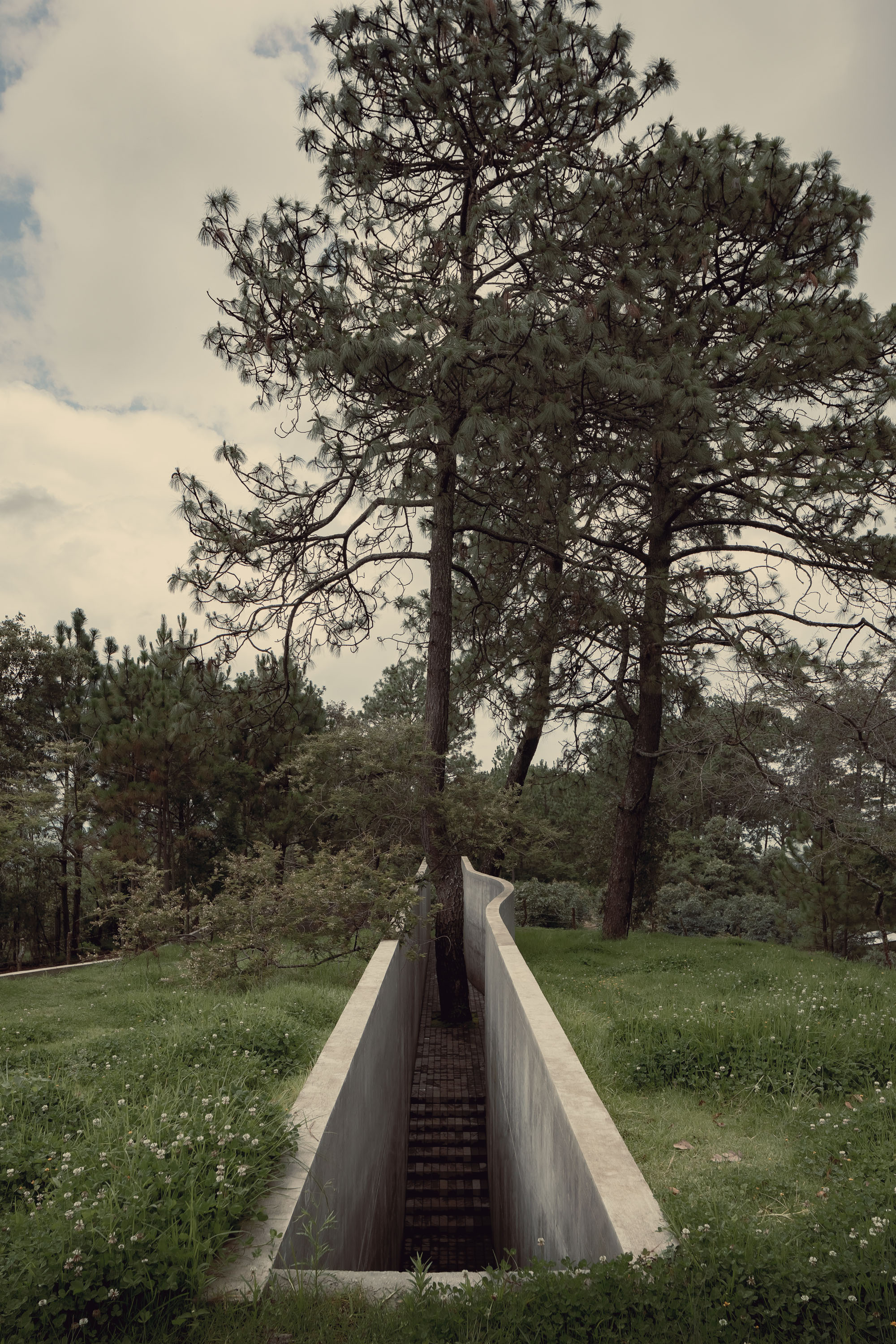This path is wide enough to walk it comfortably alone but too narrow to do it accompanied. Visitors are cast into a solitary pilgrimage that leads to an old tree with such a significant presence that it was necessary to distort the linearity of one of the walls with a gentle curve to make it possible to pass next to it…so close that it is even possible to graze it as we walk by. After crossing the tree threshold, going down a few solid pearled stone steps, and opening a heavy steel door, a concrete vault stands there. It supports the loads of the green bed sheet that rests on it and gives a sensation of being inside a cold, dark, but strangely cozy cave.