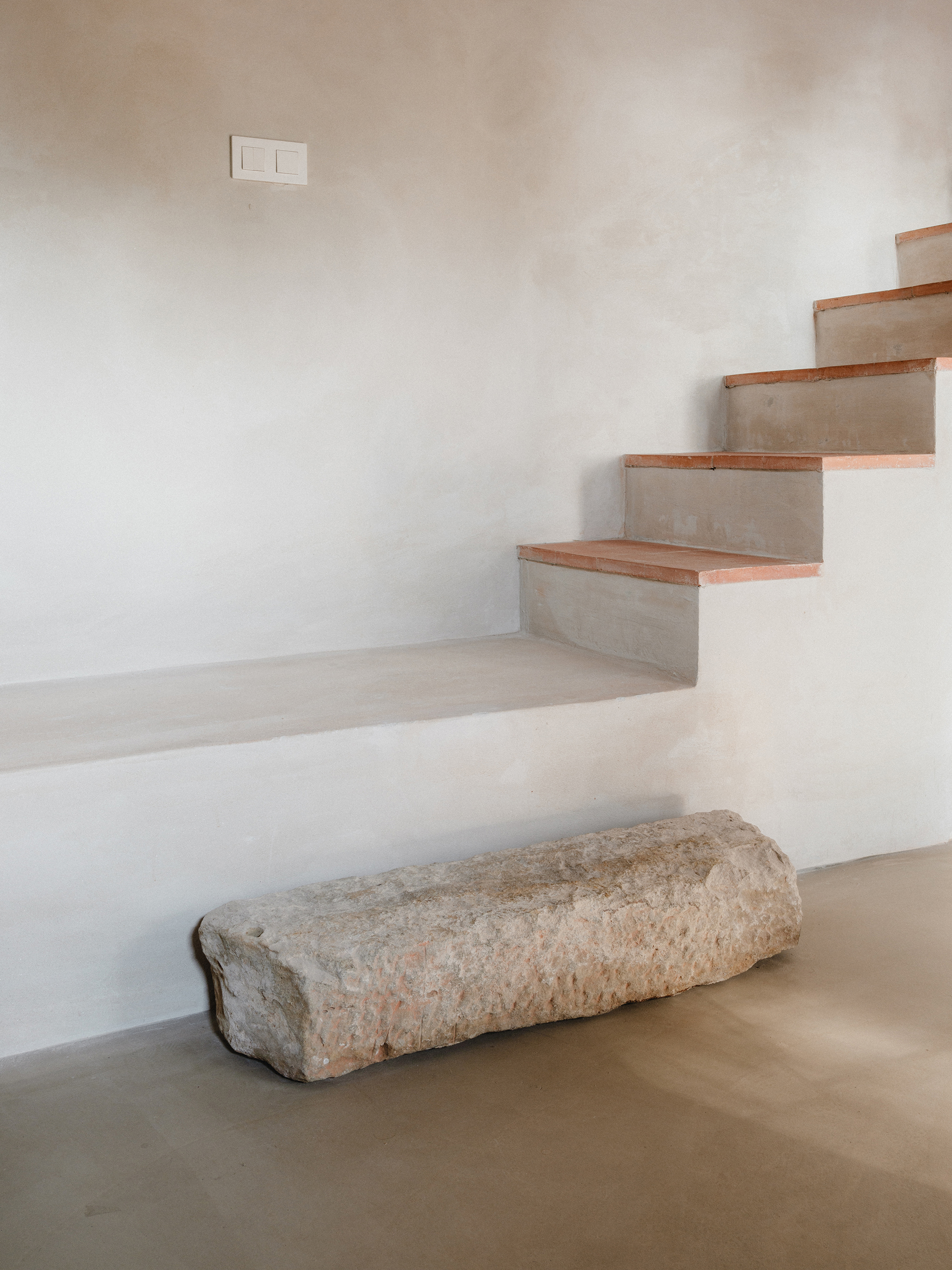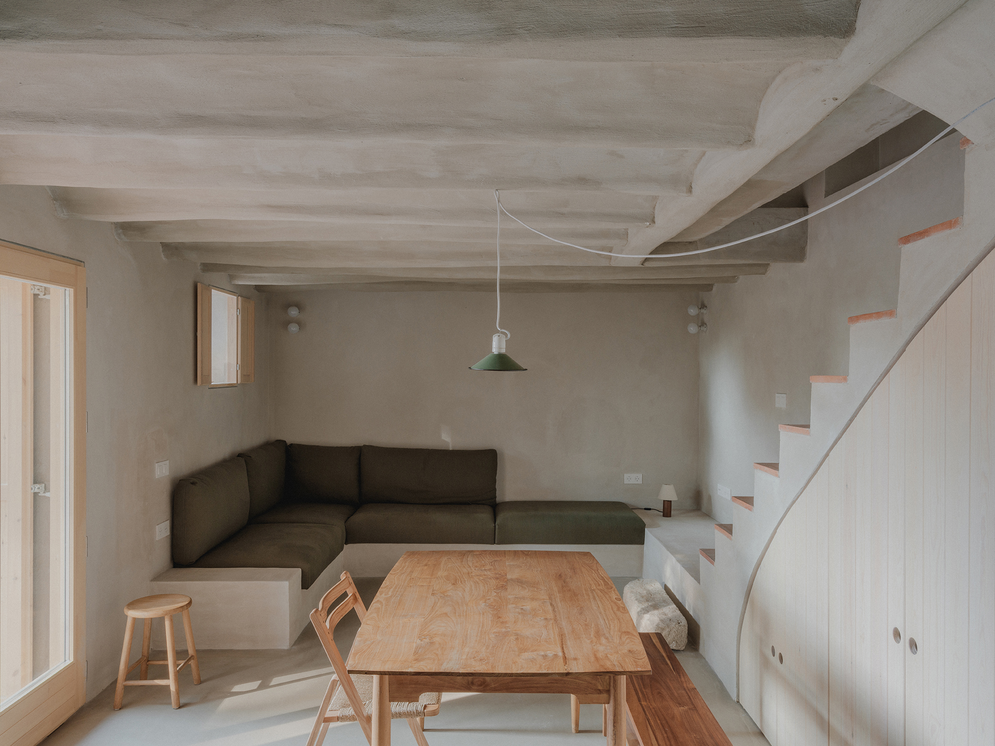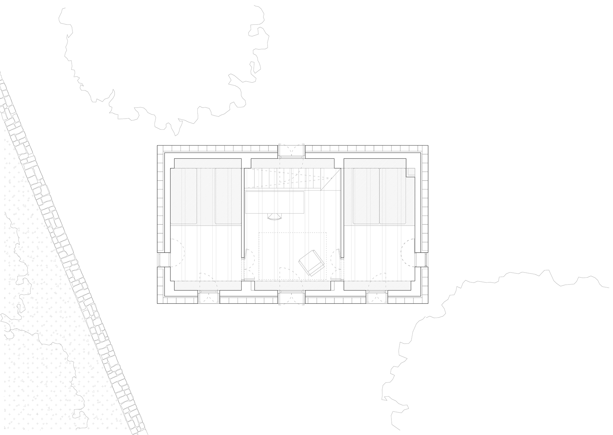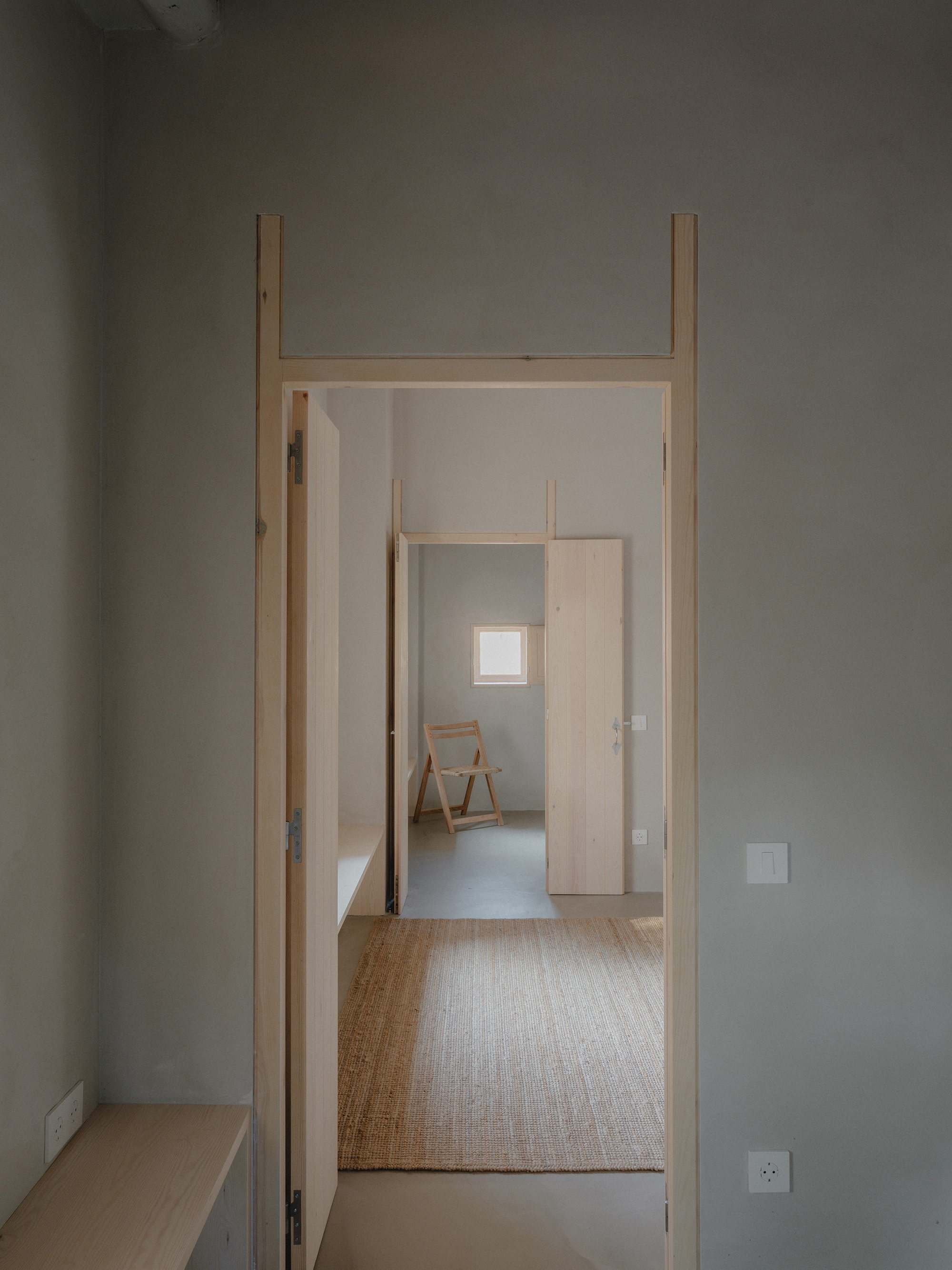The upper floor maintains the original layout, in which three spaces of similar proportions are aligned with two doors. The central space, with a singular height in comparison to other buildings with similar characteristics, provides access to two rooms, one at each end. Only the essential elements for inhabiting these spaces are constructed, such as a platform for a bed and a bench under the windows, embedded within the original pilasters.