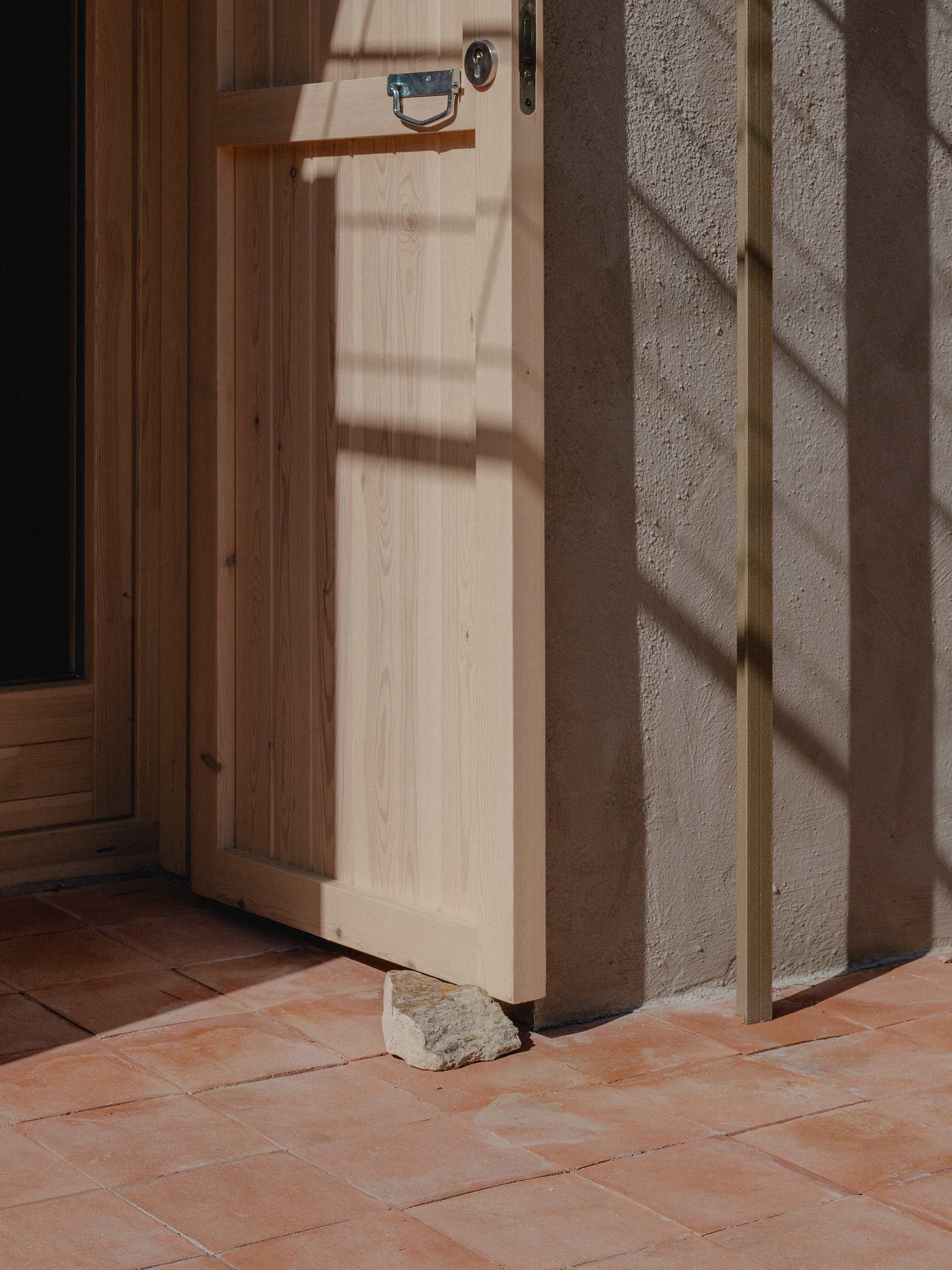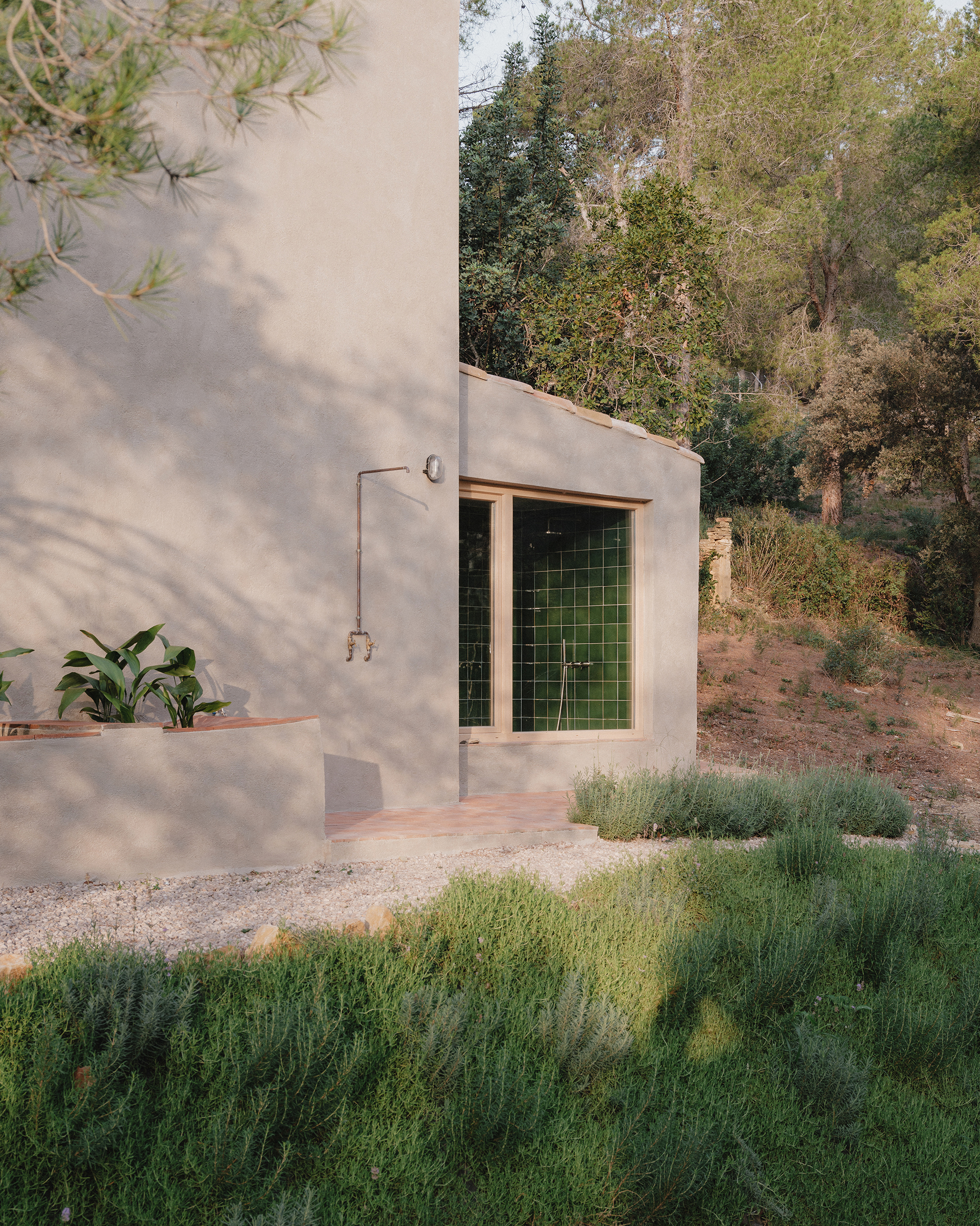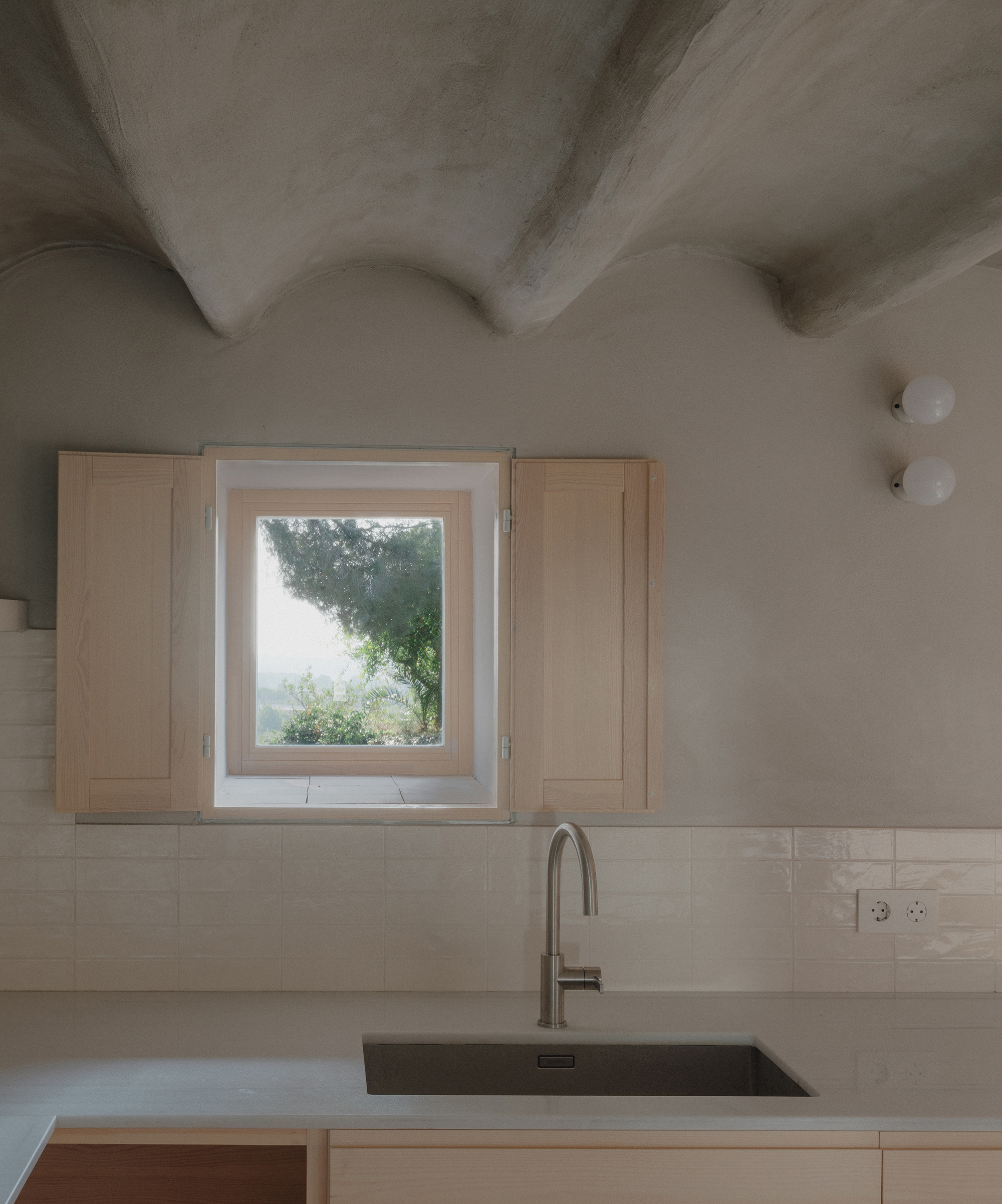 The project’s philosophy extends to the exterior, where a series of minimal interventions aim to ensure the integration of the building with the environment. Existing terraces are consolidated, old stone walls are restored, and new ones are built. A pergola is constructed on the main facade to bring back a previously existing grapevine. The old watering trough is turned into a planter, and slopes are consolidated with native vegetation.