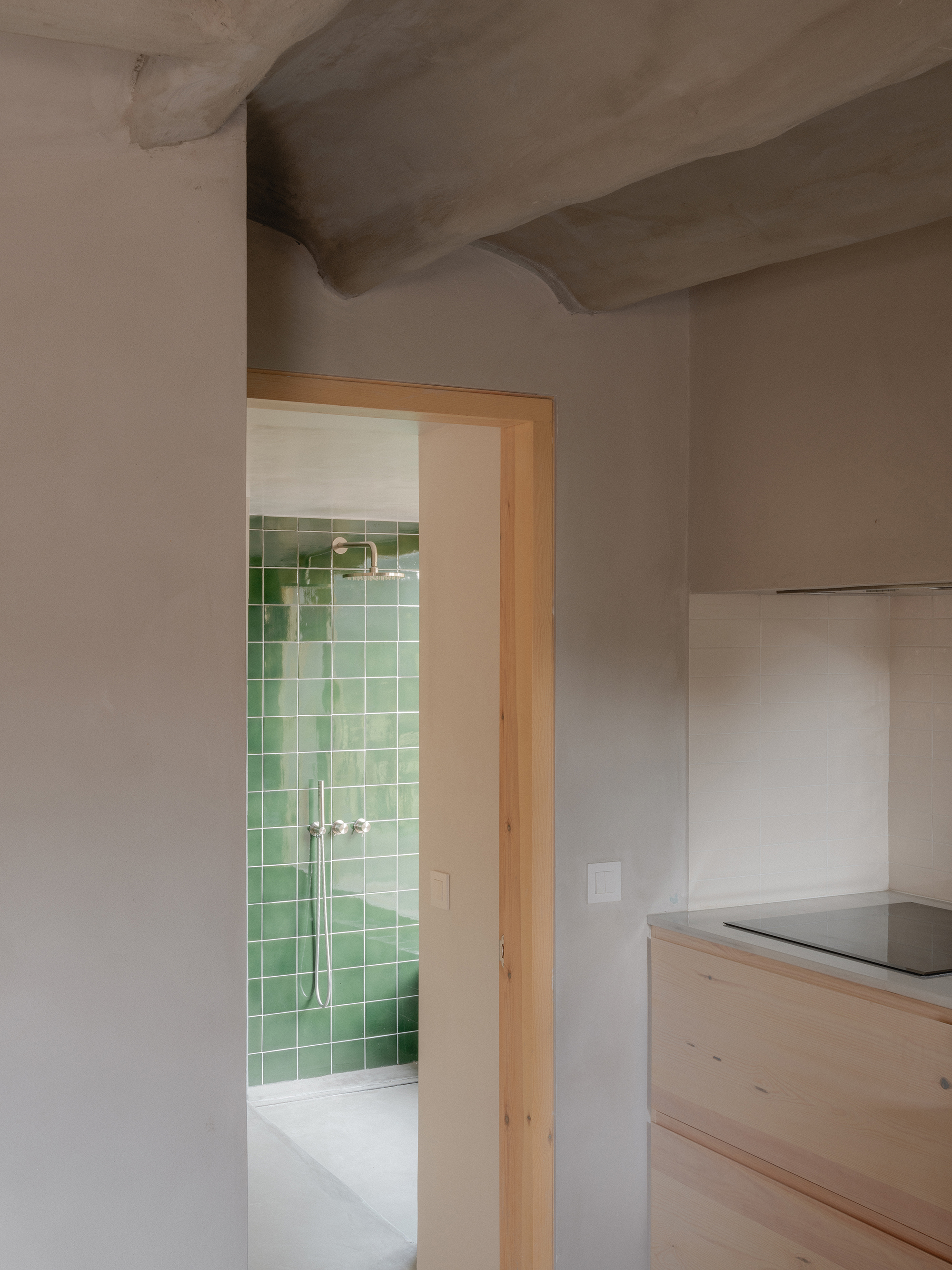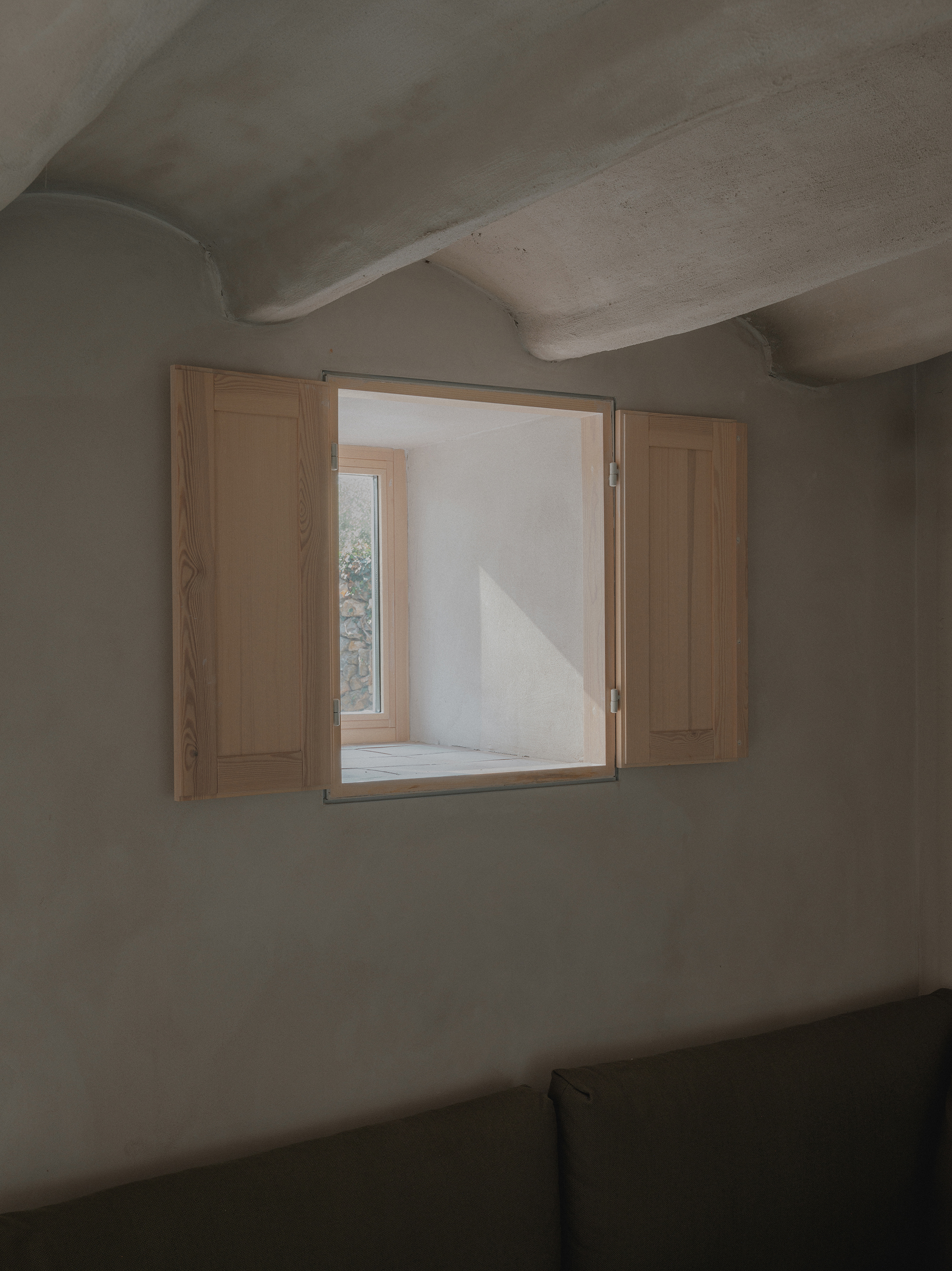 The project is conceived as a concentric intervention that follows and enhances this structure of walls. On the one hand, the functional program is attached to these walls, occupying the perimeter, and forming a ring around a central space. This equipped perimeter incorporates part of the domestic program (kitchen, sofa, wardrobe, stairs, etc.). On the other hand, a new layer reinforces thermal insulation by enveloping the building, exaggerating the depth of the original walls, and ensuring high thermal inertia. The original openings, carefully arranged in relation to the surroundings, are kept and transformed into views that frame both the immediate landscape (the forest, the orchard, etc.) and the distant one. The increased depth of the walls allows these openings to become spaces, serving as an entrance threshold, habitable niches from the inside, or the necessary area for external shutters to be recessed into the wall.