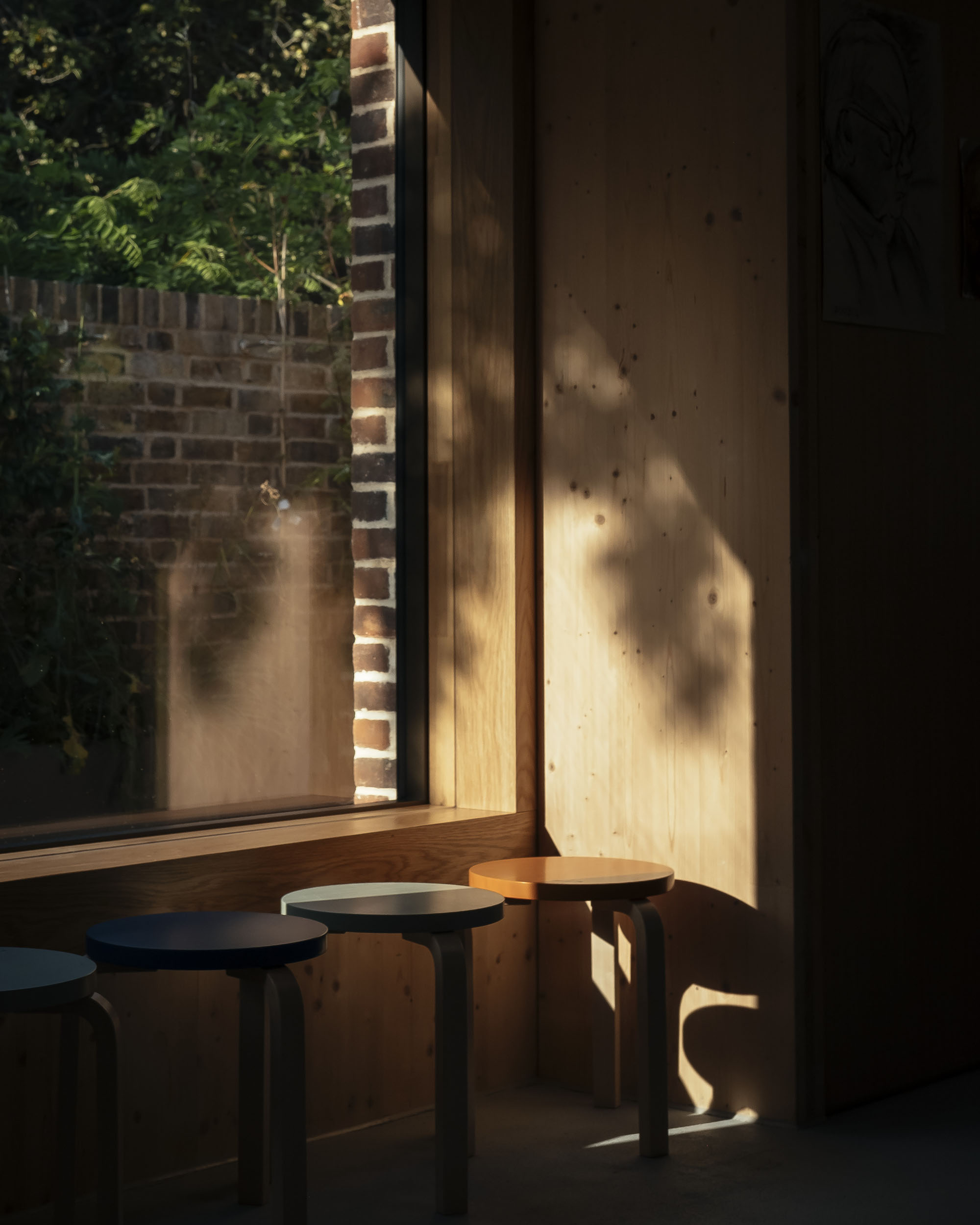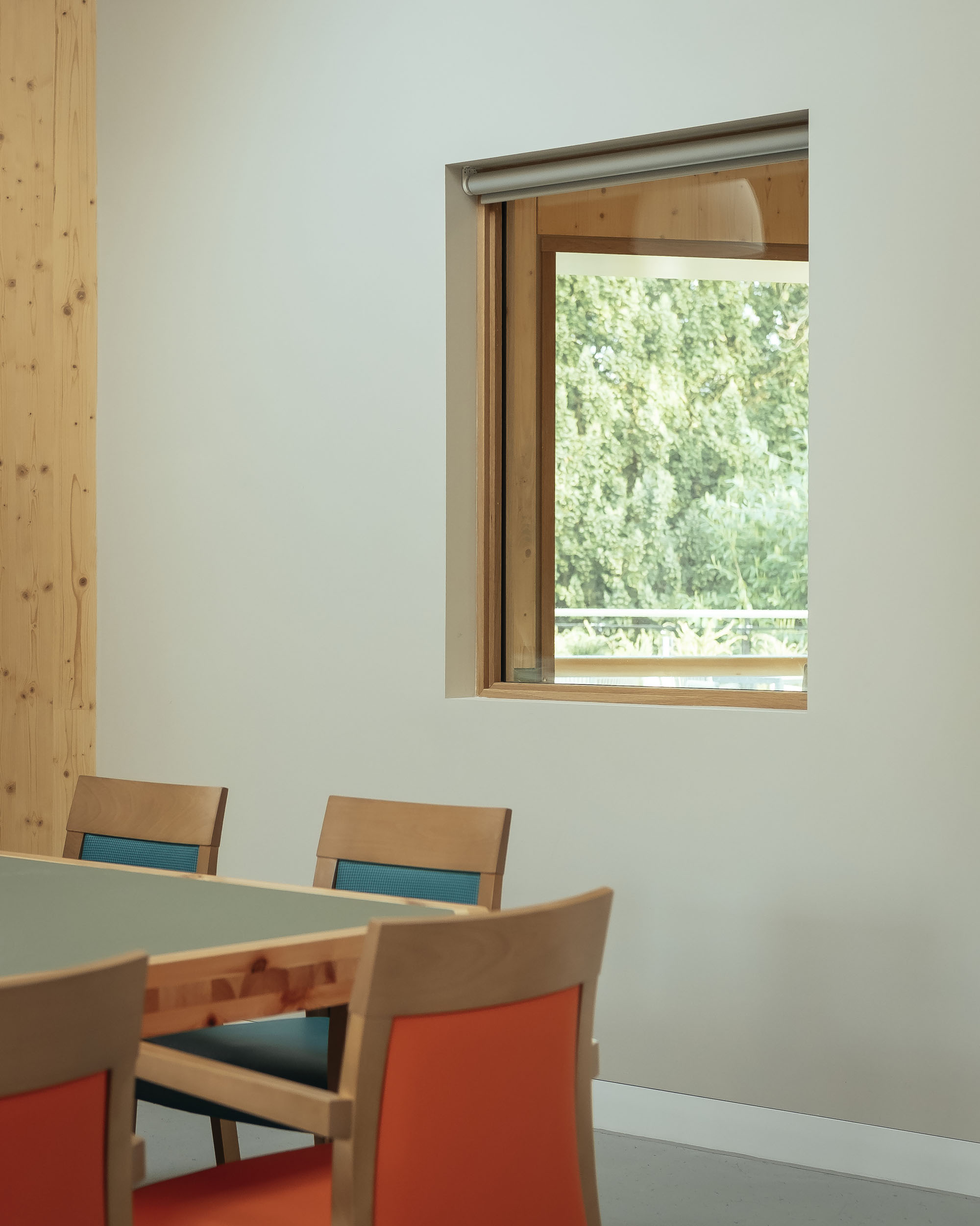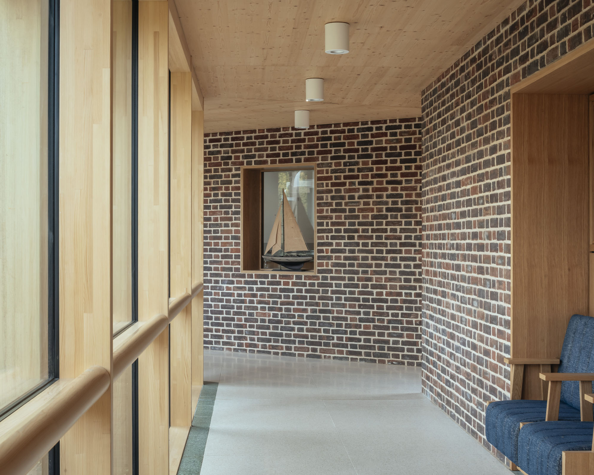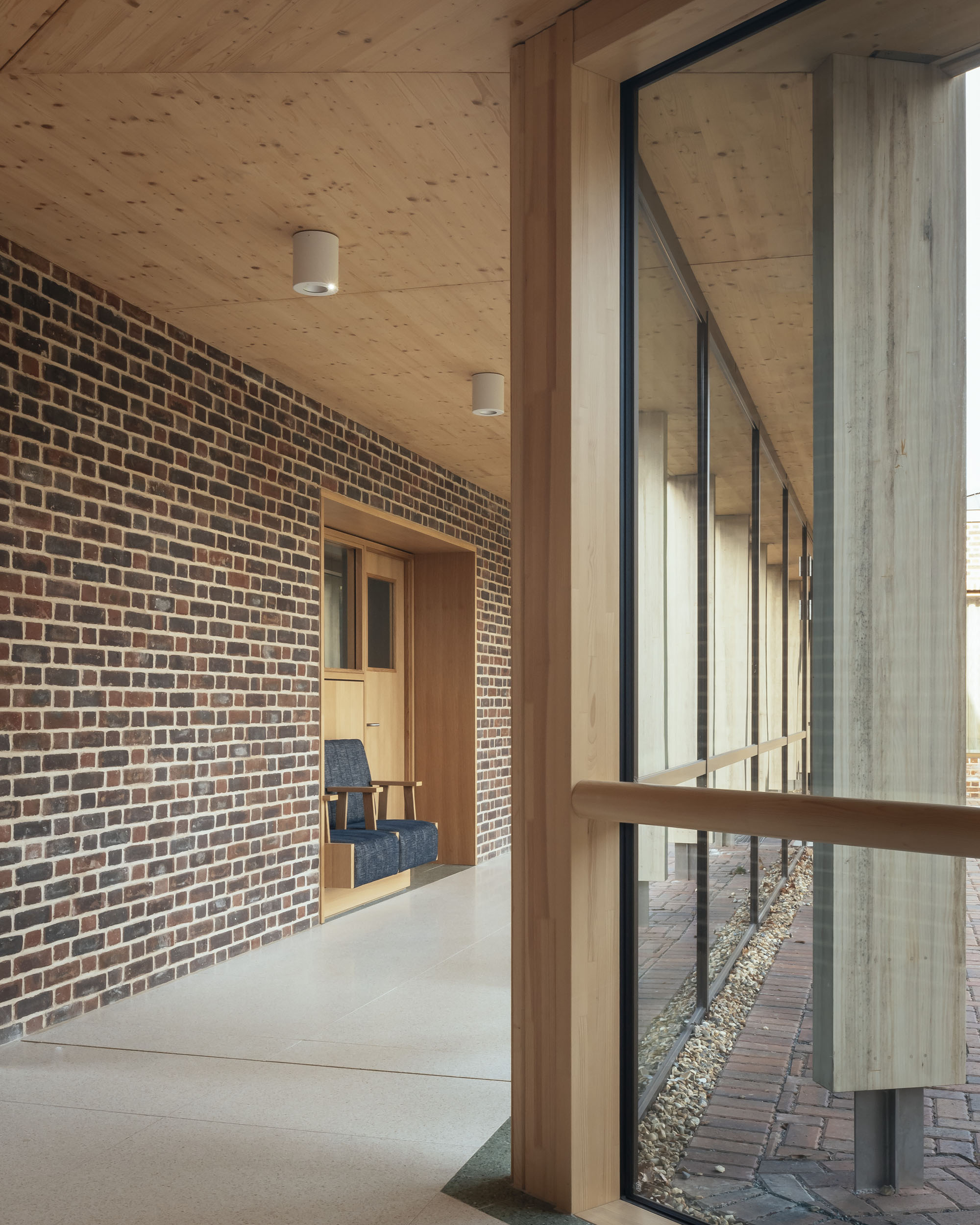 The experience of the cloister is a key architectural component of the design. With clear references to the existing Almshouse, Mæ’s modern interpretation provides an internal circulation space with a softened threshold between inside and outside that connects the functions distributed along its route. Beginning at the main entrance and terminating at Morden Hall, the cloister is designed to be inhabited year-round, with warm temperatures in the winter owing to its south-facing aspect and protected from summer glare by discreet roof overhangs.