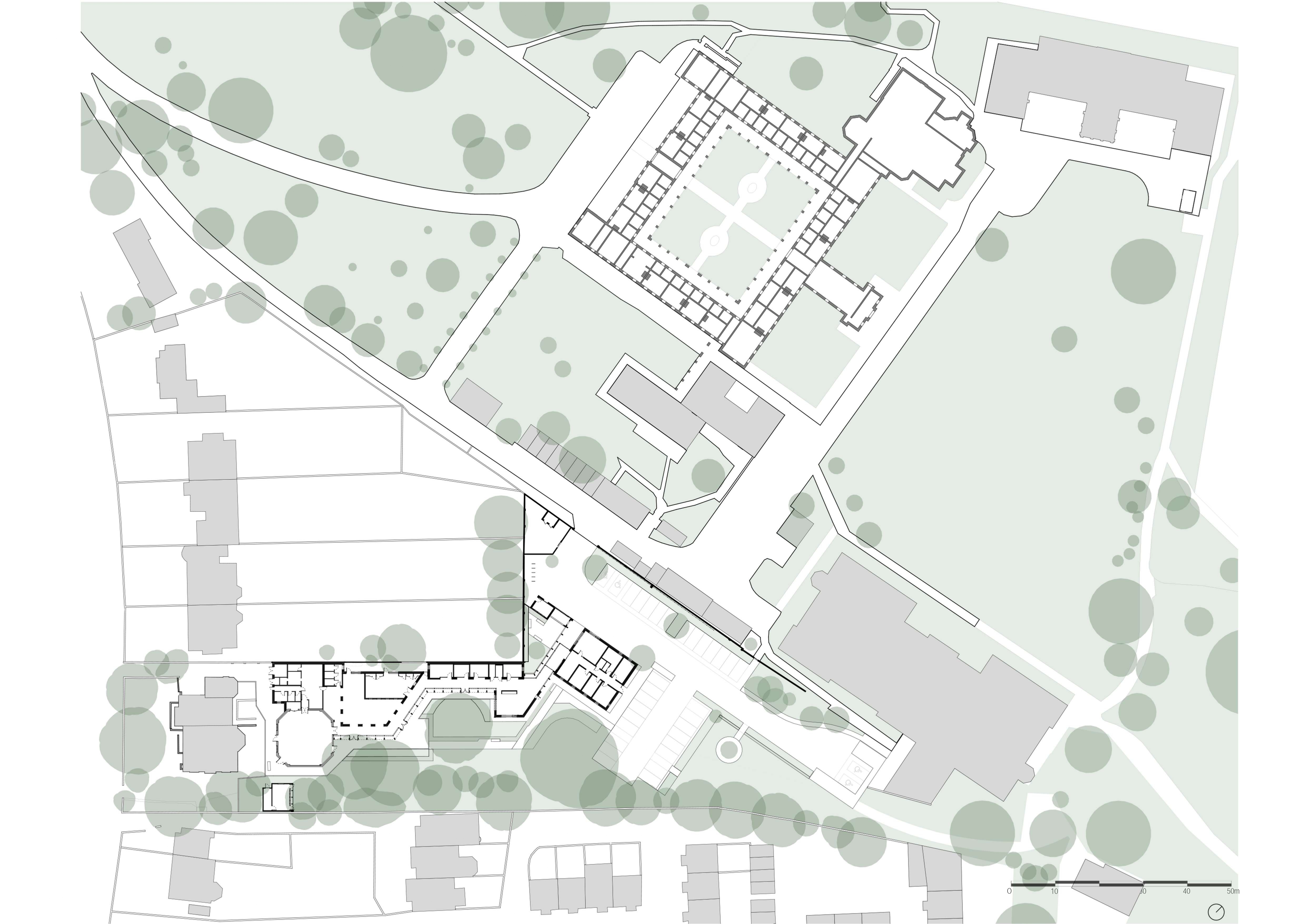 The linear path of the cloister adjusts as it threads between the mature trees on site, demarcating a series of ‘outdoor rooms’. Introducing principles of biophilic design, these rooms complement the functions they sit adjacent to, for example the welcoming feeling of the ‘snug’ is reinforced by herbaceous planting and yew hedges.