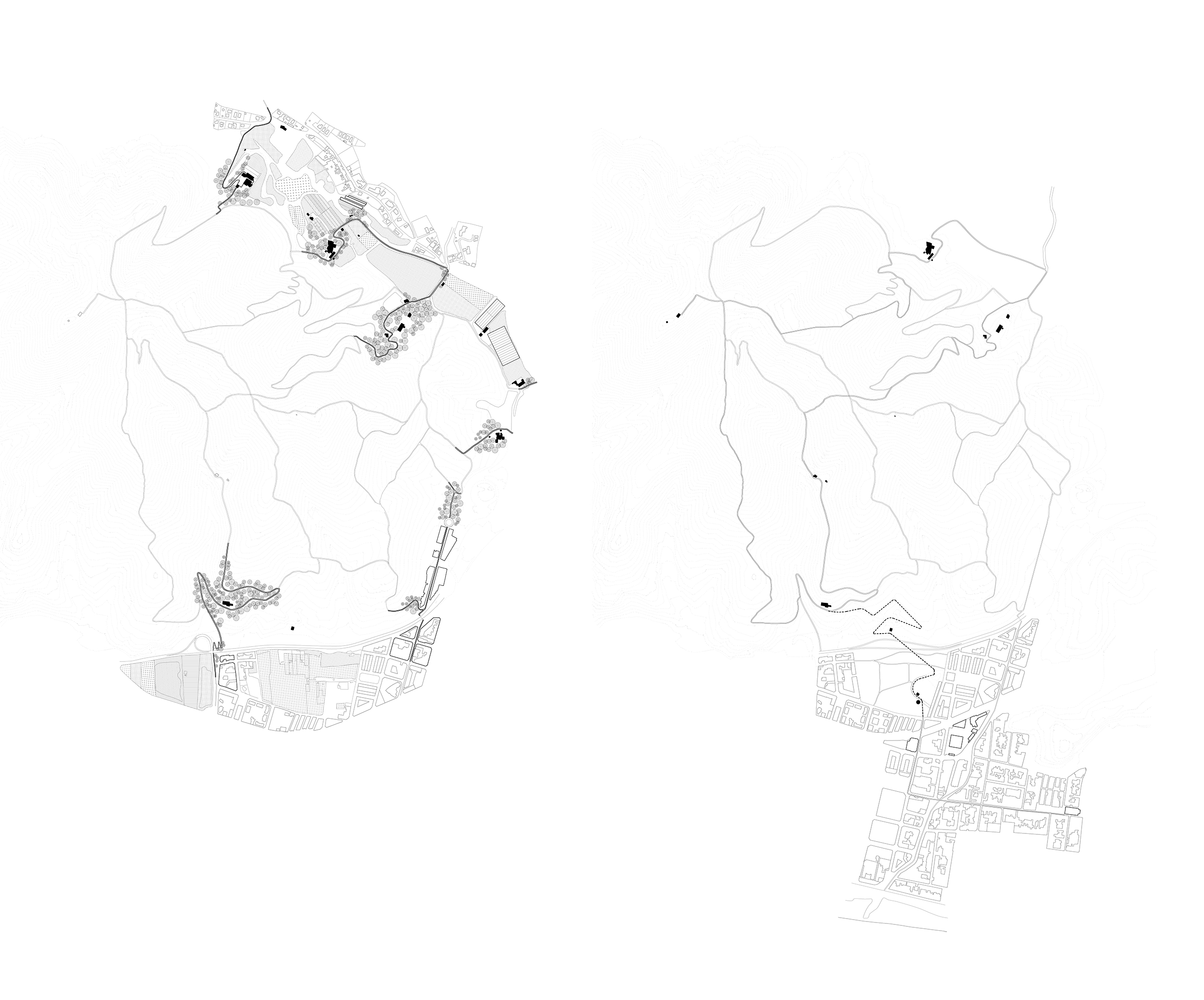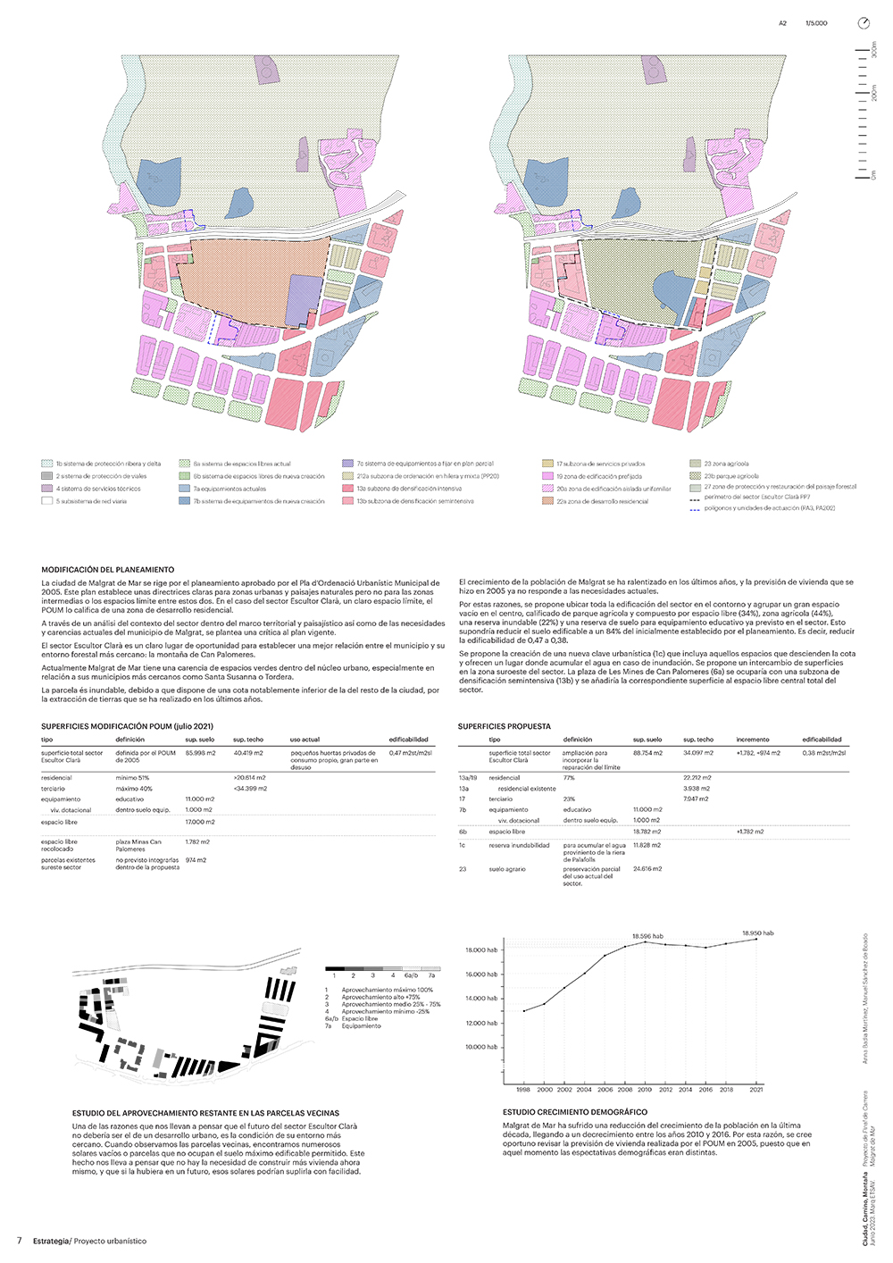 “Ciudad, Camino, montaña” is a project that investigates on how a city should meet their ends, specifically when encountering a natural heritage such as the mountain of Can Palomeras, in Malgrat de Mar. In search of a location, the Escultor Clara sector very quickly caught our attention, an enormous empty plot that is currently located in the border between the city and the forest. It seemed like the perfect opportunity to repurpose the periphery of the town by redefining the limits of the forest. Our ambition was to insert the expression of the natural environment within the urban realm.