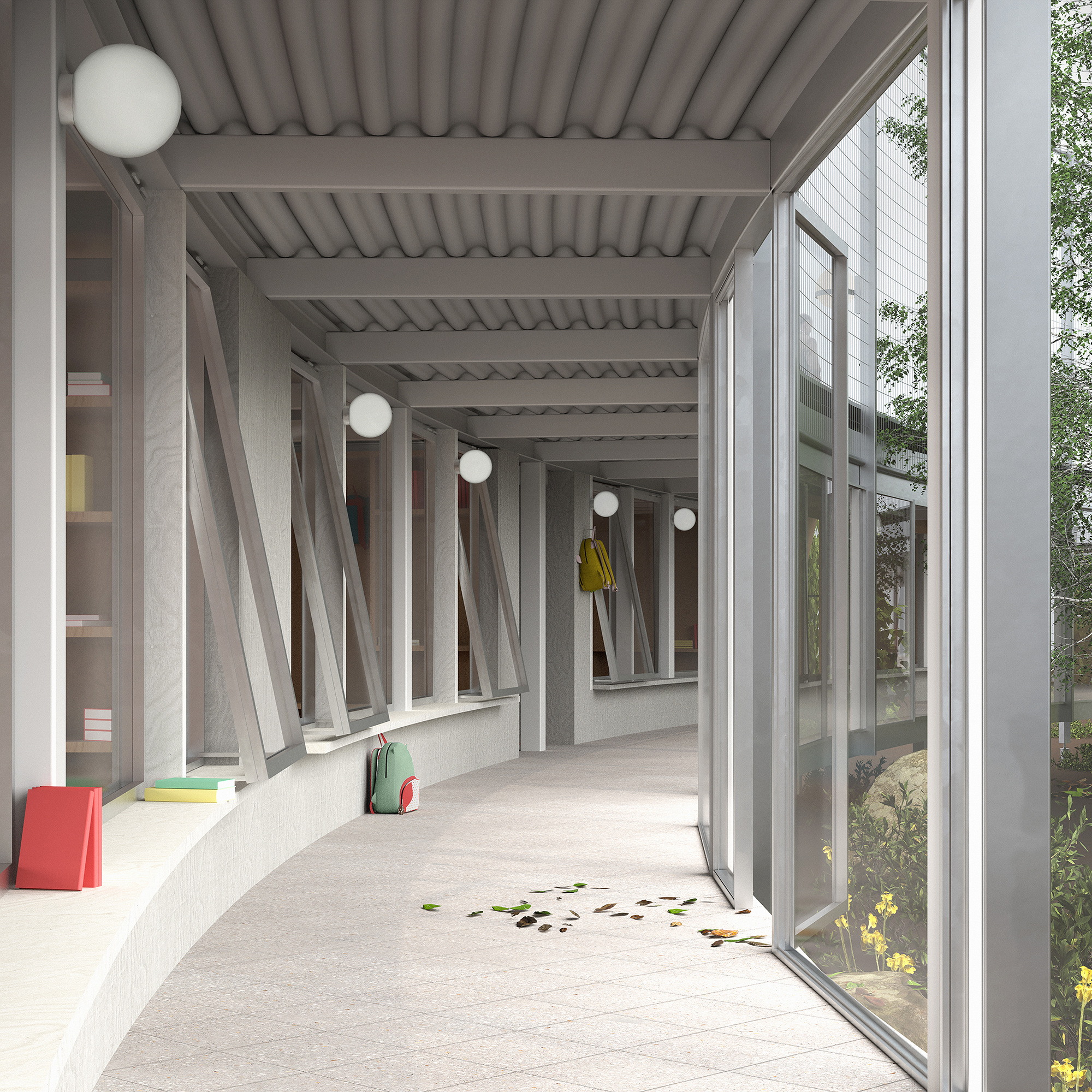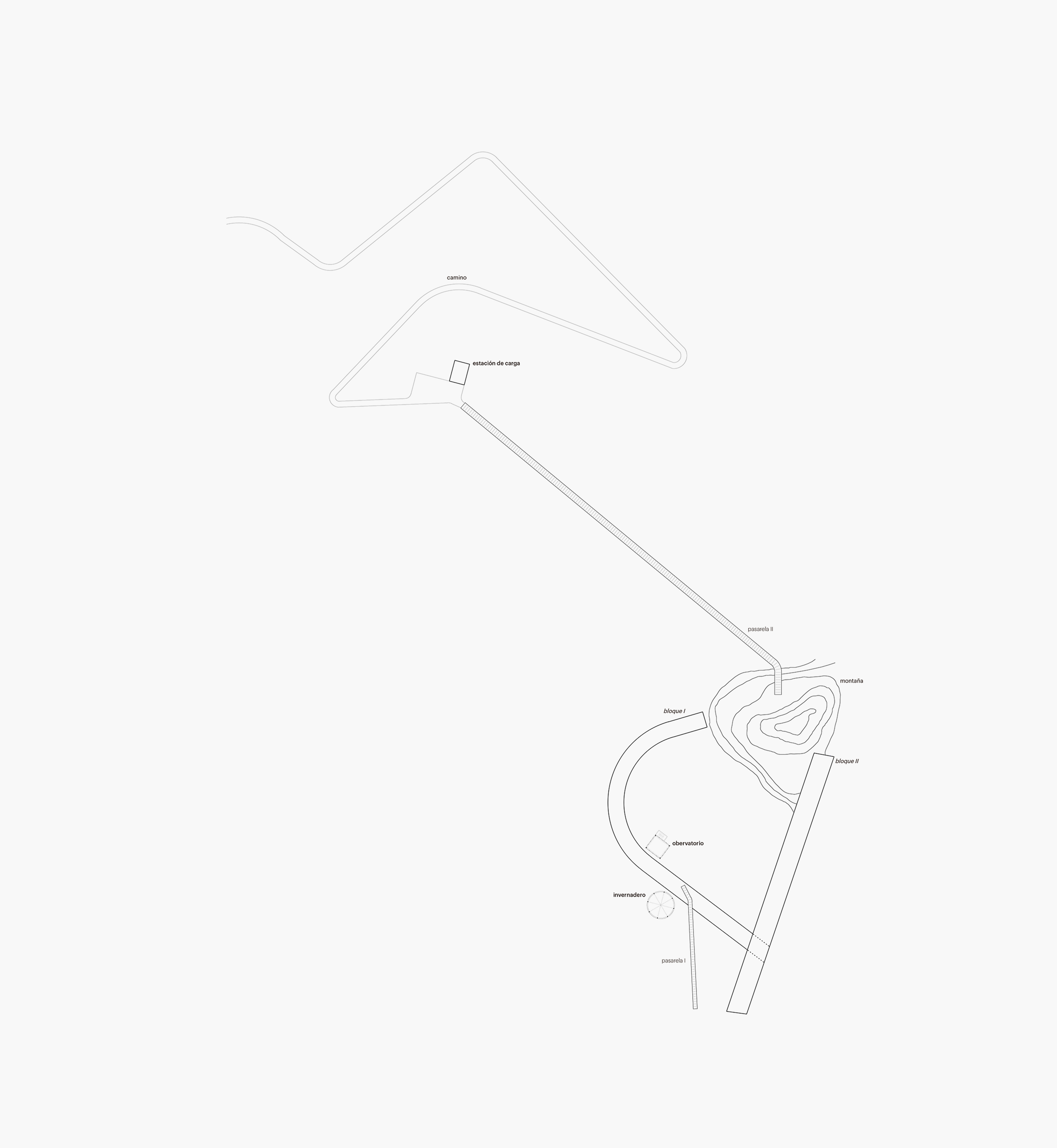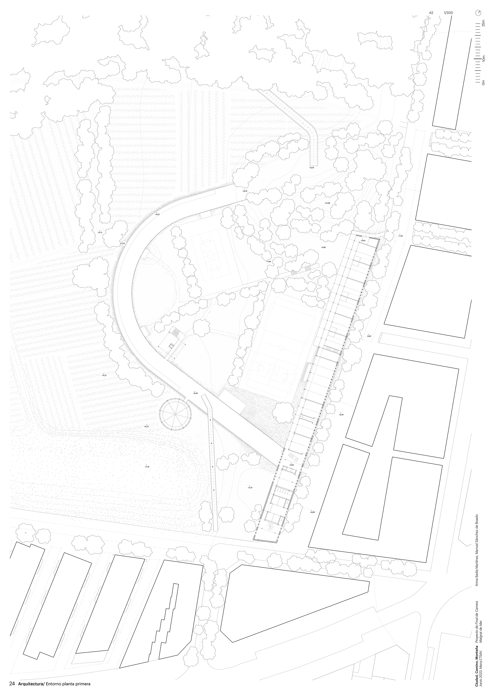 The proposal can be broken down to three main strategies, that aim to extend the forest into the Escultor Clara sector. First, a consolidation of the borders of the empty plot, followed by a massive vegetation planting in order to ensure the forest continuity, and completed with the construction of a new itinerary. The new school becomes the keystone of this new itinerary, being the linking piece between of the network of paths that lead to the forest, and the city fabric. The roof of the new building becomes a public pathway through which pedestrians can ascend to the mountain.