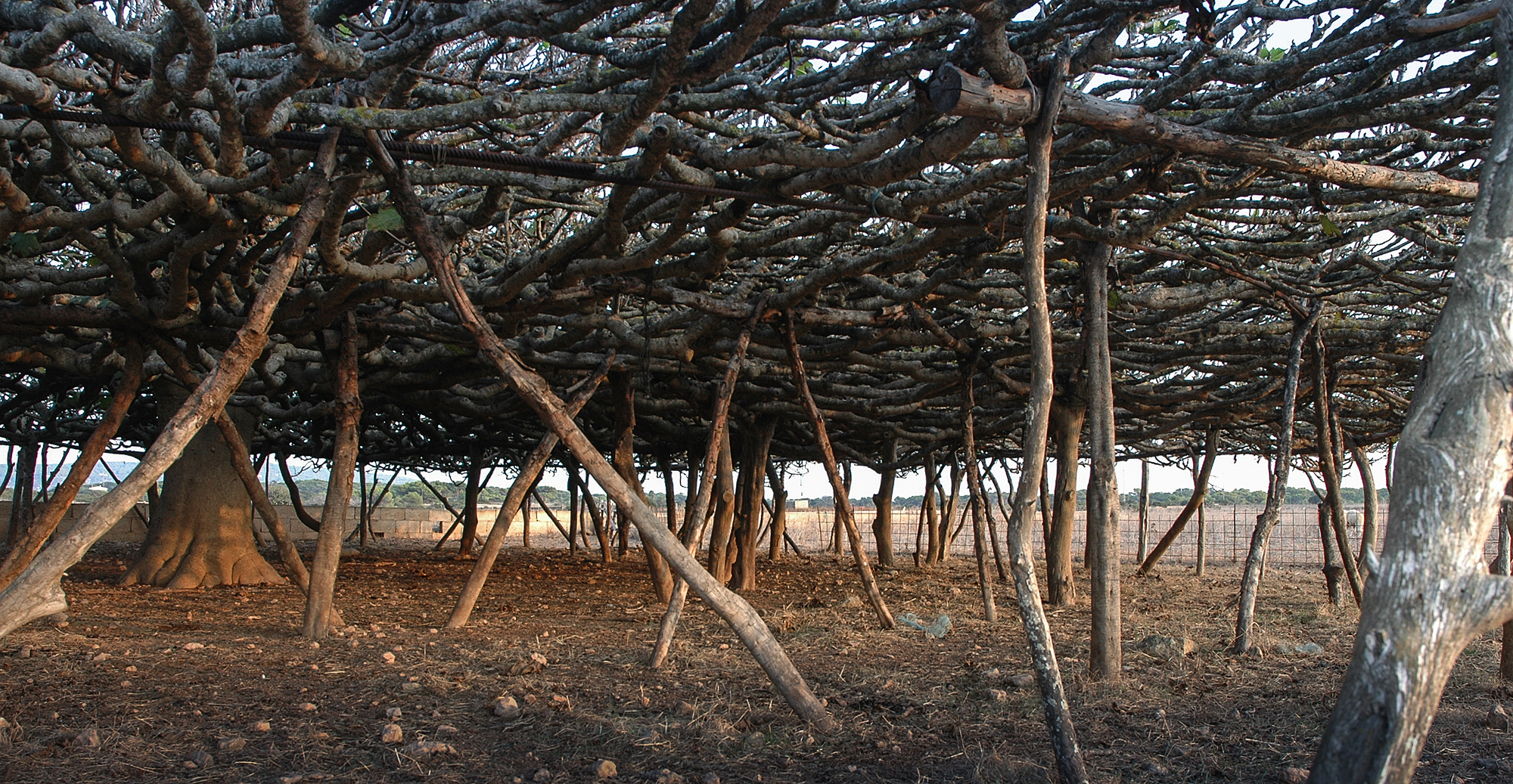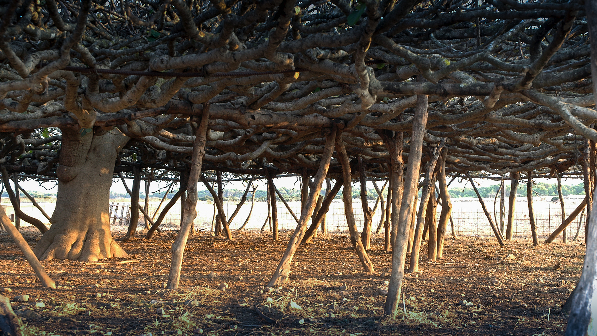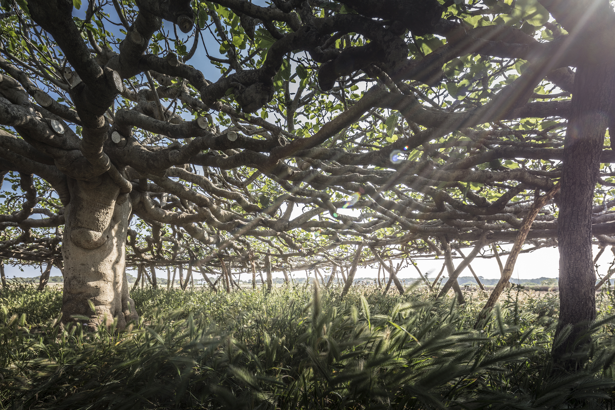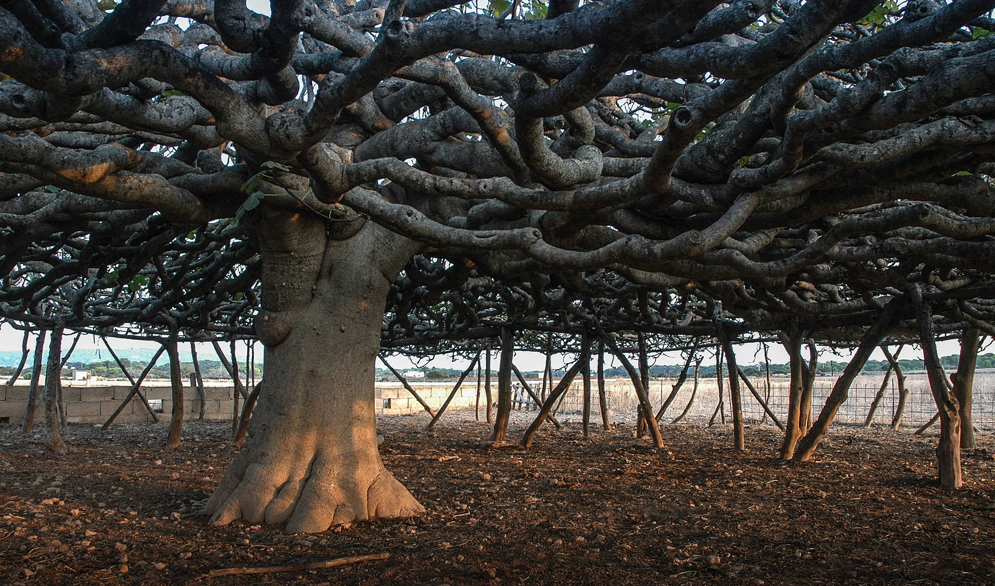 Una sala hipóstila de 143 pilares distribuidos en 5 crujías estructurales concéntricas, cuyo forjado constituido por centenares de ramas entrelazadas alcanza los 351 m2 de ocupación. Un extraordinario ejemplo de equilibrio entre naturaleza y artificio, que no sólo es un icono de gran belleza en la llanura del paisaje insular, sino que debe su configuración a varias funciones, entre las cuales destacan la reducción de la superficie vertical de exposición al viento, permitir un gran desarrollo en horizontal de la copa haciéndola transitable en su mayor parte y crear un espacio apto para recoger los frutos, proteger las ovejas y las cabras del intenso sol y evitar al mismo tiempo que éstas puedan alcanzar los higos.