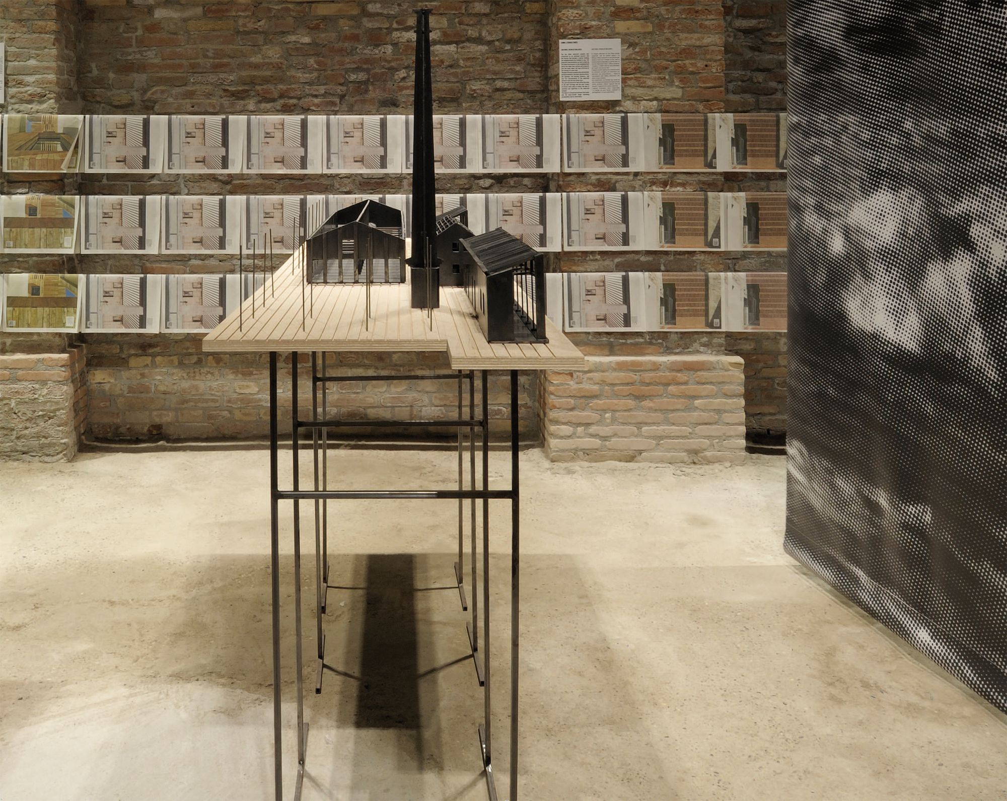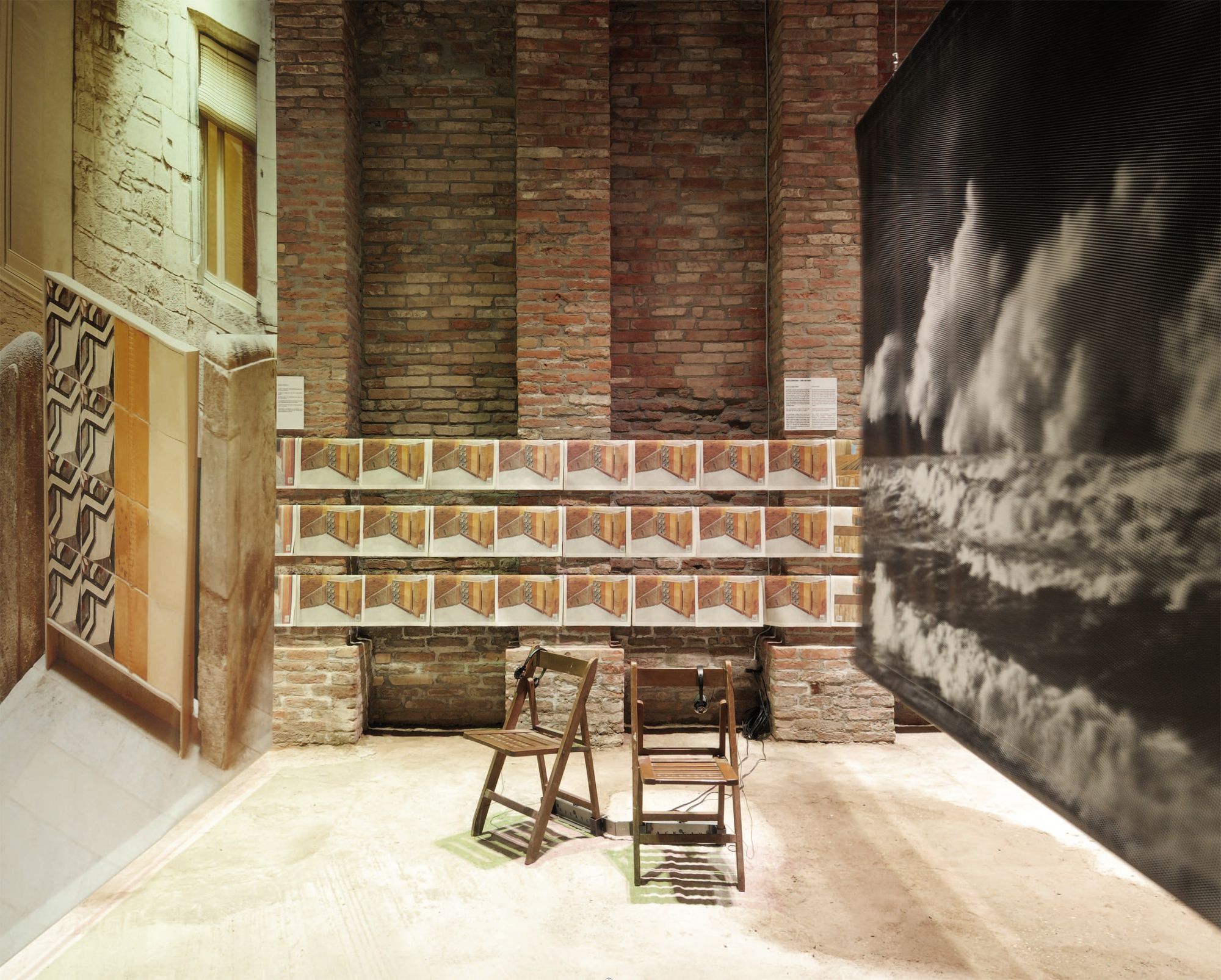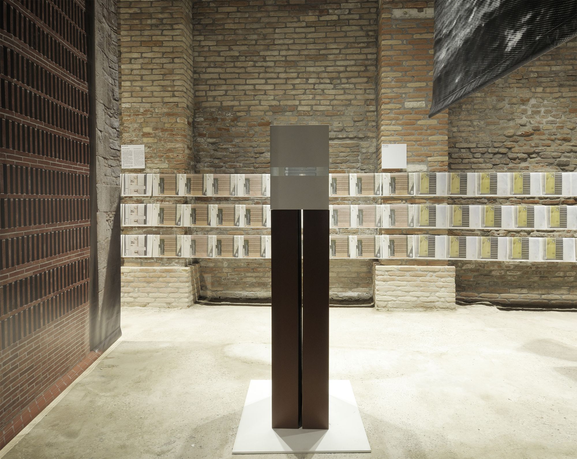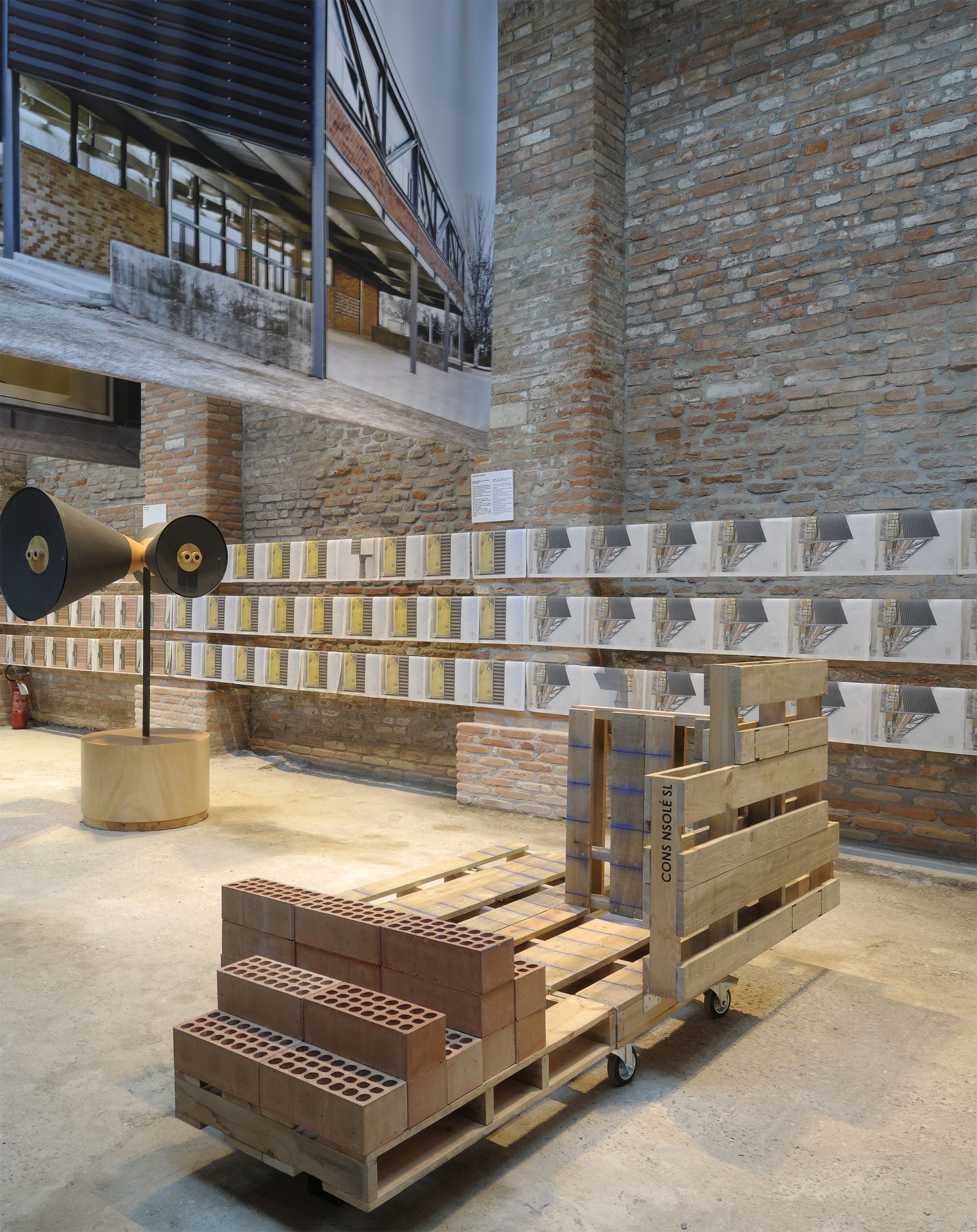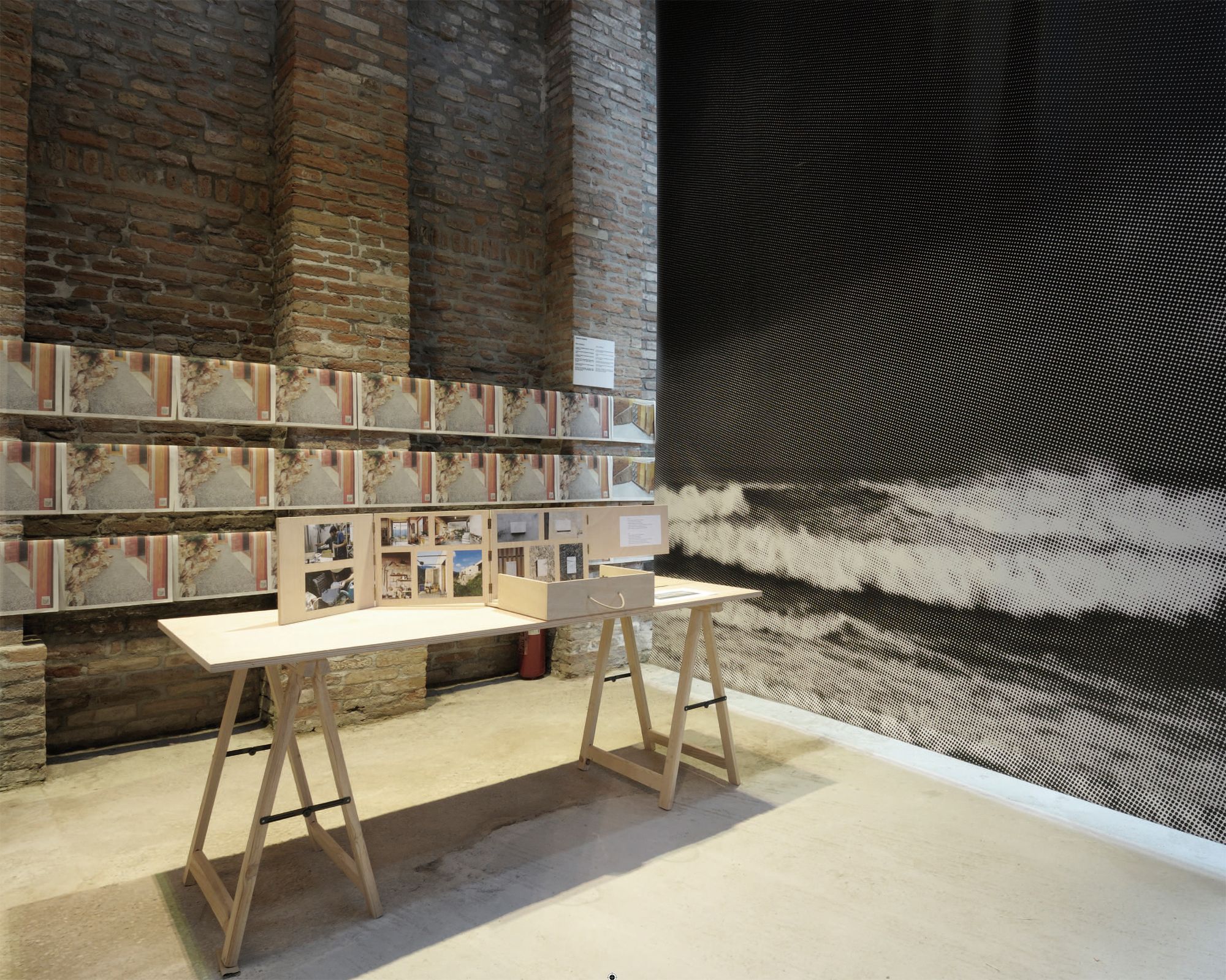 9 obres referenciades per una gran imatge, una taula amb materials, documents i dibuixos del procés creatiu i un objecte dissenyat pels autors, específicament per la mostra: