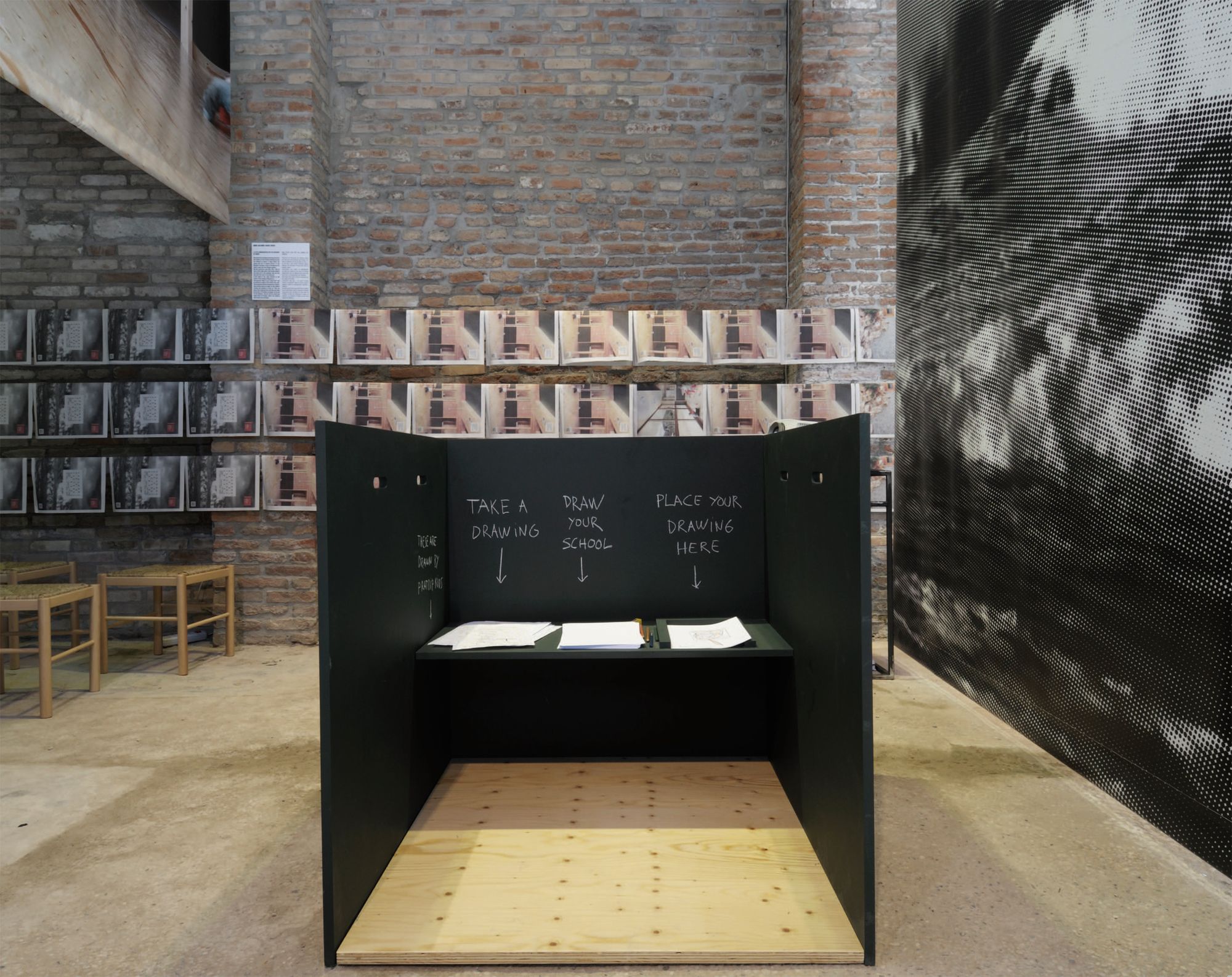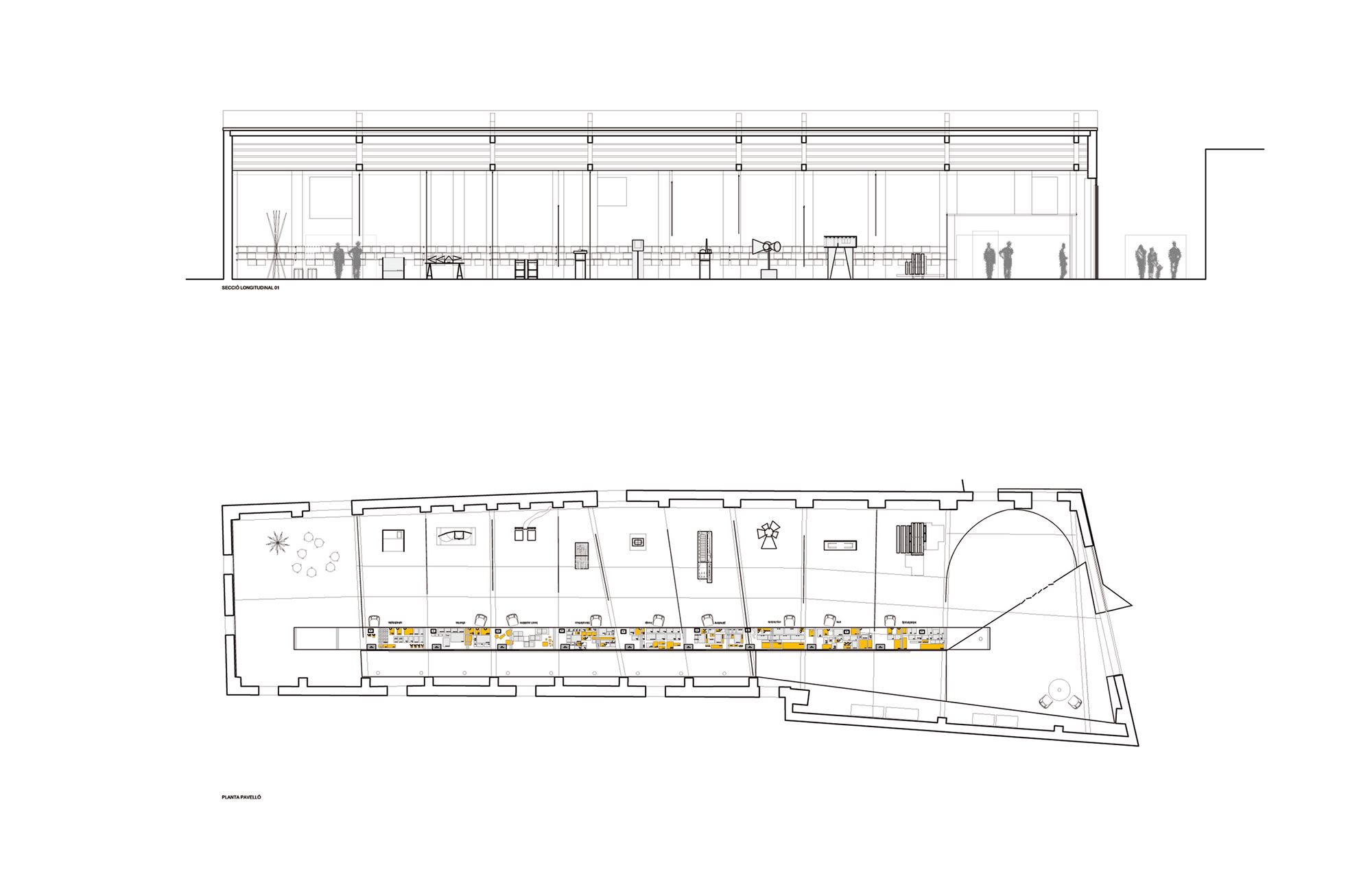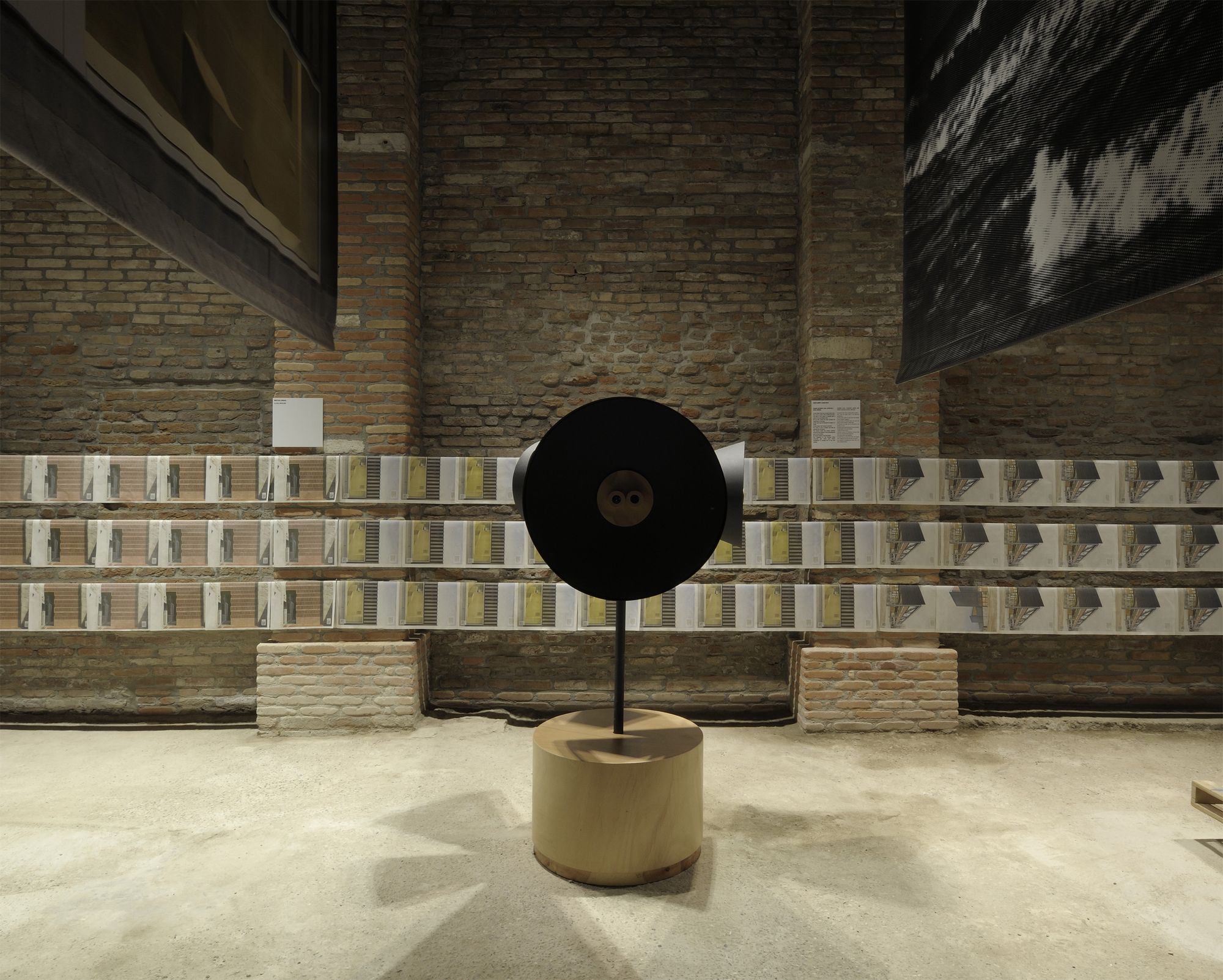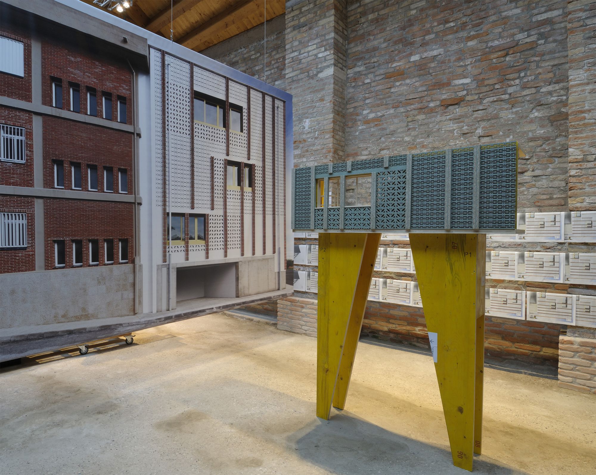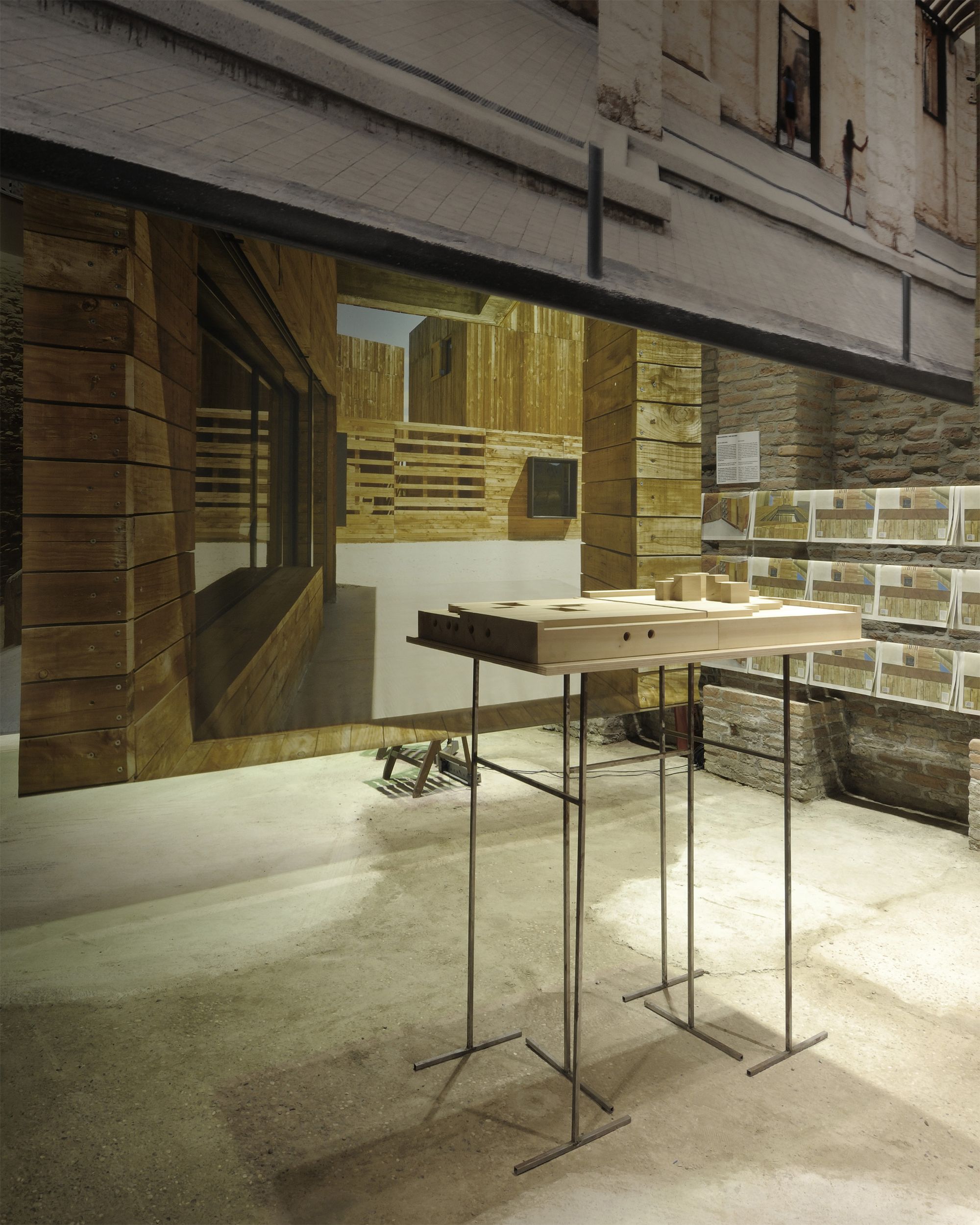 9 obres referenciades per una gran imatge, una taula amb materials, documents i dibuixos del procés creatiu i un objecte dissenyat pels autors, específicament per la mostra:
