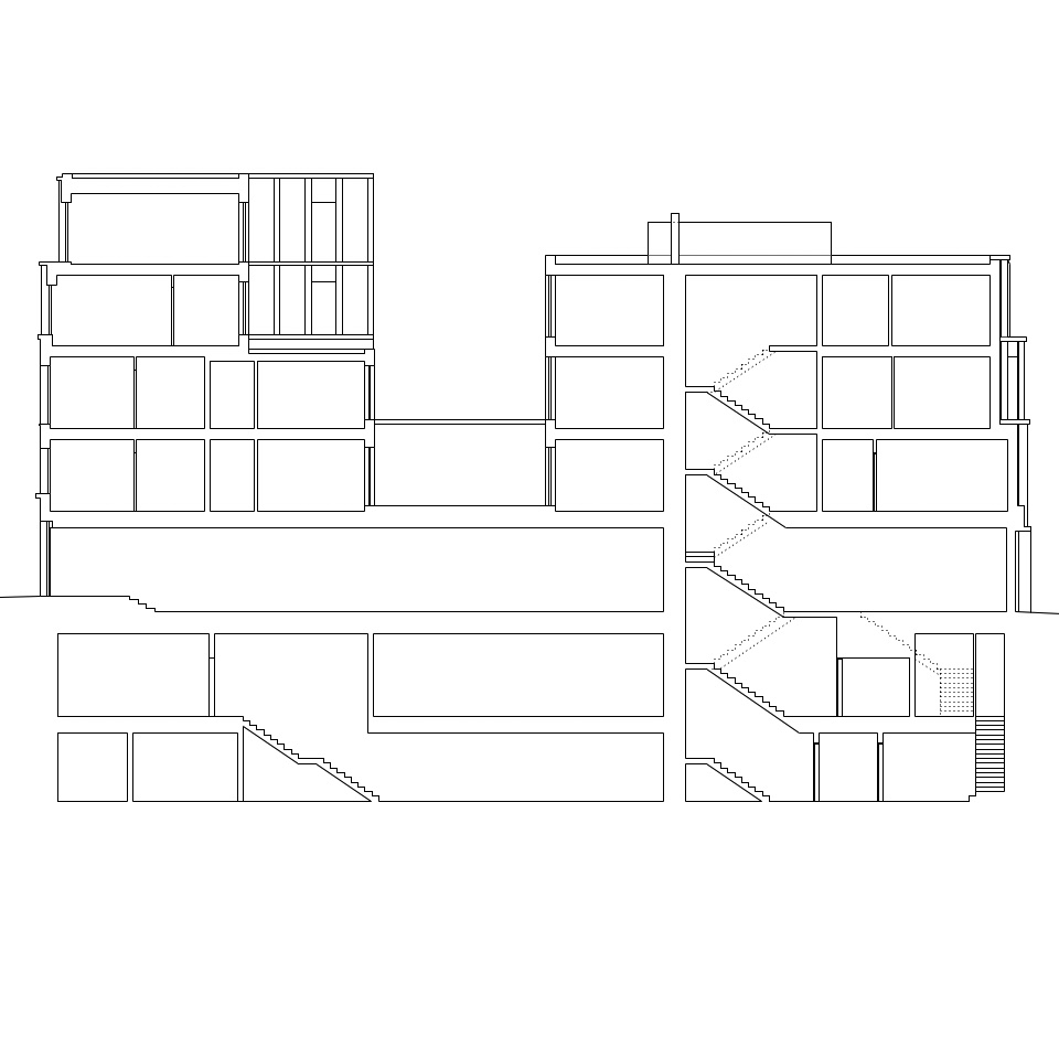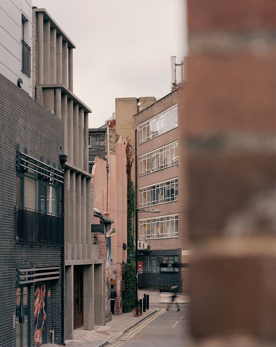 Whitby Street has a more semi-/post-industrial mews nature with a mix of building styles and scale. The ground floor of the new scheme houses a full-width set-back entrance, which activates the street in a controlled manner, while the upper floors reference the Victorian industrial typology of a brick and cast iron hybrid structure prevalent in local warehouses. The facade is articulated by a series of columns, like those on the upper floors of the Redchurch Street facade, with large openings onto the quieter mews-like Whitby Street. Instead of cast iron, the columns and floors are of fine pigmented concrete, creating a simple and refined take on an ‘industrial’ appearance. The necessarily blank side elevations are relieved by a series of blank brick-framed panels with coursing bands, akin to those found on the South elevation of Soane’s Picture Gallery and Almshouses in Dulwich.