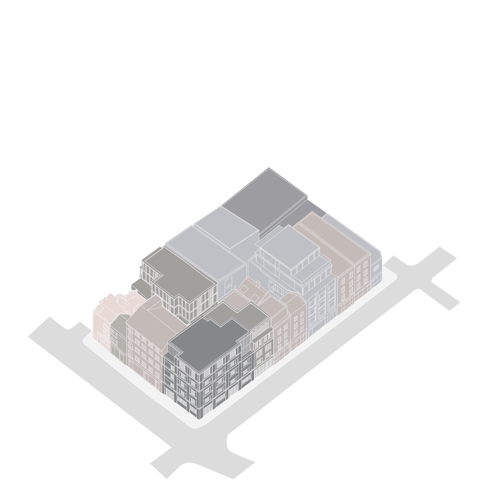 The new scheme does not merely mimic or form a visual extension to the previous Redchurch Corner scheme that it adjoins and extends, but has a visual and material language of its own; maintaining the fairly piecemeal nature of the local urban fabric of mid-rise, narrow-fronted buildings. Instead, it is the proportion of the new building that relates directly to that of its neighbour, with concrete banding at first and third floor continuing through from Redchurch Corner and an attic storey that knits together the roof levels of both 58-60 and 54. The grey brick chosen for the first and second floors of the new scheme complements the dark grey of the jesmonite panels on Redchurch Corner, while lending the new building more texture and variation, and providing a smooth transition to the stock brick of no. 54.