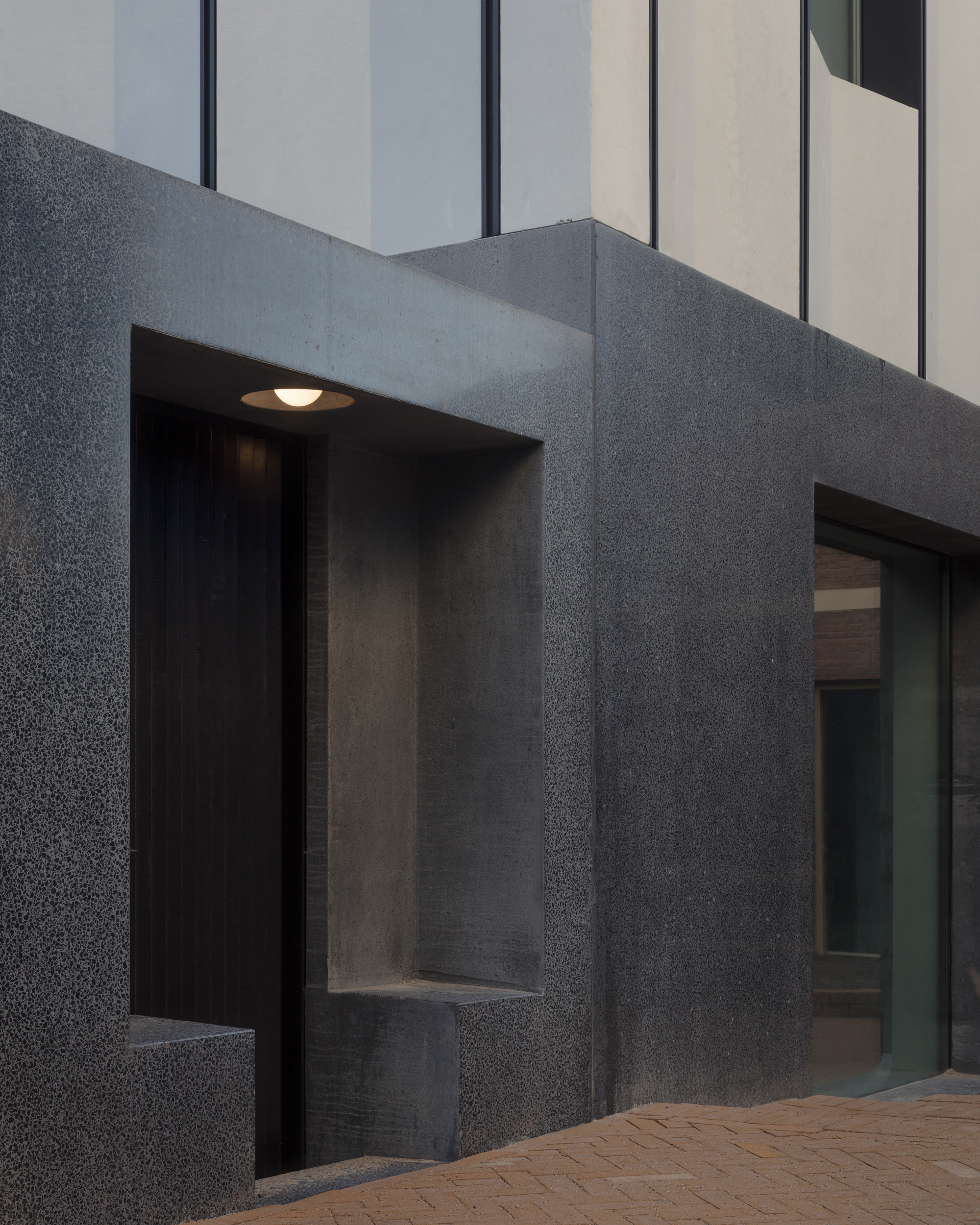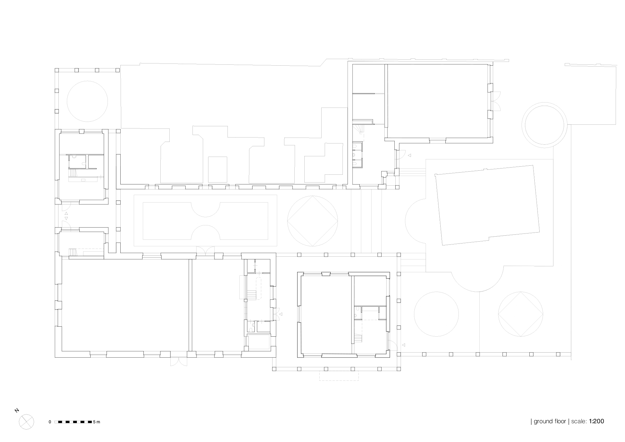 On the west side, the garden extends to a classical gate; to the east the courtyard is oriented towards the façade of an old villa, a relic from Ciboga times, where an ‘amphitheatre’ defines the public space. We added a small, diamond-shaped window to the west façade of the former villa to frame the view of the central courtyard from the inside. Seen from the entrance, it marks the central axis of the courtyard garden.