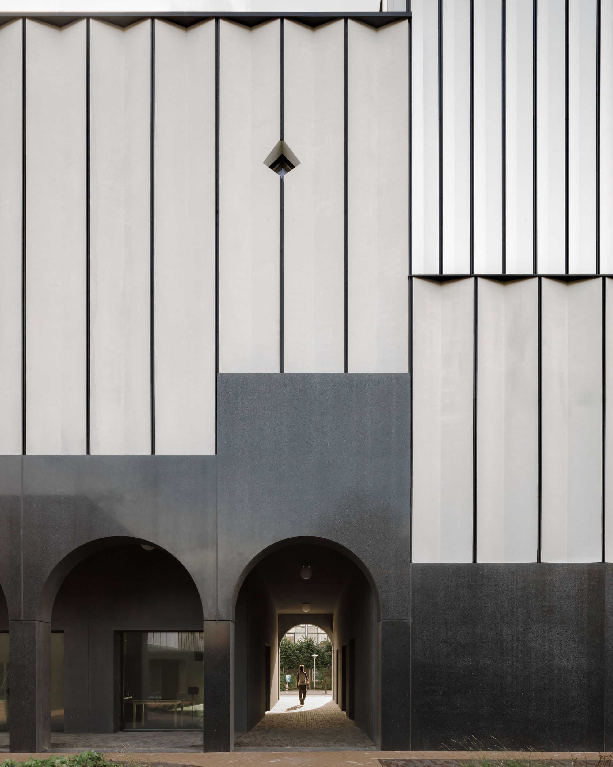 The building is located on the Ciboga site (Circus, Constance and Gas, referring to former uses) that accommodated a gasworks from 1900. The grounds were originally enclosed, the wall was demolished over time. A wall connects and separates. The publicly accessible courtyard garden is enclosed by a wall with openings that forms the basis of the façade. It’s different heights accentuate feature such as gates and entrances and articulate transitions. Like enclosed abbey gardens, this courtyard also features an ambulatory that partially embraces the public space. The garden is therefore communal, a place for the public and the actors, surrounded by spaces where the actors focus on practising their public appearances.
