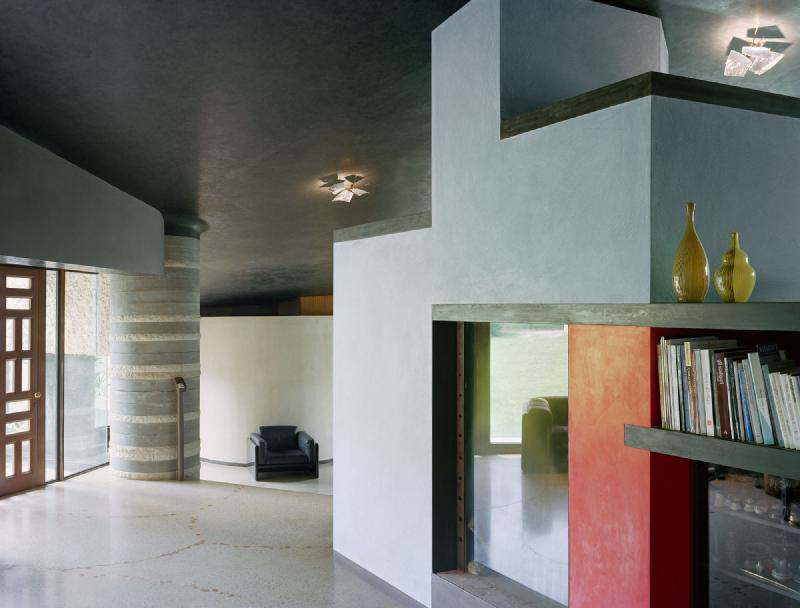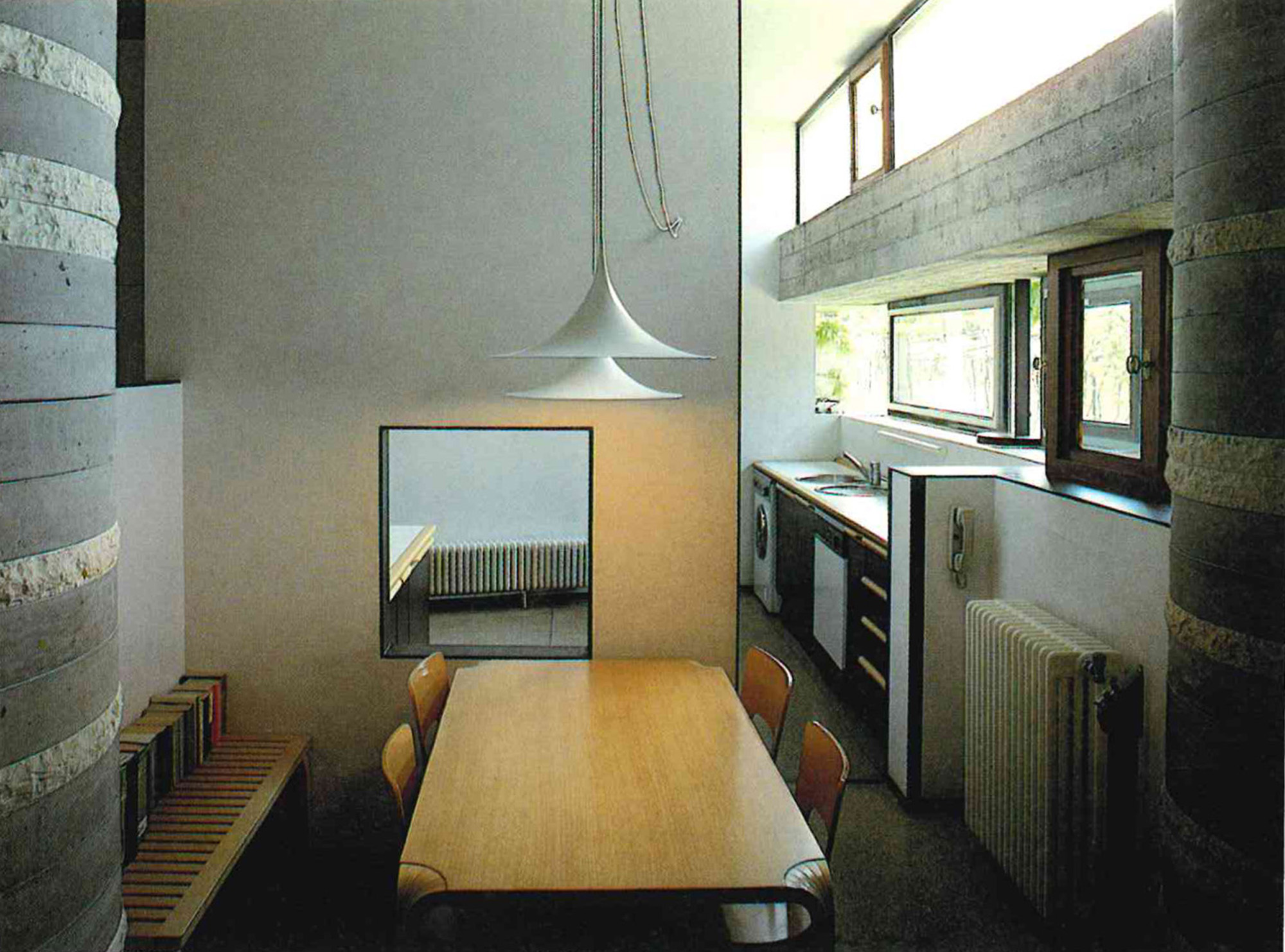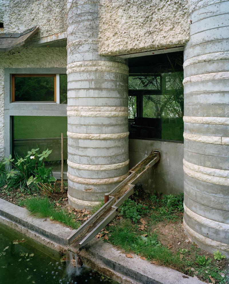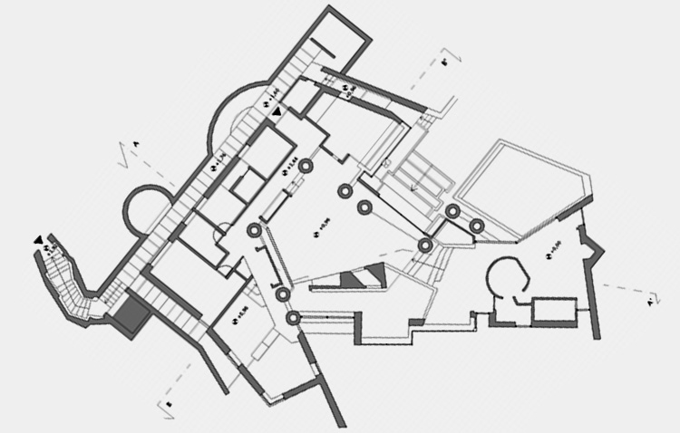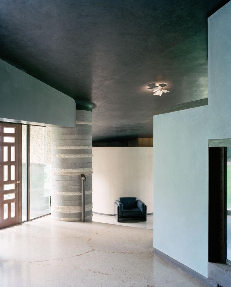 Within the project an important aspect is the treatment of water by the architect. Water is used to express, while emphasizing the relationship between inside and outside, between the natural and the artificial. Influenced both by Frank Lloyd Wright as Japanese architecture, the calm pools unite inside to the outside while making us pay attention to the separation of the two media. Such separation is also highlighted by the heavy walls and irregular openings. It is the contrast between ethereal as the water element and heavy walls and columns that makes us distinguish between inside and outside.