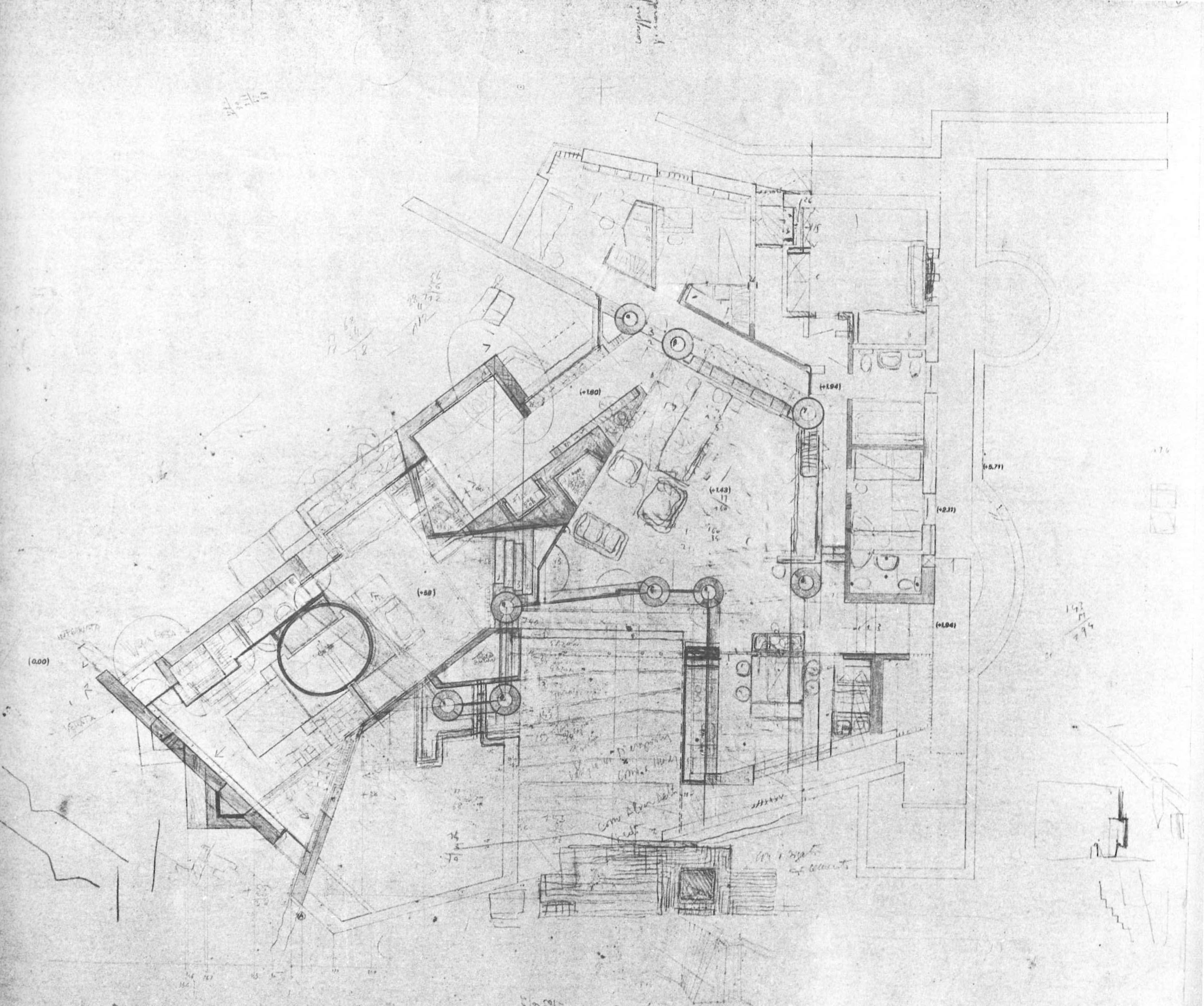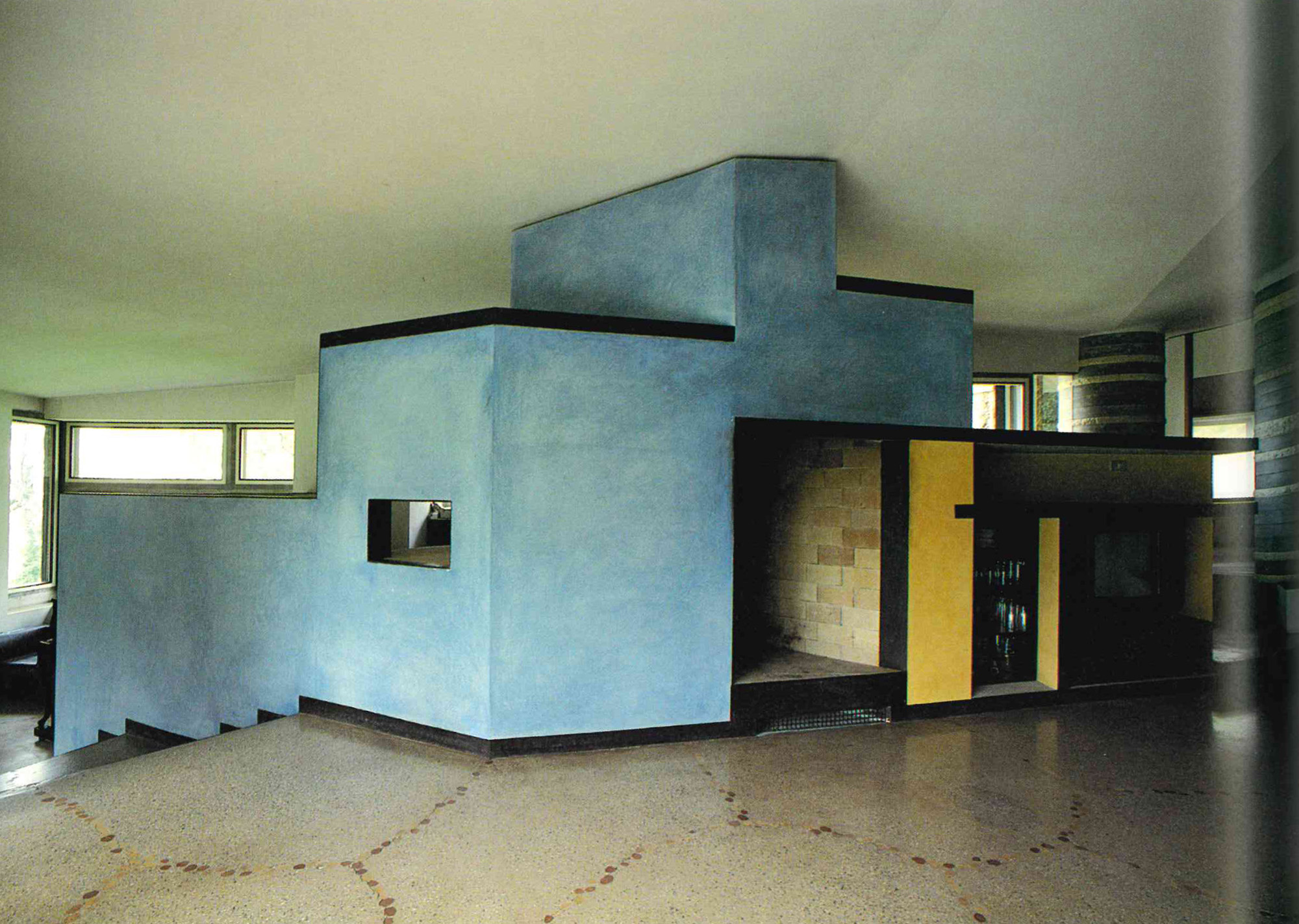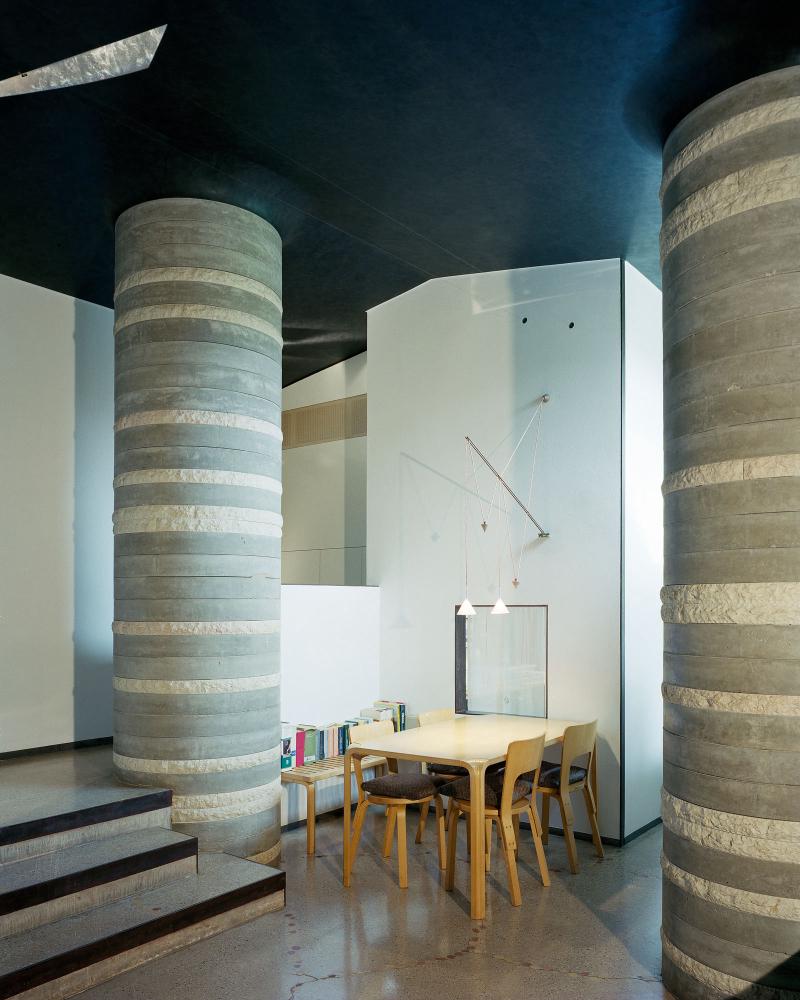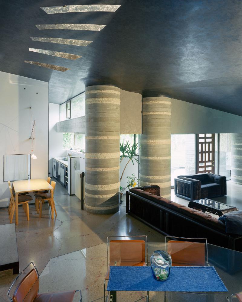 Within the project an important aspect is the treatment of water by the architect. Water is used to express, while emphasizing the relationship between inside and outside, between the natural and the artificial. Influenced both by Frank Lloyd Wright as Japanese architecture, the calm pools unite inside to the outside while making us pay attention to the separation of the two media. Such separation is also highlighted by the heavy walls and irregular openings. It is the contrast between ethereal as the water element and heavy walls and columns that makes us distinguish between inside and outside.