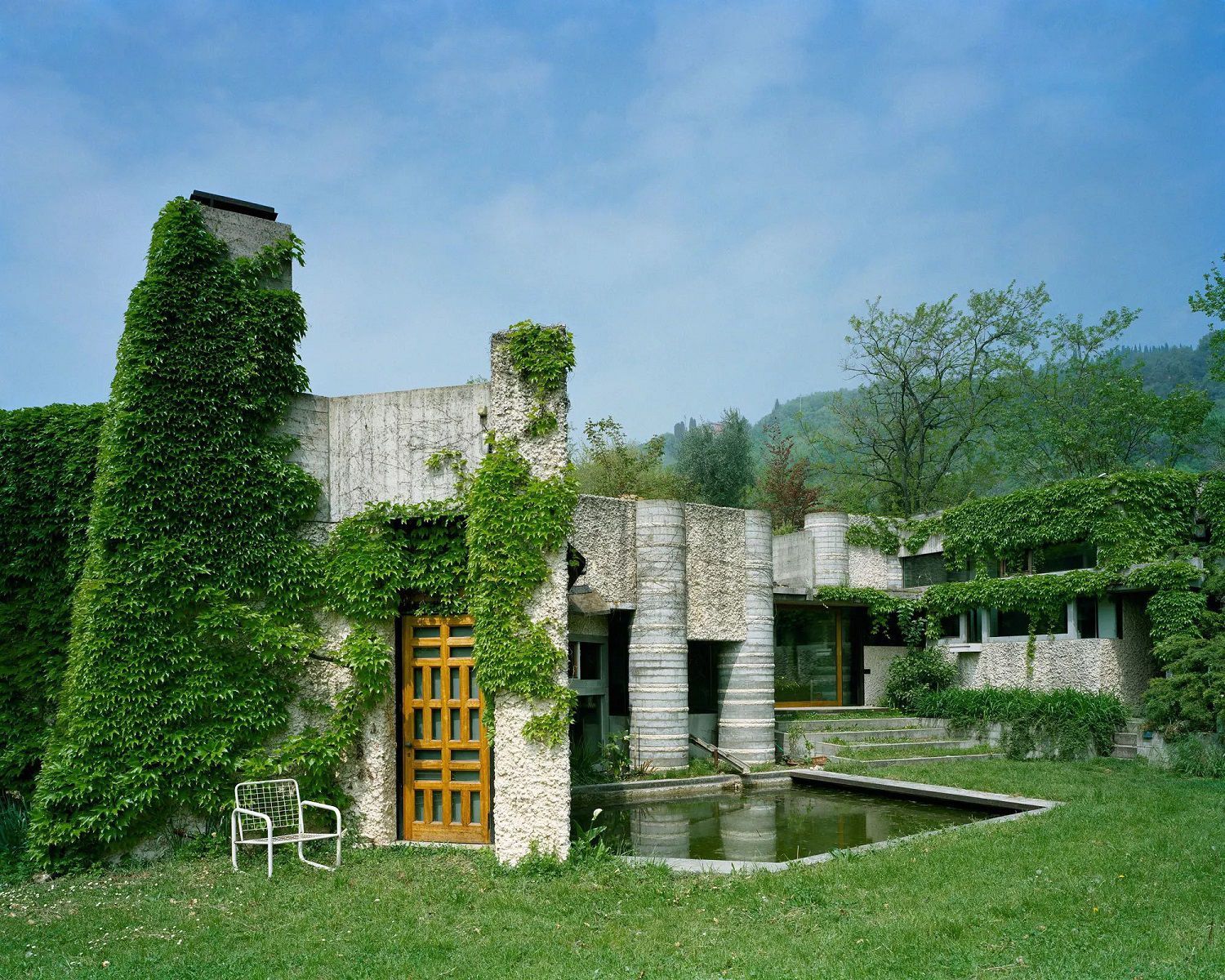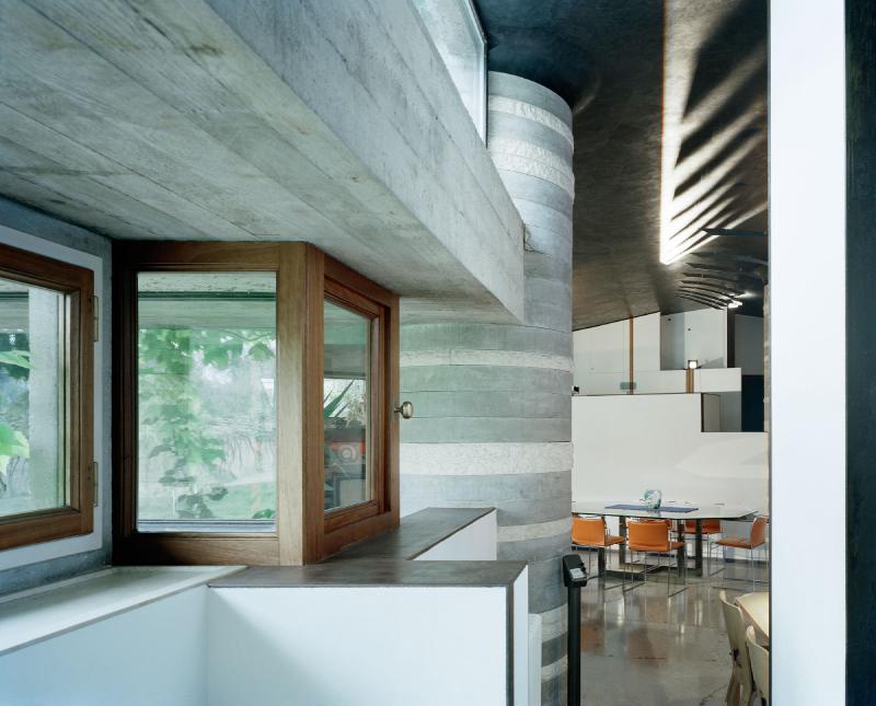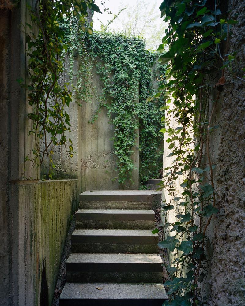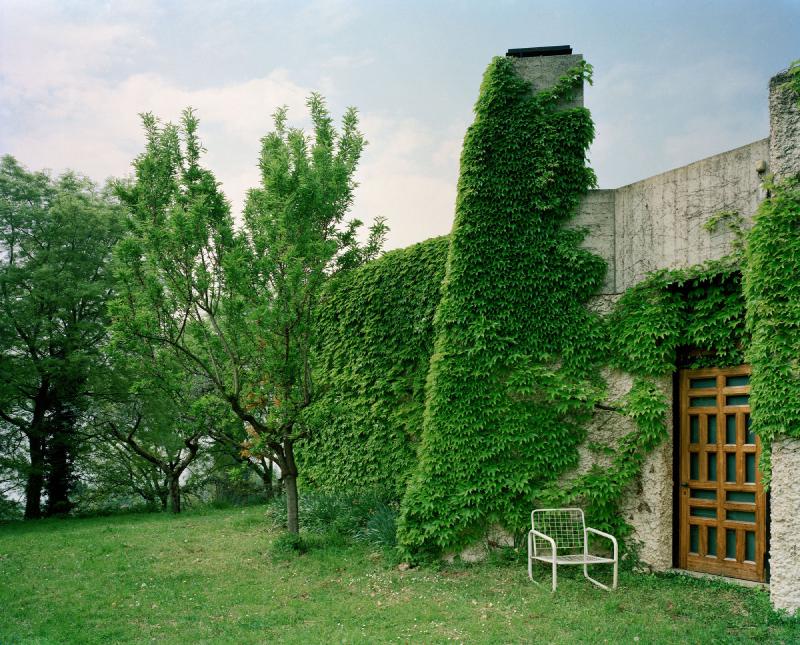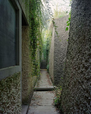 The entrance facade, facing Lake Garda, the visitor is presented as the only apparent front of the house, consisting of concrete walls juxtaposed with irregular openings and a small glimpse of the thick columns that dictate most of the design.