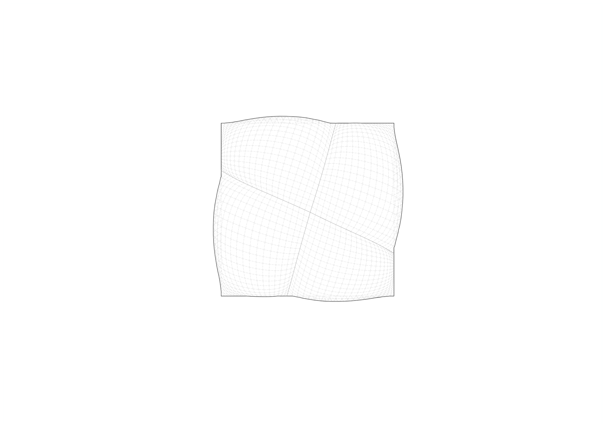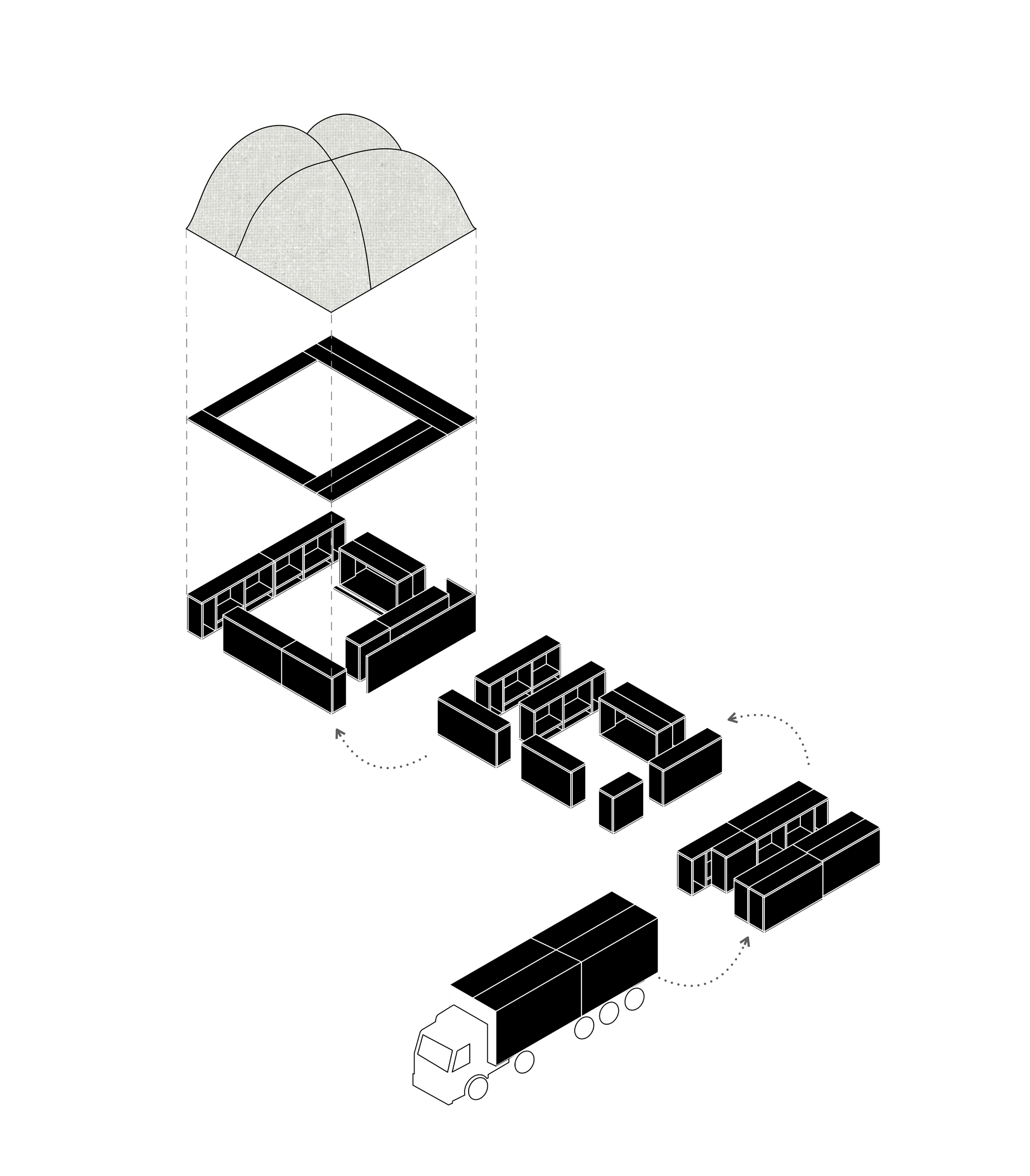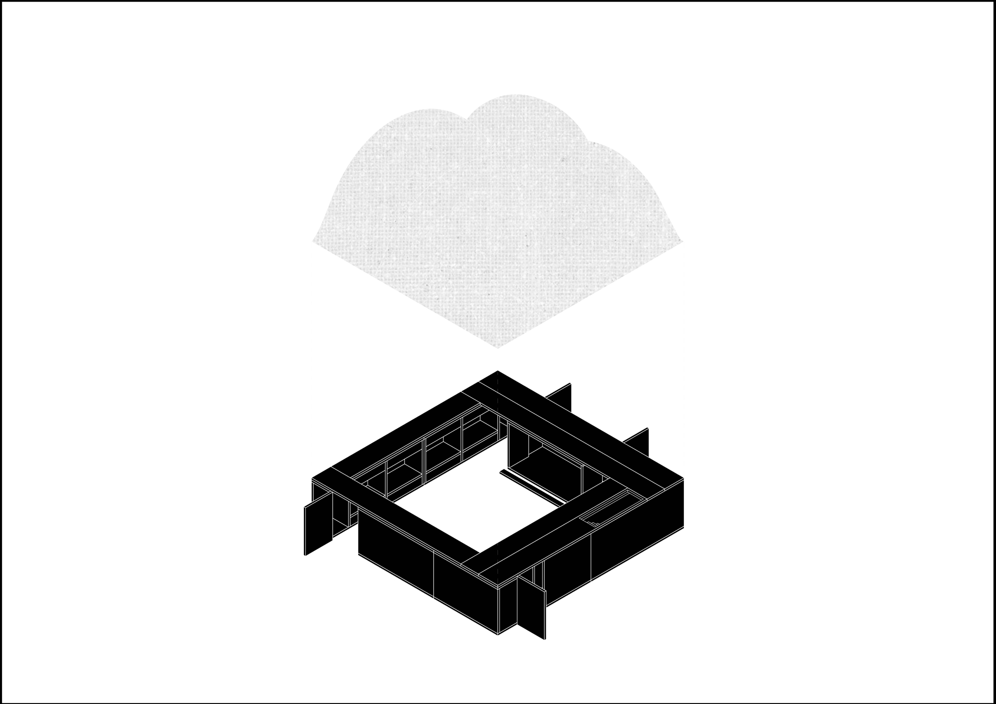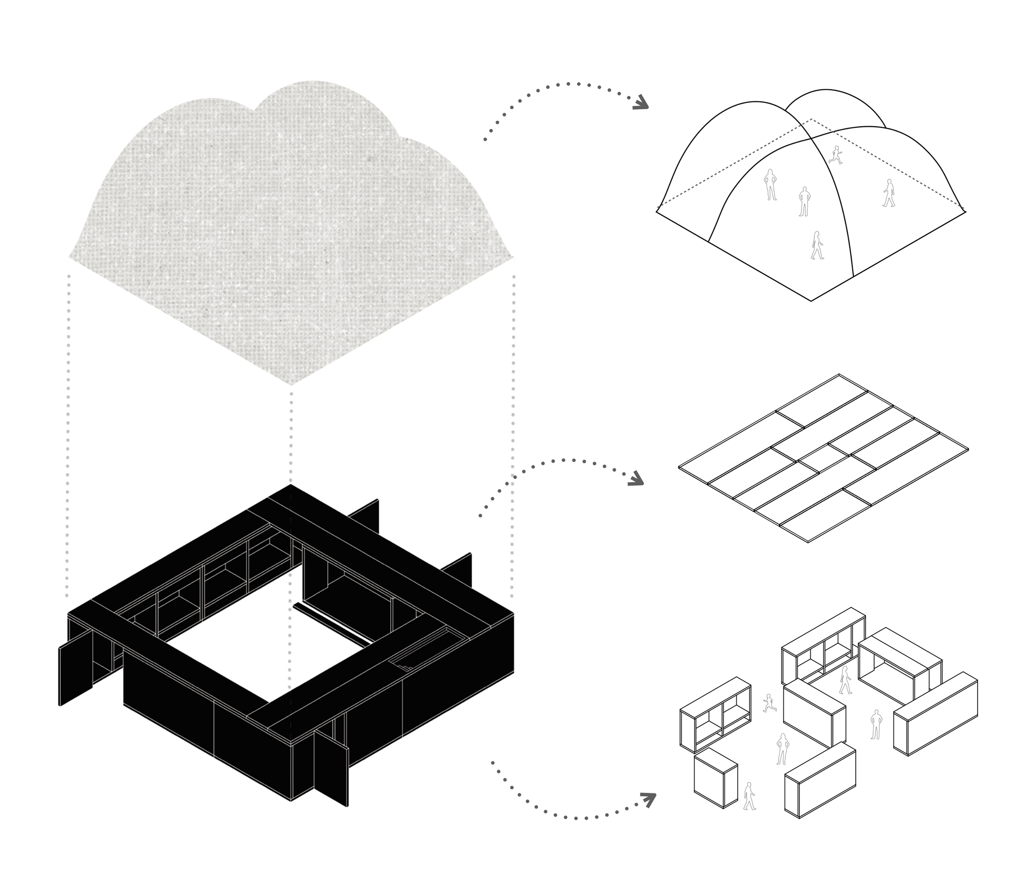 Con una planta cuadrada de 12,0 metros de lado, el pabellón construye un espacio interior de 8,0 metros de lado. Su perímetro que construido por unos módulos de CLT, que vendrás montados tridimensionalmente, reduciendo la puesta en obra exclusivamente al ajuste y atado de los mismos entre si. En la unión entre diferentes módulos se disponen las puertas de acceso al pabellón, un total de 4. Los módulos presentan una fachada continua, que ha sido tratada con un tratamiento de quemado superficial, previo a su instalación, para reforzar la protección natural de la madera frente a la intemperie. Al interior, en tres de los frentes los módulos se presentan como “armarios estantería” que albergarán las exposiciones permanentes del pabellón. En el lado orientado a la plaza, la configuración cambia para generar un espacio que será ocupado por los ponentes en caso de conferencia, clase o charla. En la pared norte se coloca además una escalera de acceso restringido para realizar las labores de mantenimiento necesarias de la cubierta hinchable.