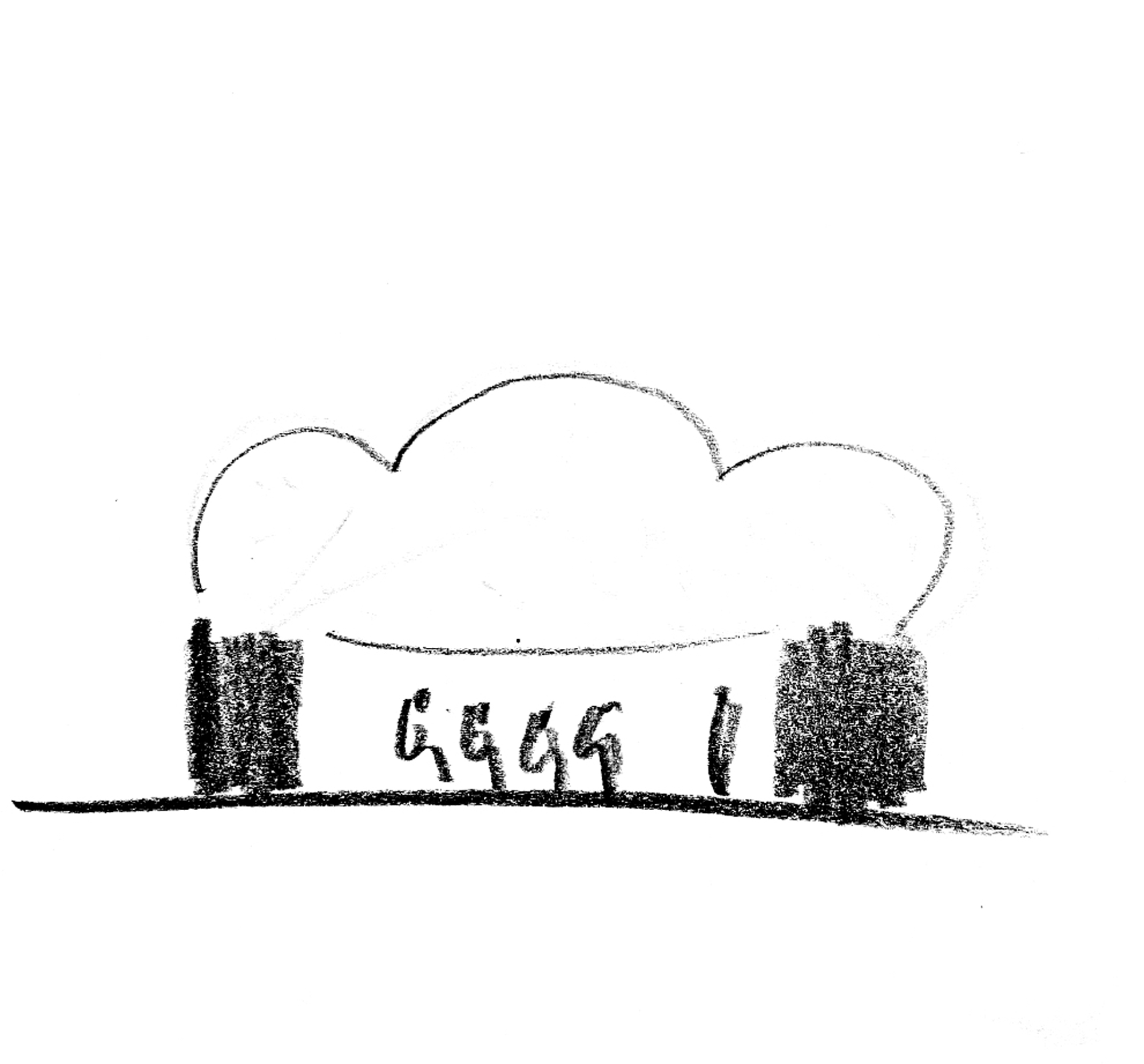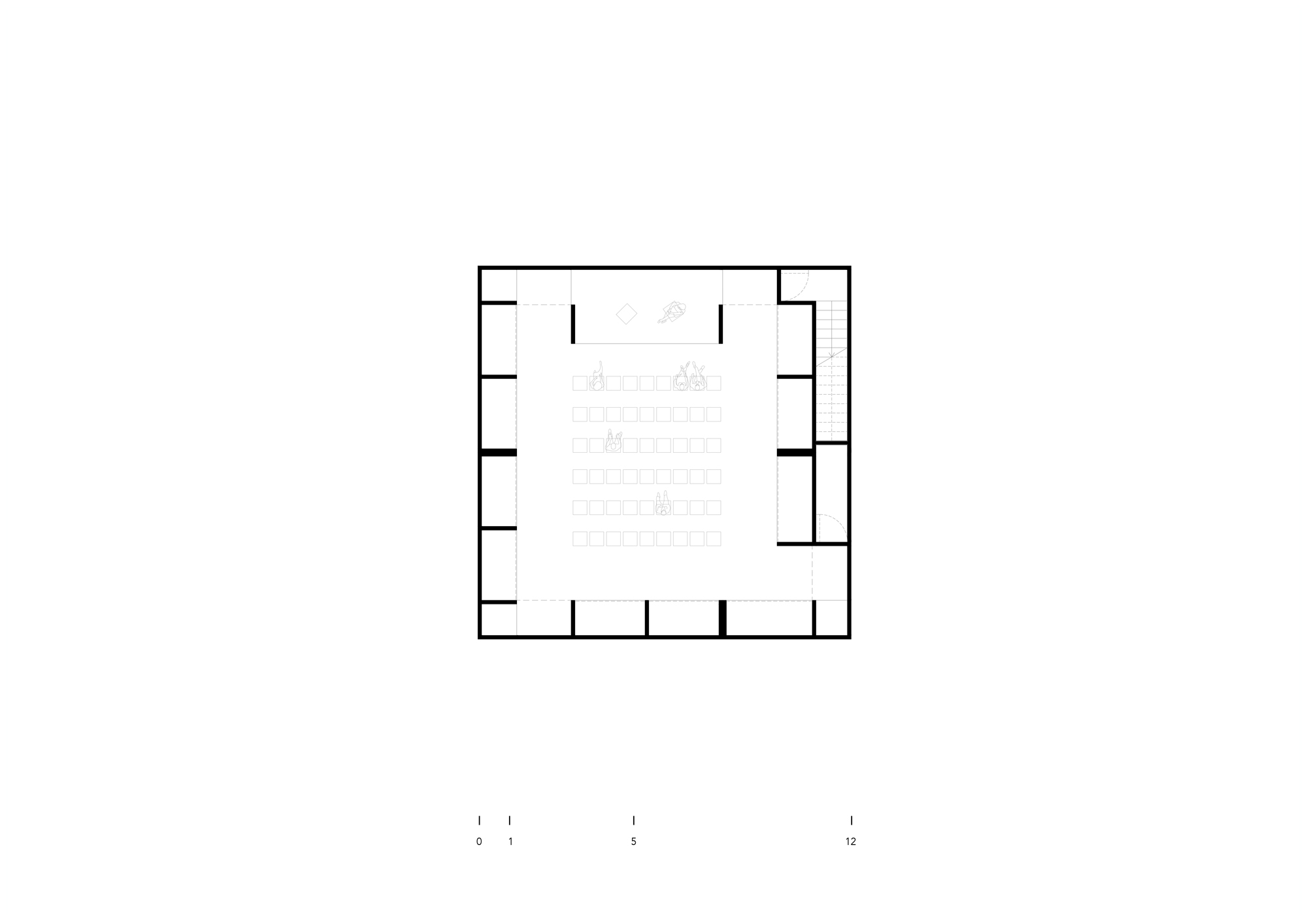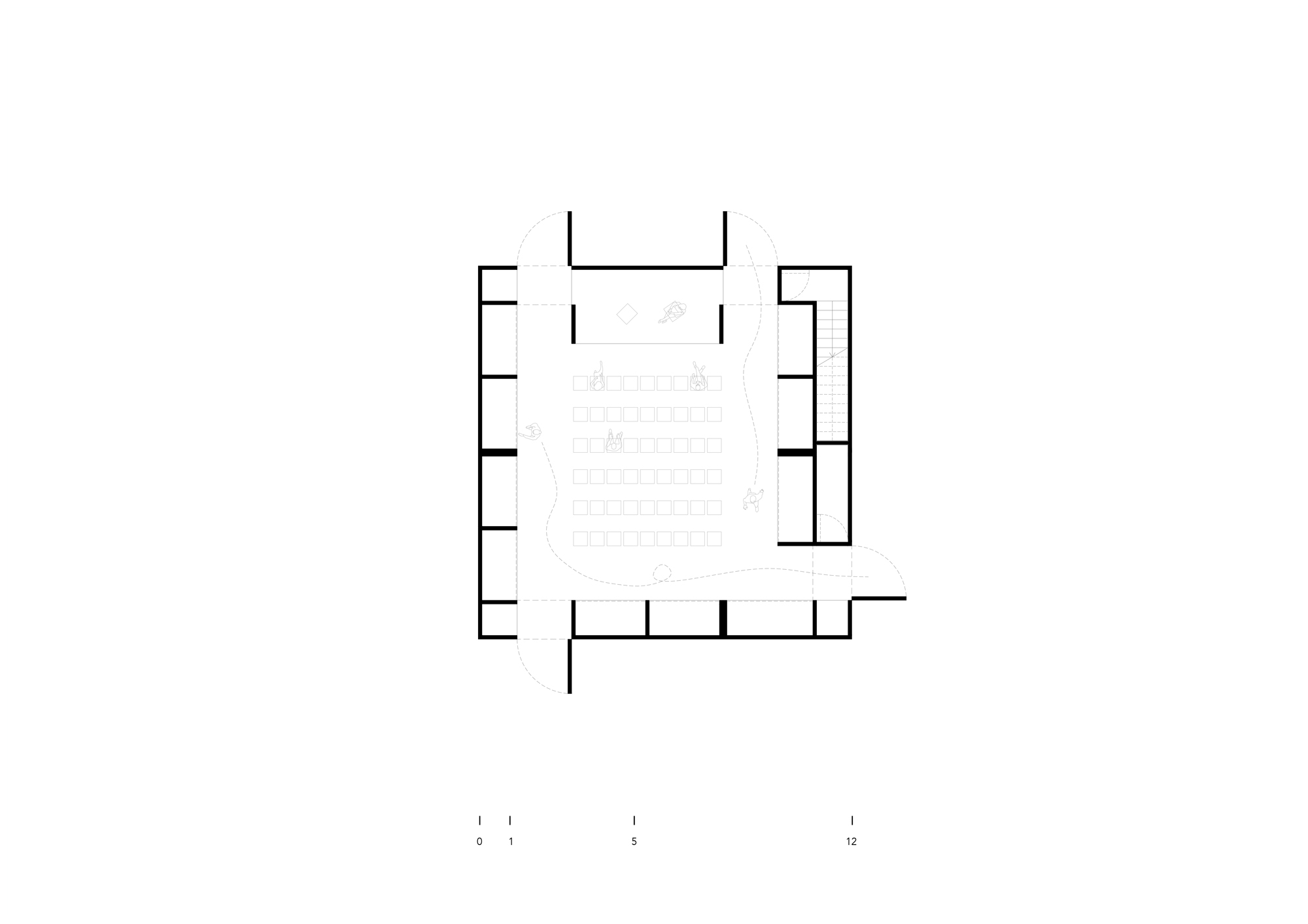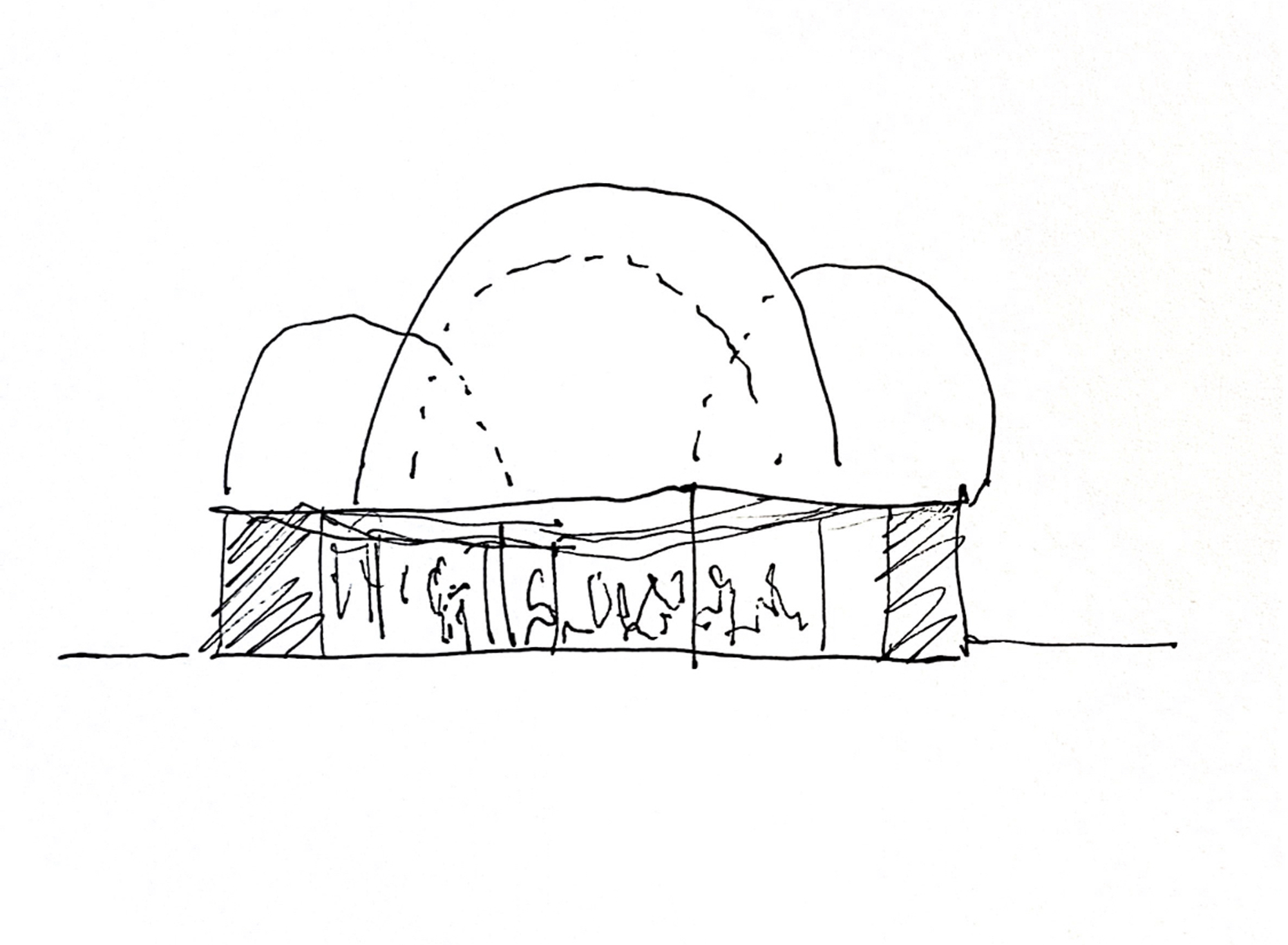 Con una planta cuadrada de 12,0 metros de lado, el pabellón construye un espacio interior de 8,0 metros de lado. Su perímetro que construido por unos módulos de CLT, que vendrás montados tridimensionalmente, reduciendo la puesta en obra exclusivamente al ajuste y atado de los mismos entre si. En la unión entre diferentes módulos se disponen las puertas de acceso al pabellón, un total de 4. Los módulos presentan una fachada continua, que ha sido tratada con un tratamiento de quemado superficial, previo a su instalación, para reforzar la protección natural de la madera frente a la intemperie. Al interior, en tres de los frentes los módulos se presentan como “armarios estantería” que albergarán las exposiciones permanentes del pabellón. En el lado orientado a la plaza, la configuración cambia para generar un espacio que será ocupado por los ponentes en caso de conferencia, clase o charla. En la pared norte se coloca además una escalera de acceso restringido para realizar las labores de mantenimiento necesarias de la cubierta hinchable.