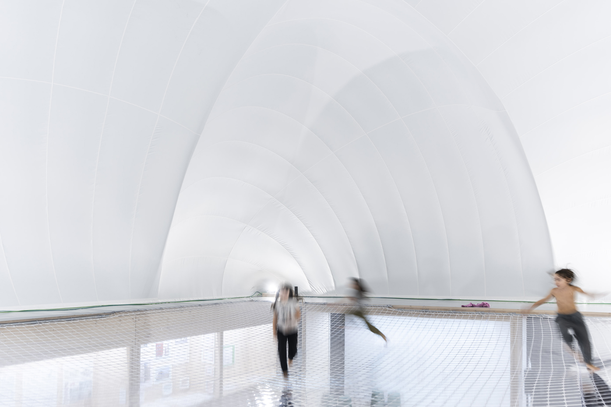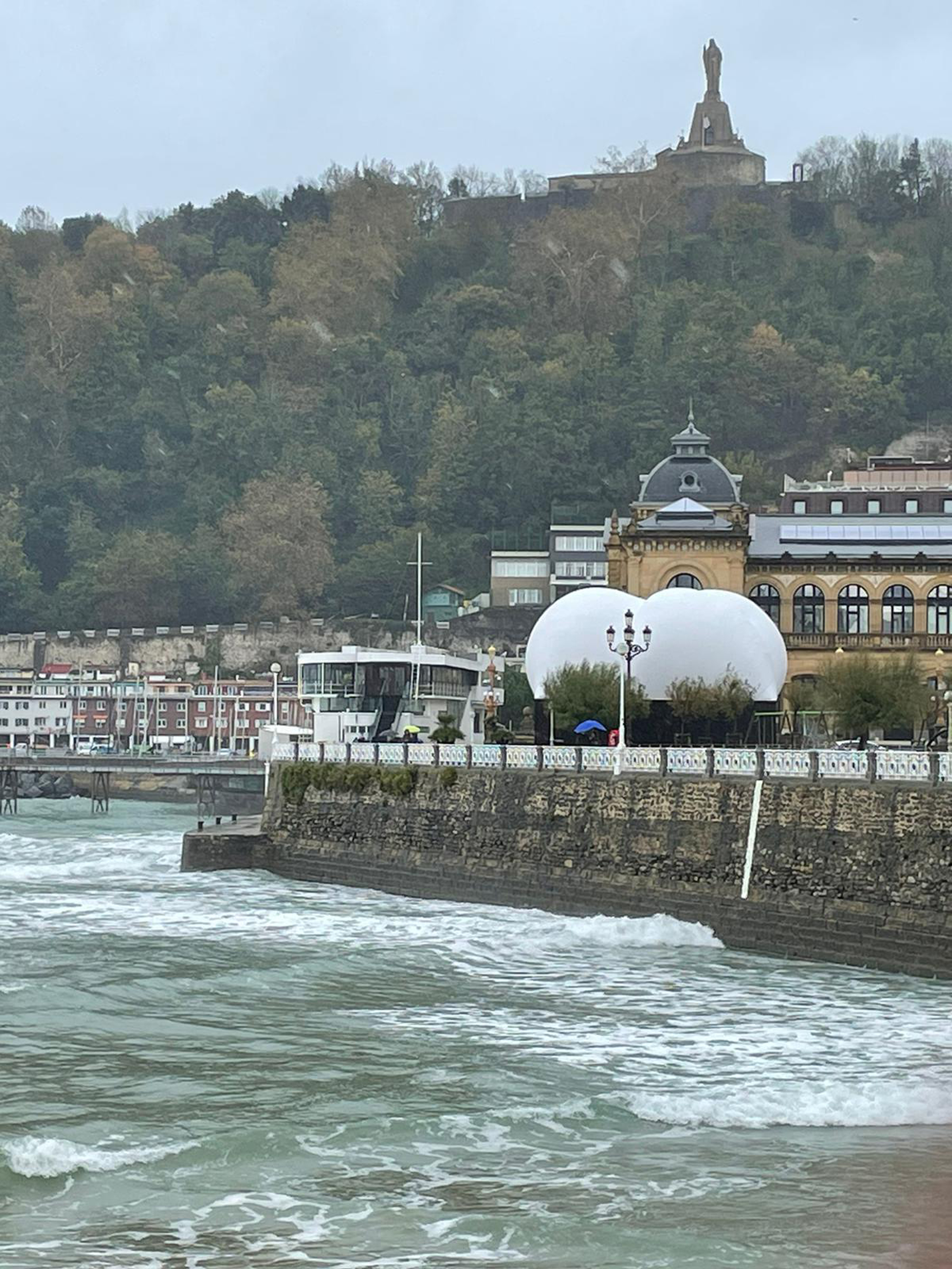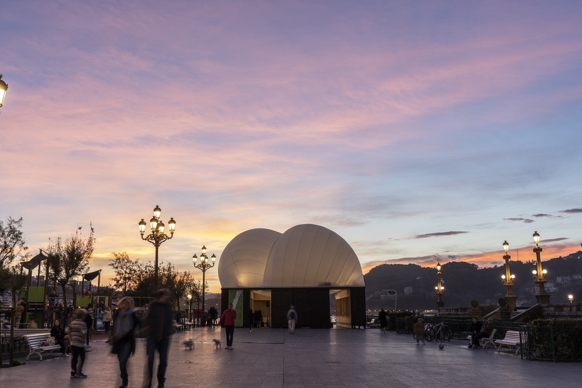 El pabellón se sitúa en el extremo norte de los jardines de Alderdi Eder, en un espacio comprendido entre la terraza del edificio del Ayuntamiento, el paseo de borde de la concha, y el espacio destinado a juegos infantiles, en la cercanía del Real Club Náutico de Aizpurua y Labayen. Se trata de un pabellón efímero, por lo tanto de fácil montaje y desmontaje, que de forma resumida tiene dos cuerpos. Uno cuadrado de 12,0 metros de lado, apoyado en el suelo, construido mediante módulos tipo “armario” de CLT de 120 mms, que construyen un recinto interior de 8,0 metros de lado. Este primer cuerpo queda cubierto por un hinchable que es el elemento más visible de la construcción. Una cubierta hinchada que protege el interior del viento y la lluvia, y al mismo tiempo se convierte en una especie de faro en el contexto de la Bahía de la Concha.