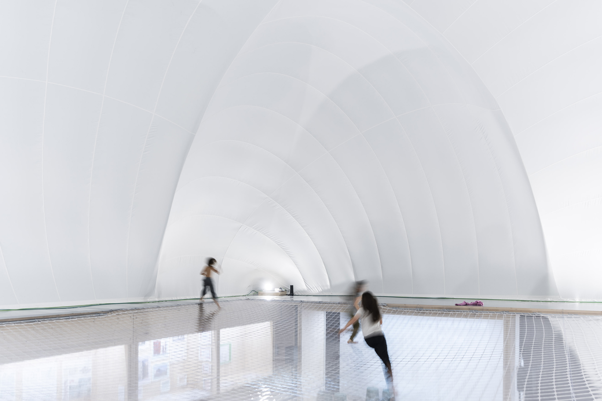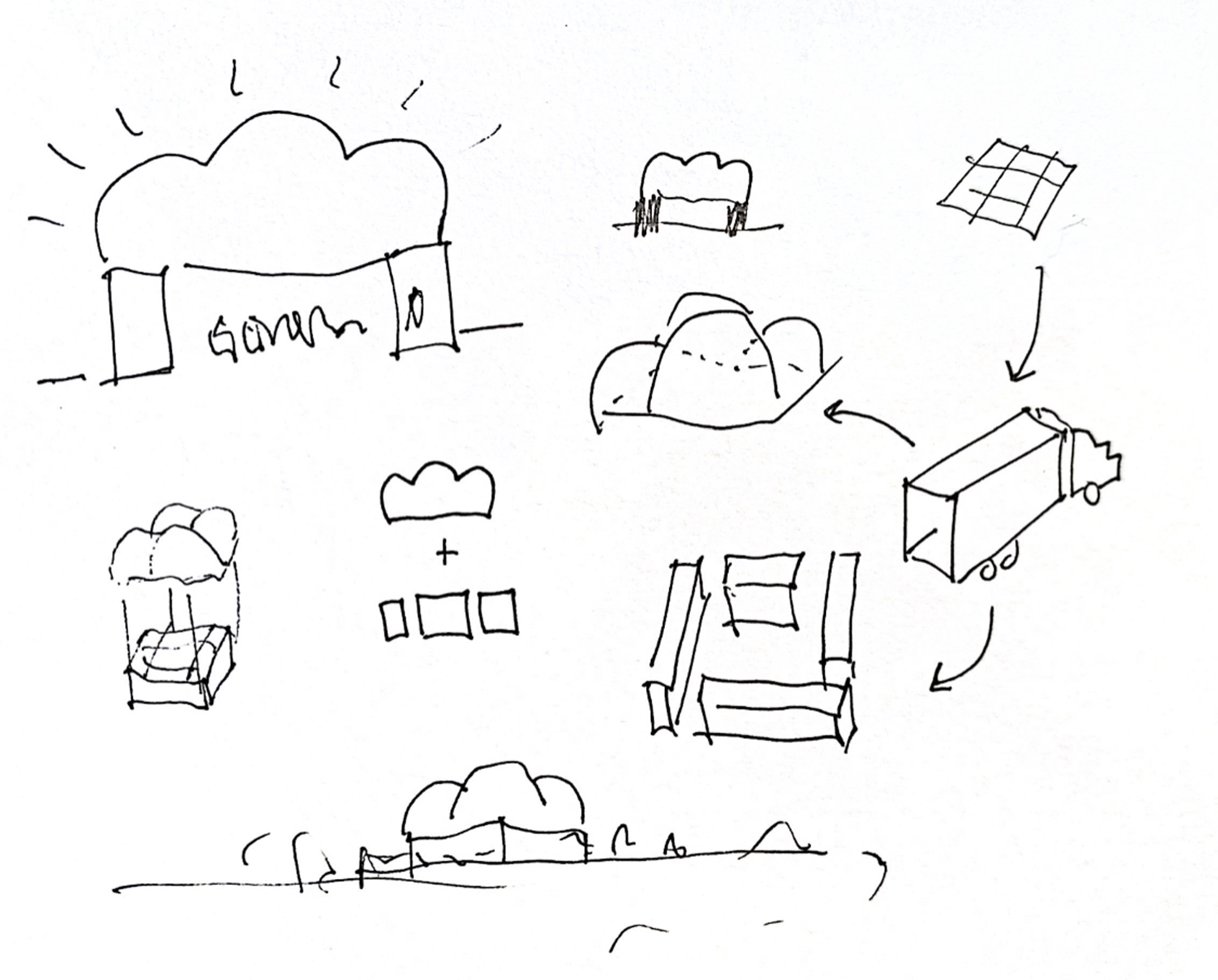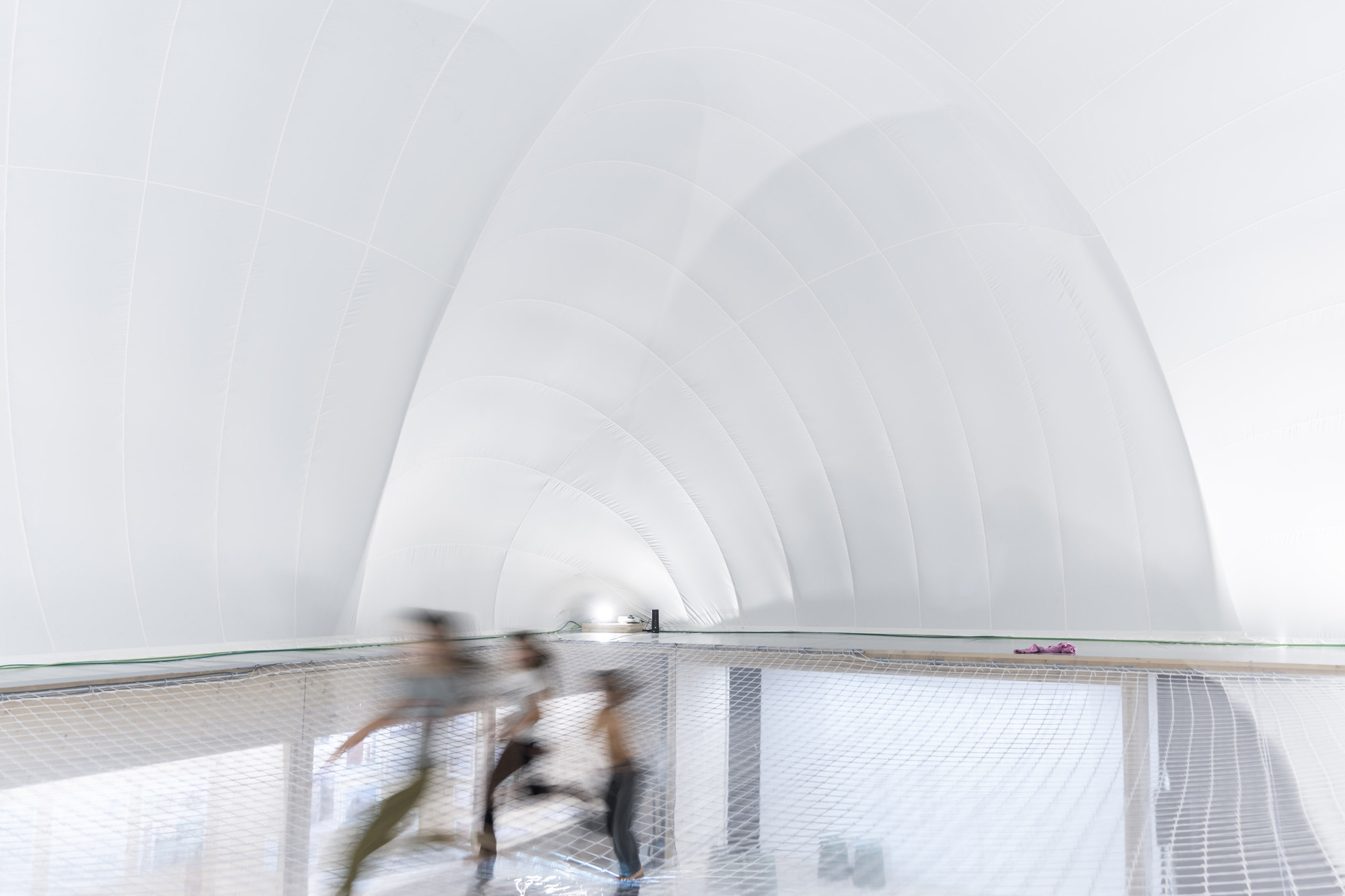 El pabellón se sitúa en el extremo norte de los jardines de Alderdi Eder, en un espacio comprendido entre la terraza del edificio del Ayuntamiento, el paseo de borde de la concha, y el espacio destinado a juegos infantiles, en la cercanía del Real Club Náutico de Aizpurua y Labayen. Se trata de un pabellón efímero, por lo tanto de fácil montaje y desmontaje, que de forma resumida tiene dos cuerpos. Uno cuadrado de 12,0 metros de lado, apoyado en el suelo, construido mediante módulos tipo “armario” de CLT de 120 mms, que construyen un recinto interior de 8,0 metros de lado. Este primer cuerpo queda cubierto por un hinchable que es el elemento más visible de la construcción. Una cubierta hinchada que protege el interior del viento y la lluvia, y al mismo tiempo se convierte en una especie de faro en el contexto de la Bahía de la Concha.