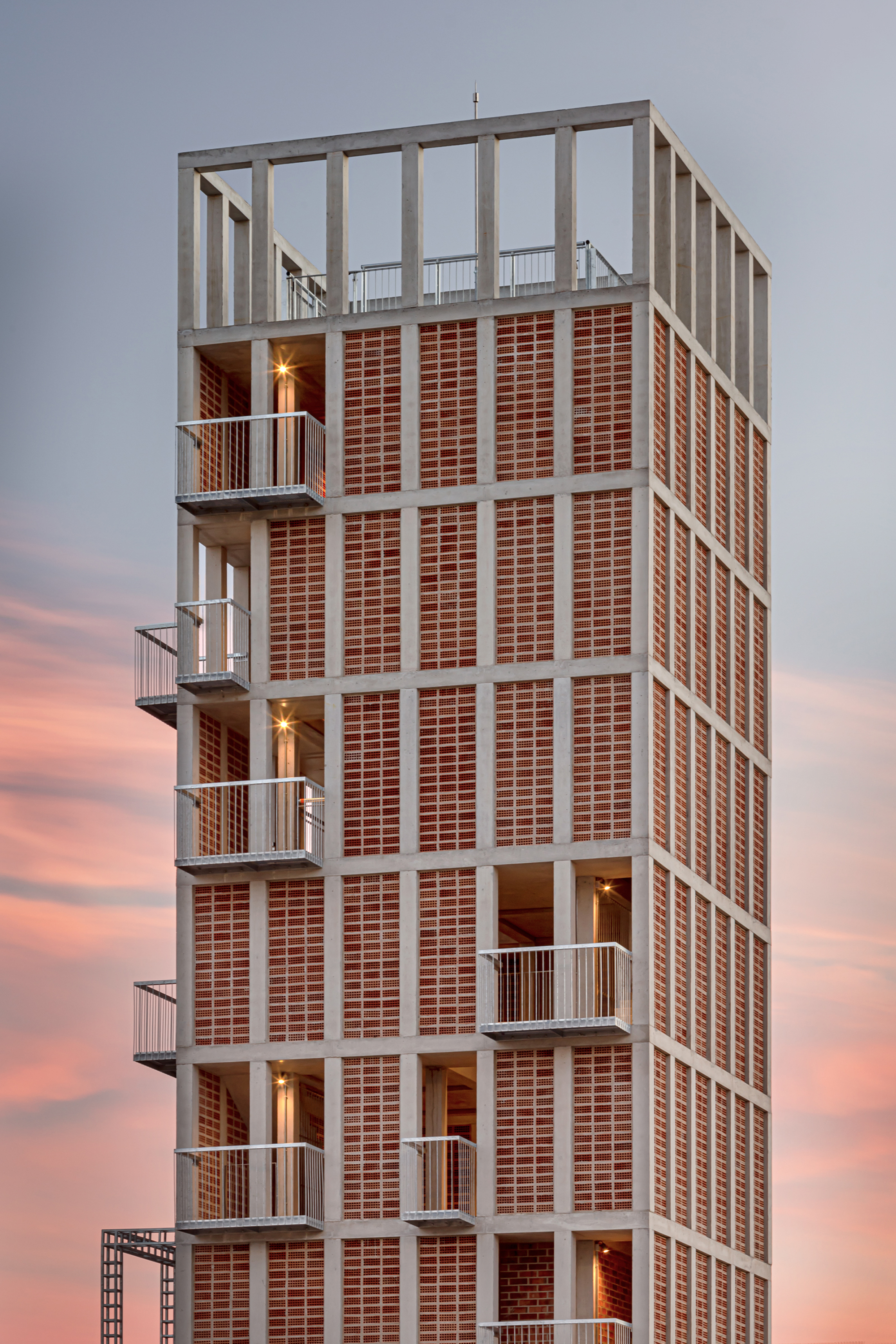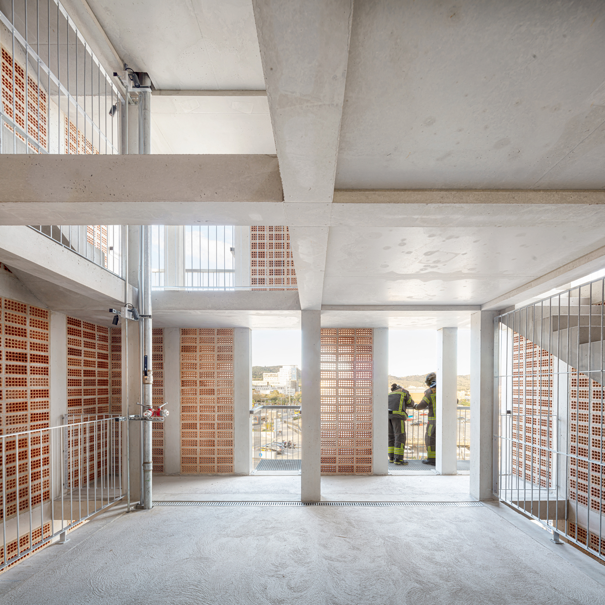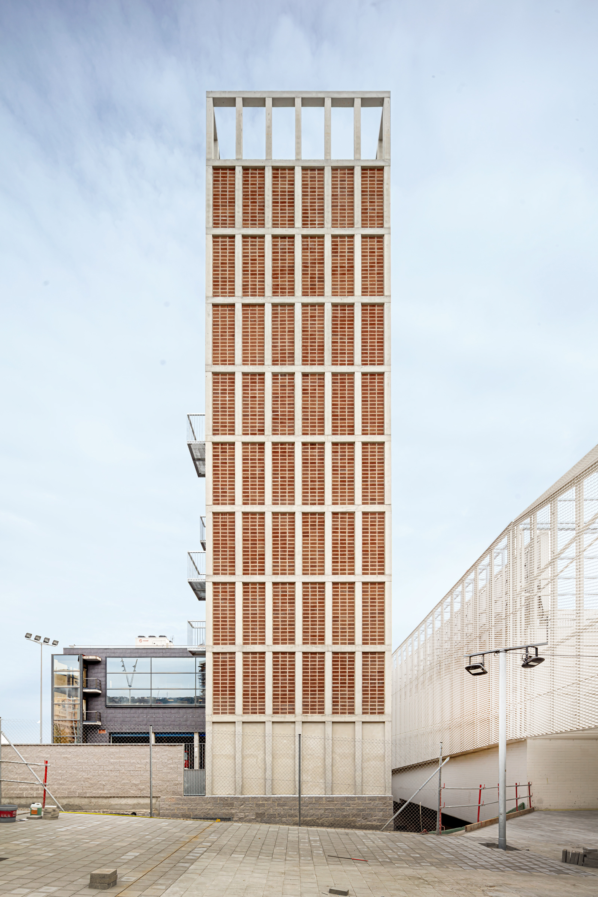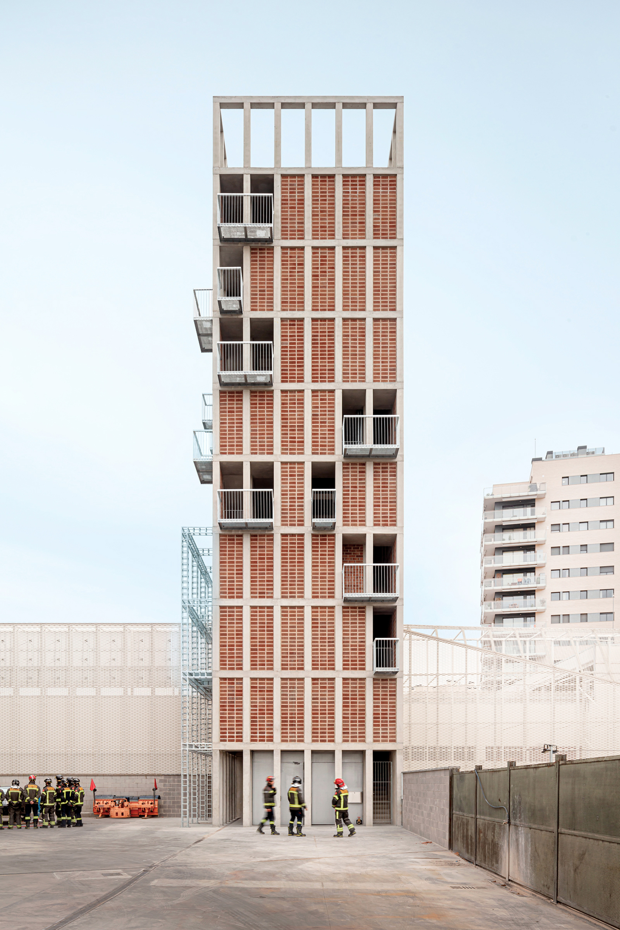 The structure is configured by a central core formed by 8 concrete pillars measuring 25 x 25 cm, intertwined by girders of the same depth in the shape of a cross, and a second level of 24 pillars on the façade that guarantee the resistance to the horizontal thrust required to rappelling practices. The new tower will extend the fire station’s existing structure by executing a transition slab that coincides with the roof of the maneuvering yard. The envelope is configured as a perimeter circulation space that gives access to all the elements of the façade and that, in turn, allows the different levels to be connected without interfering with the activities that can be carried out inside, promoting a great simultaneity of the practices. The exterior enclosure is designed from the modulation of the 28 x 12 x 18cm extruded ceramic piece, avoiding cuts and losses, placed with the holes seen to form a large lattice. Ceramic has good inertial behavior and low conductivity, helping to regulate the interior temperature, especially in the summer months when the outside temperature can exceed 35º. Finally, some light metal elements are added that make up the cantilevered balconies as well as slabs, stairs and interior railings. These elements are prefabricated in the workshop to speed up placement and allow for future modifications.