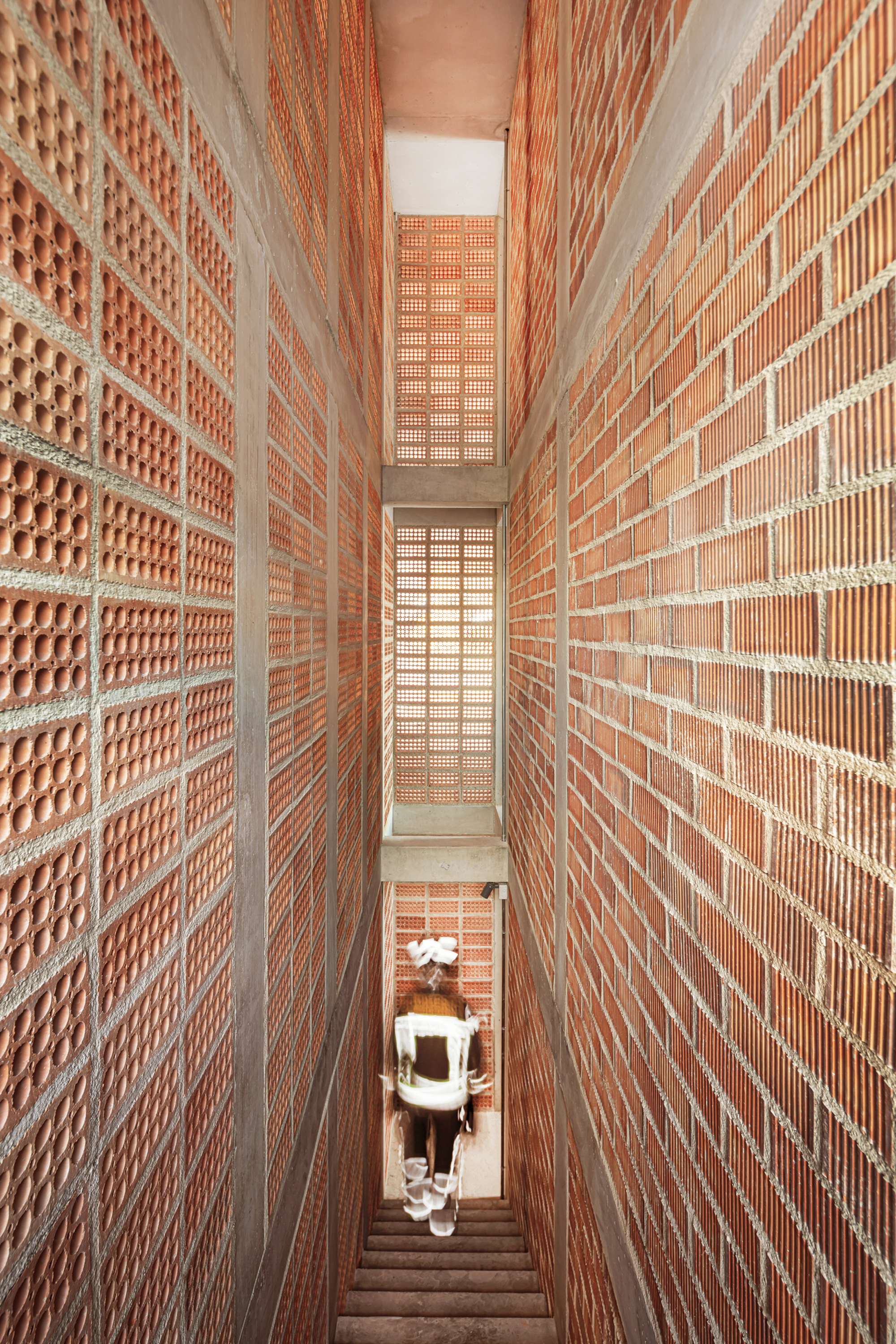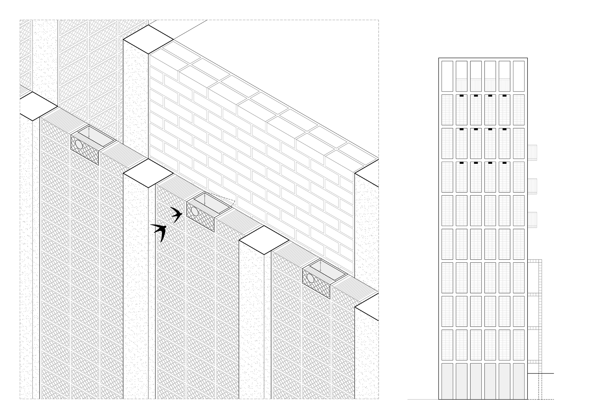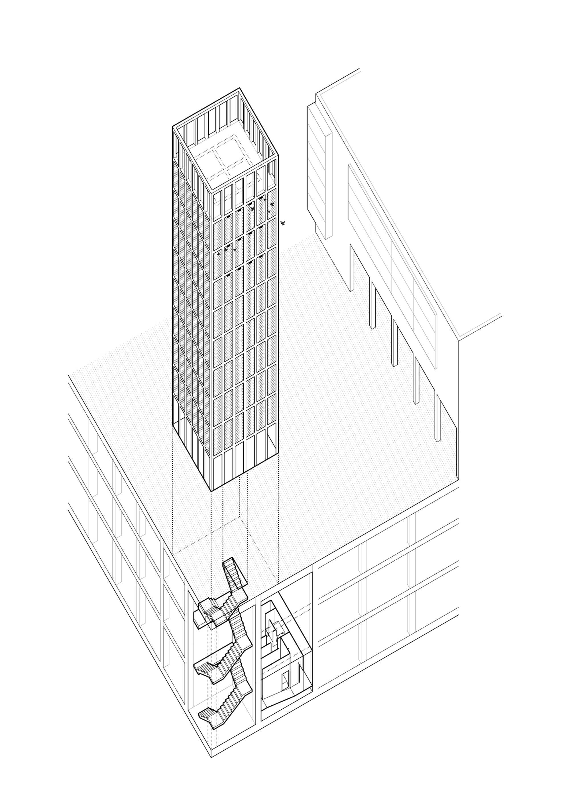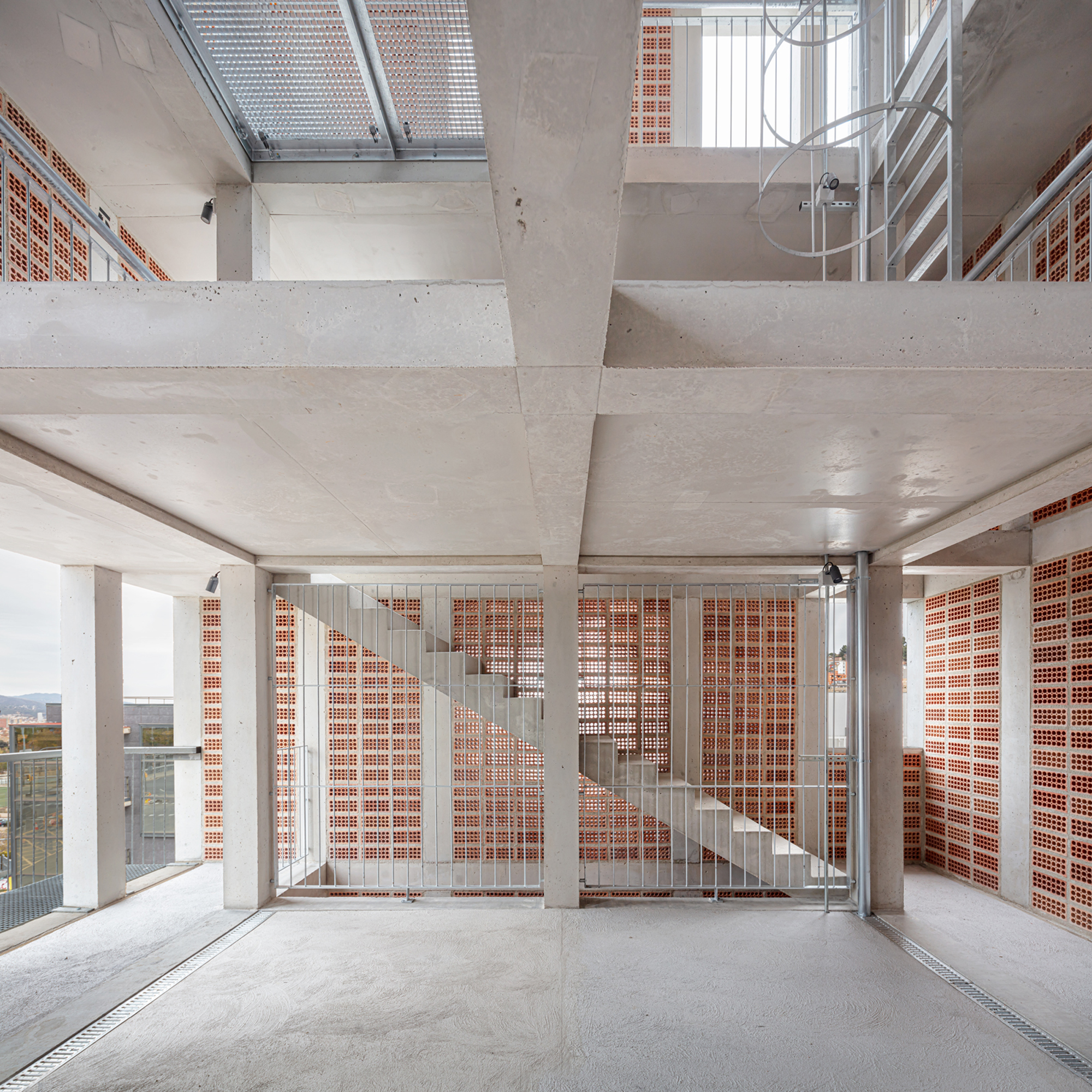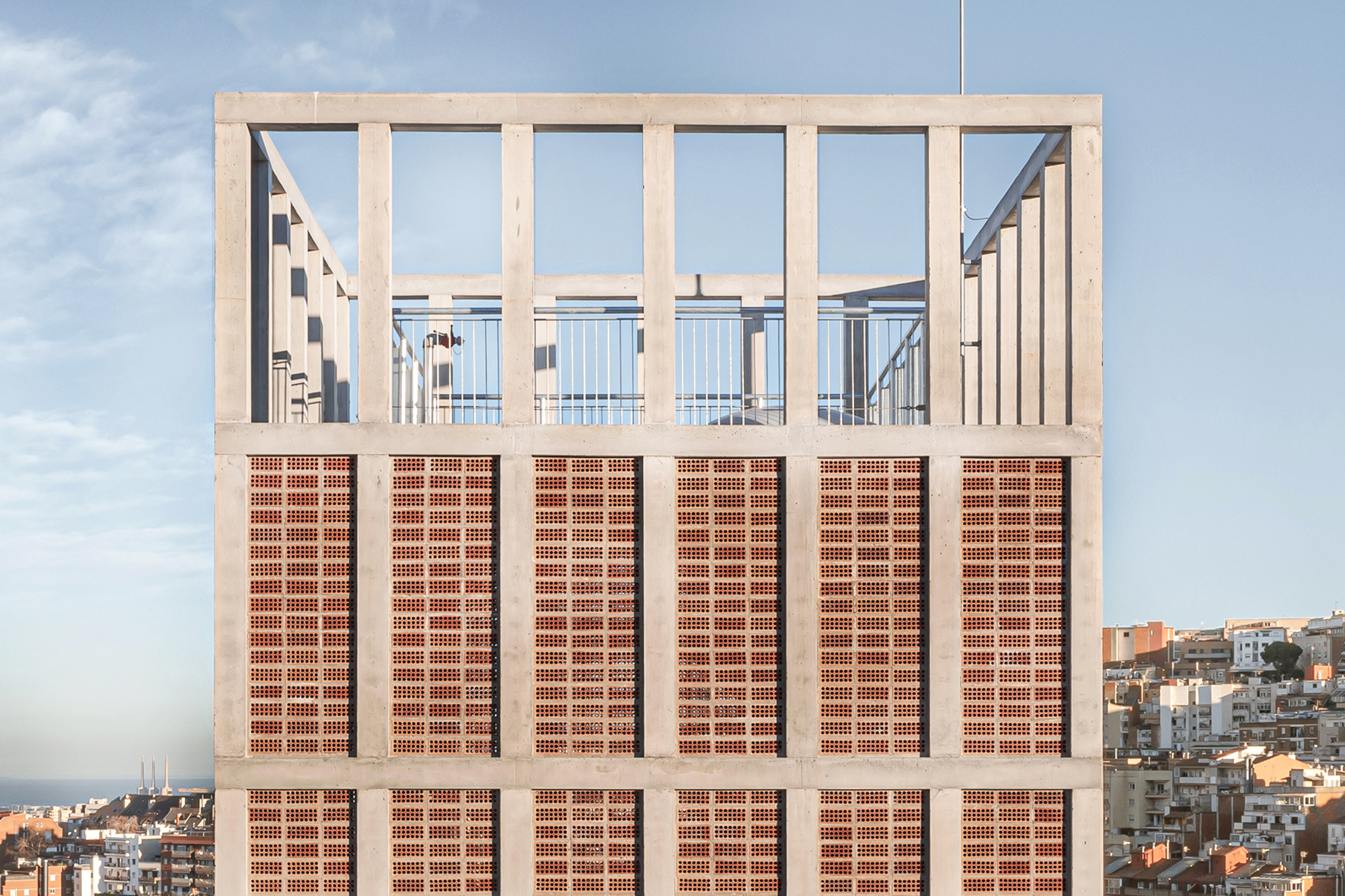 Beyond allowing the development of the planned program, the tower acts as a climatic refuge for people and birds. The façade lattice, made up of very deep ceramic pieces, guarantees permanent ventilation of the interior spaces and allows a reduction in the outside temperature without the use of any artificial air conditioning system. Likewise, 12 swift nests are included in one of the façades in order to promote biodiversity and provide shelter to a species of bird that frequents the Collserola mountain range. In this sense, the project is presented as an infrastructure that will last over time, even beyond its current use. The interior compartmentalization and enclosures allow changes to accommodate other programs and prolong the useful life of the tower, which can also be understood as an urban observation point of the Horta-Guinardo district.
