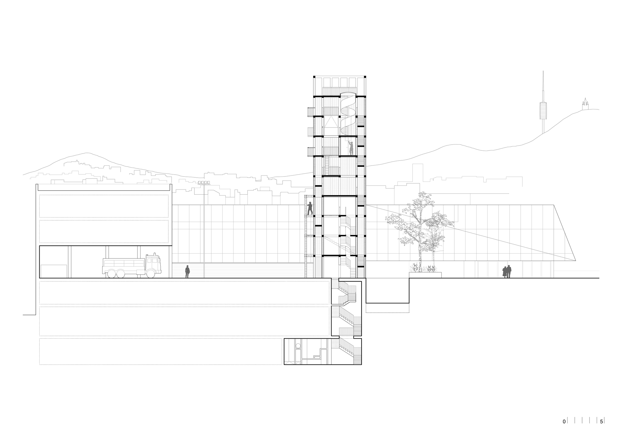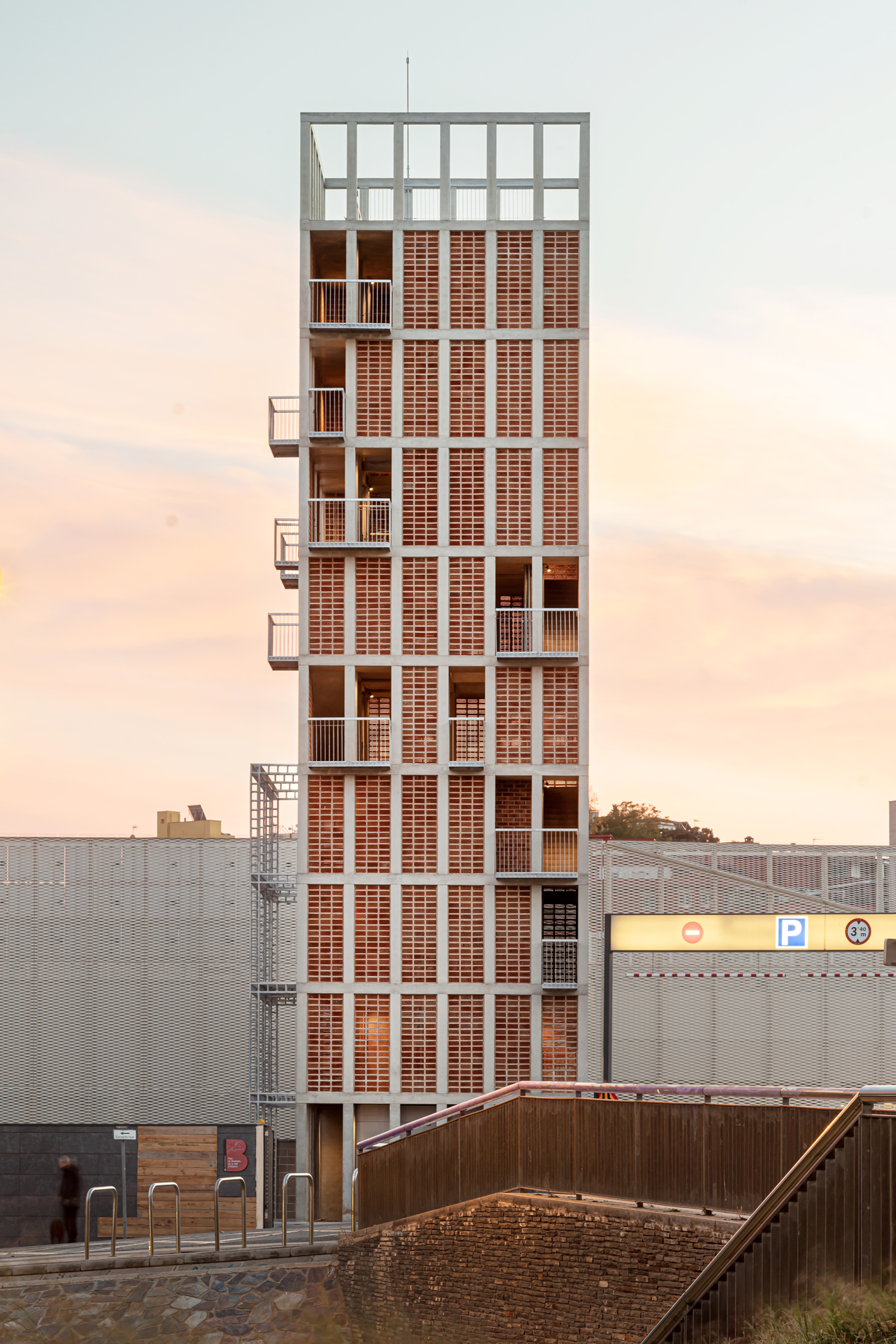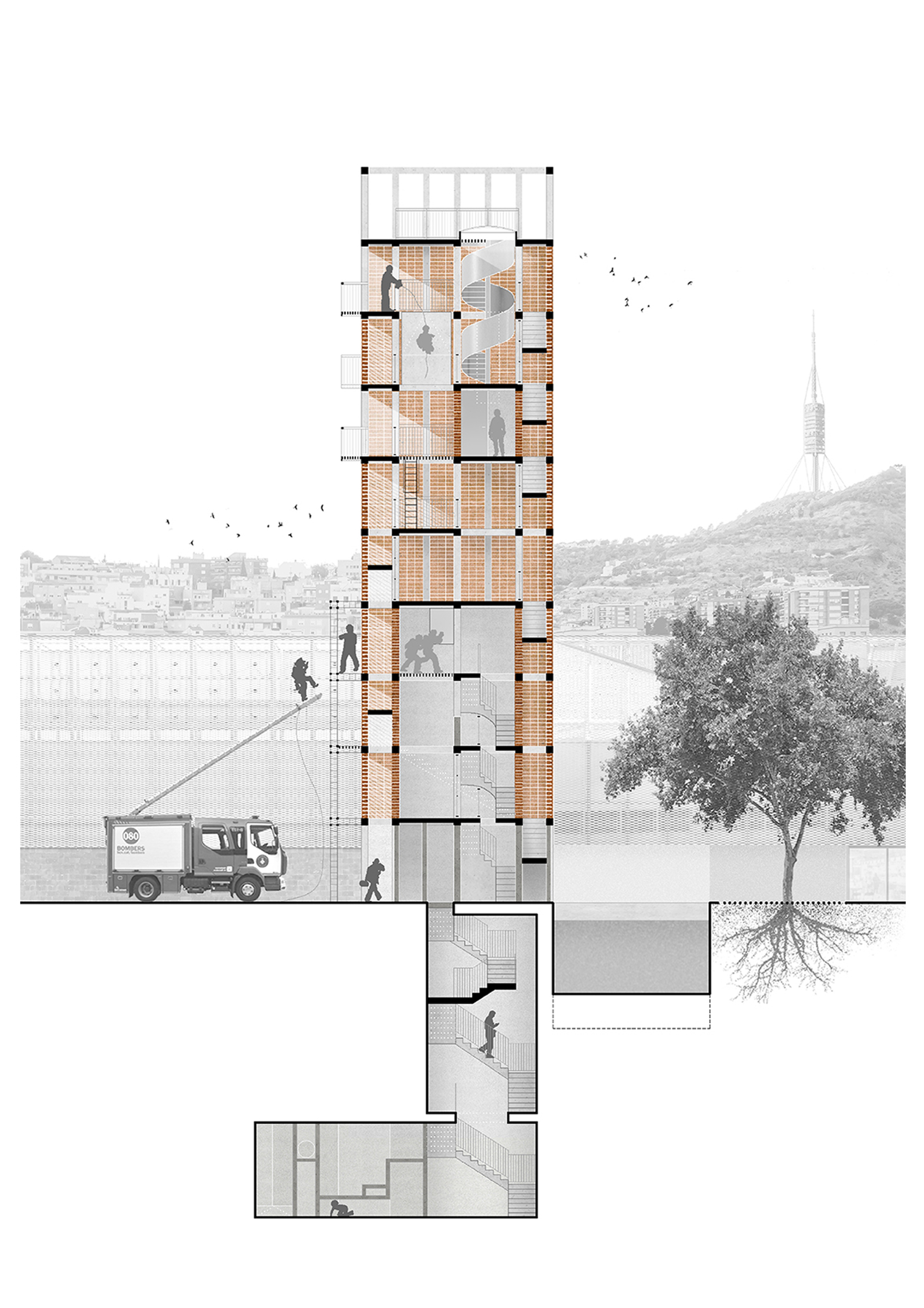The project for a fire training tower in the Vall d’Hebron posed the challenge of achieving the functional requirements of the activity while accepting the status of a highly visible element in the north of Barcelona. The configuration of the tower helps to link a complex environment made up of different isolated pieces: on the one hand, the vertical structured structure is morphologically related to the fire station and the food market, while its materiality connects landscapely with the neighborhoods of Sant Genís and Carmel thanks to the treatment of the exposed brick façade, which relates with the party walls and housing towers of the surroundings.