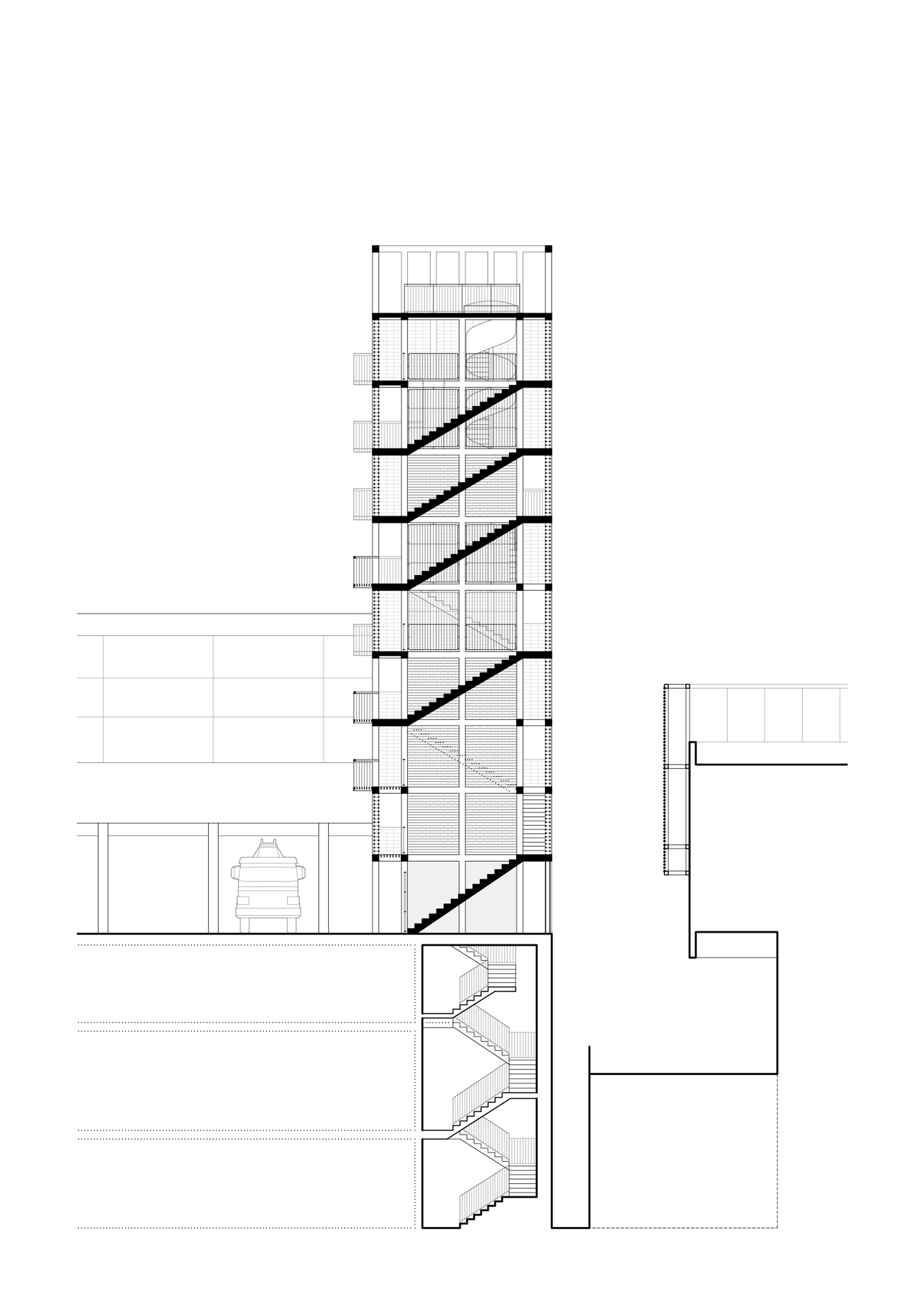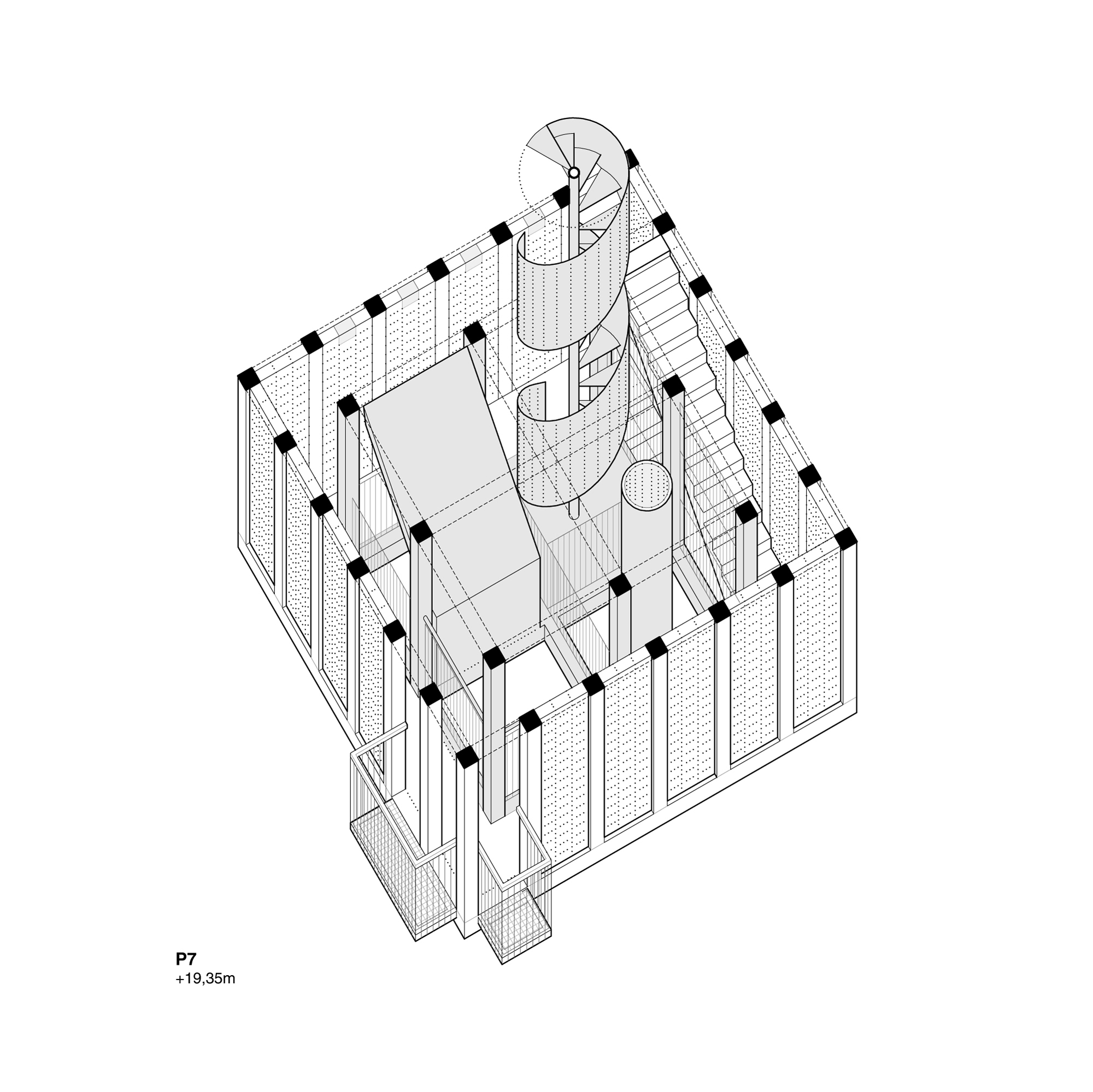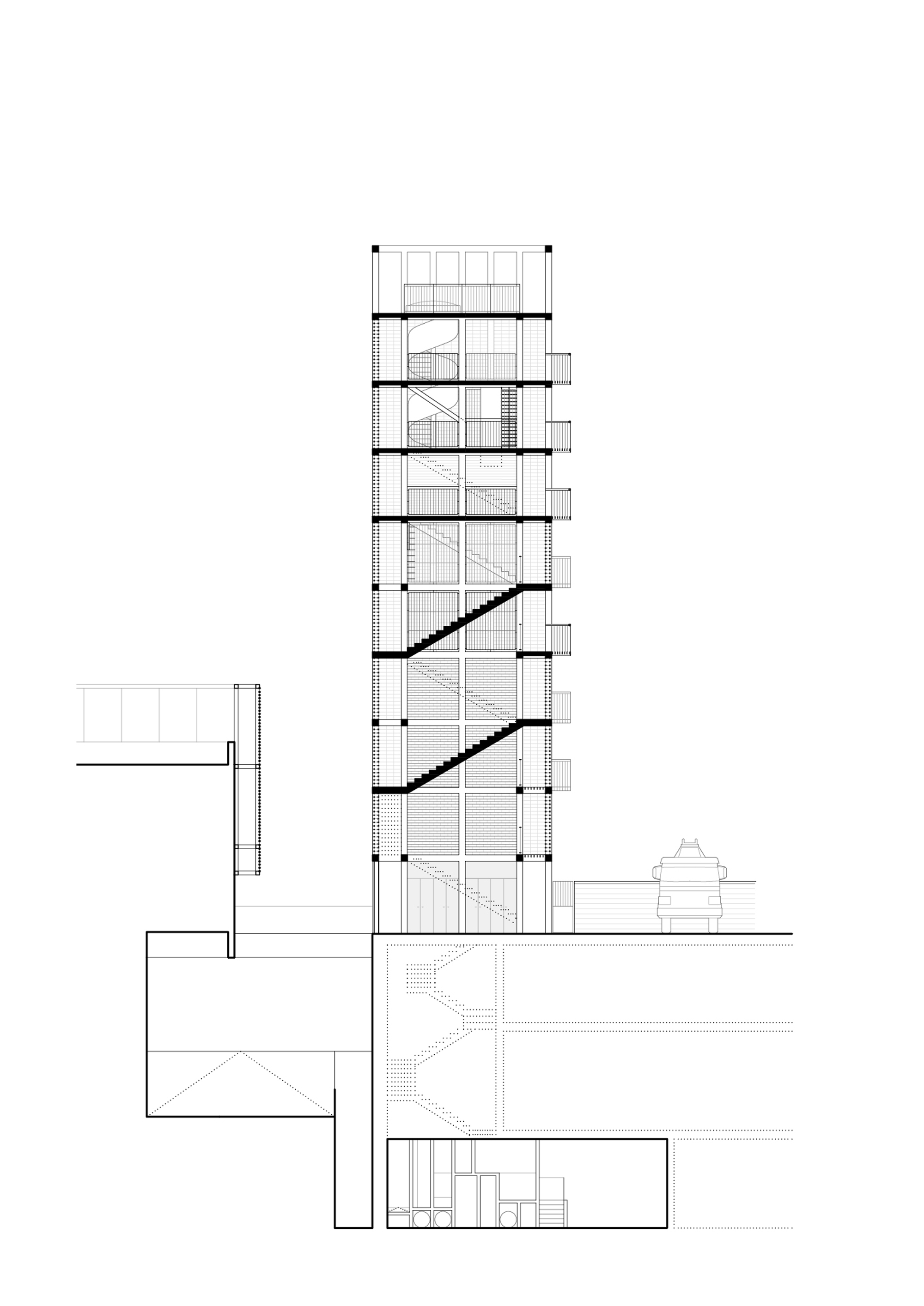 The tower is proposed as an open system that allows great flexibility and functional adaptation to accommodate current programmatic requirements and anticipate future changes in use. A 7.15 m square floor plan is proposed based on a grid of concrete pillars and girders that generate a three-dimensional mesh from which 4 empty spaces of 2 x 2 m are obtained on each floor in order to accommodate a multiplicity of spatial situations with maximum adaptability. to the program. The interior spaces recreate extreme building situations to allow firefighters to develop their practices (double and triple spaces, spiral staircases, cat ladders, wells, doors, windows, etc.) while on the outside there are balconies in different positions to enhance rappelling and vertical rescue practices.